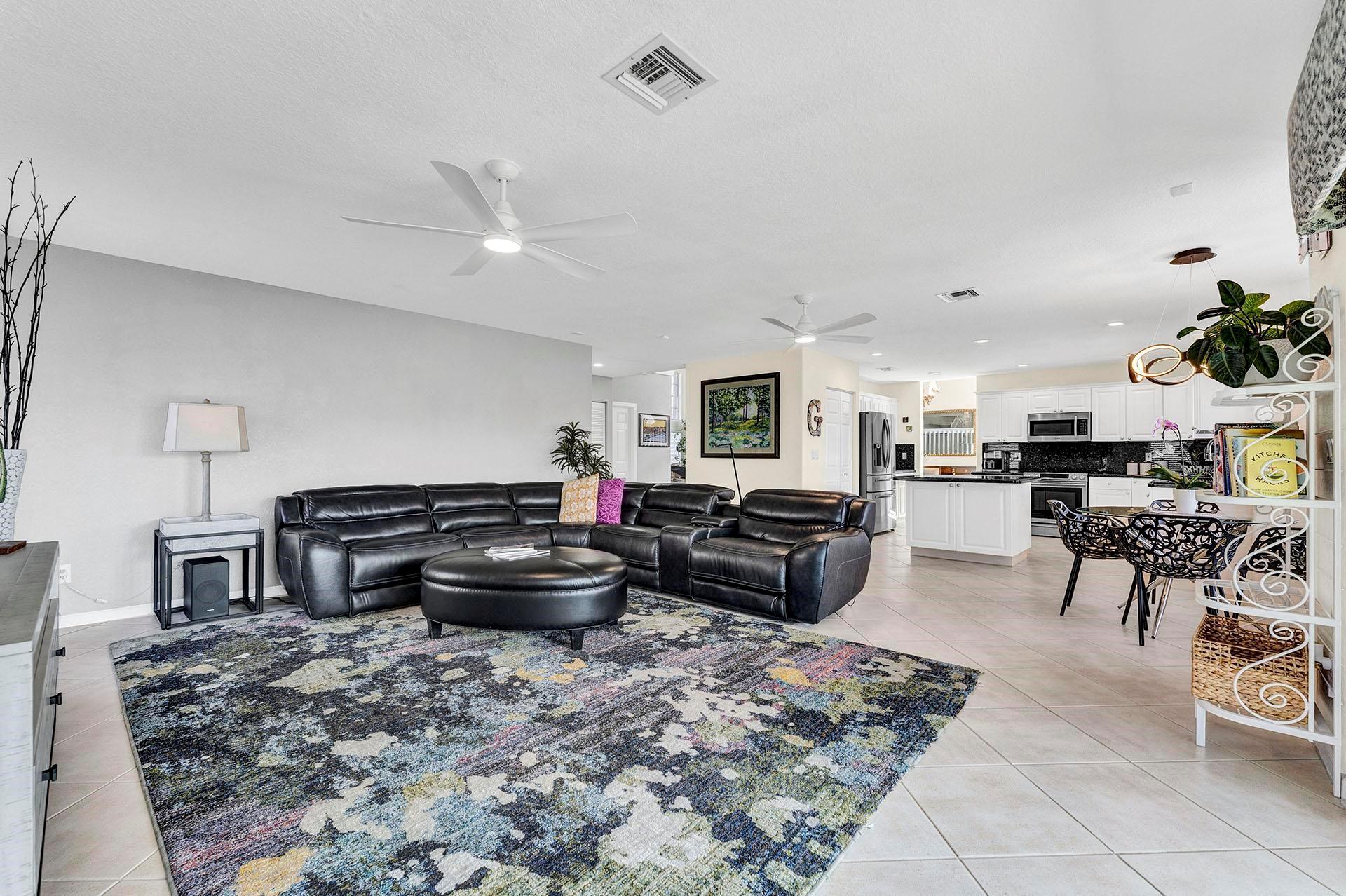 Enter this beautiful home & find high ceilings, ceramic tile floors throughout, & beautiful natural light! Large kitchen features granite counters, white cabinets, stainless steel appliances including 2023 refrigerator, & oversized pantry! Relax in this ideal backyard! Salt water pool (new pool pump) overlooks lake w no neighbors visible across. Avocado, papaya, mango, coconut & orange trees! Large covered patio! Fully fenced yard! Self watering bowl for furry friends! New irrigation pump & system uses water from lake! 1 bedroom 1 updated full bath on 1st floor. Primary bedroom features sitting area, 2 walk in closets, ensuite bath w shower and tub! Loft/bonus area upstairs. Two 2021 Trane ACs w UV lights, WH=2023, W/D 2023, & exterior just painted! HOA includes cable, trash, & internet!