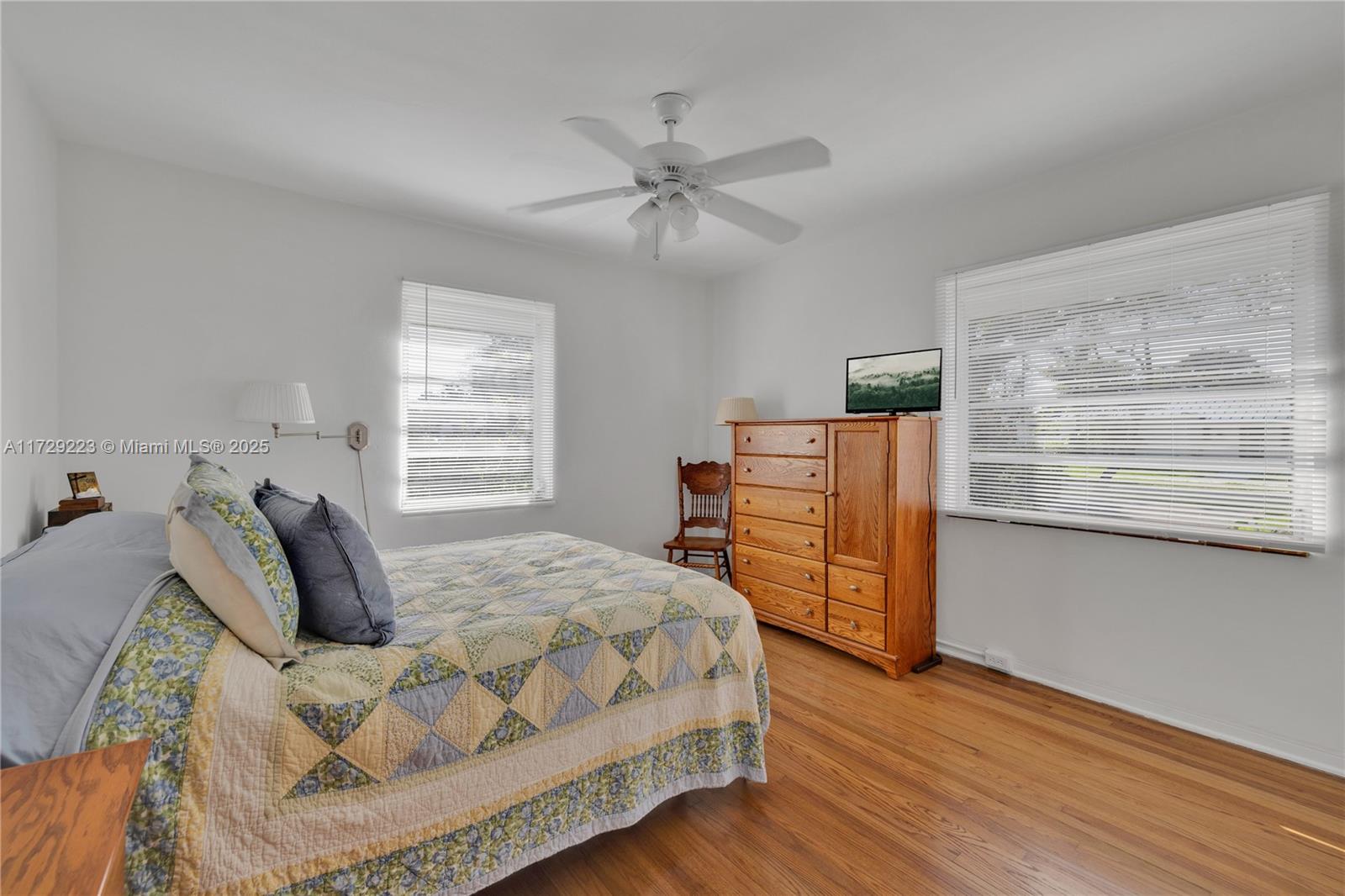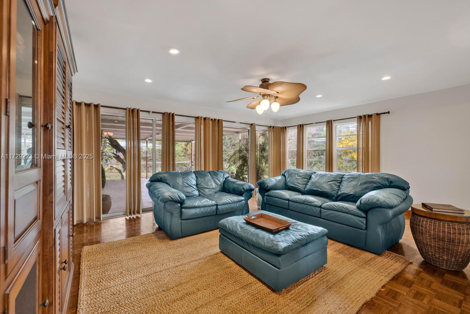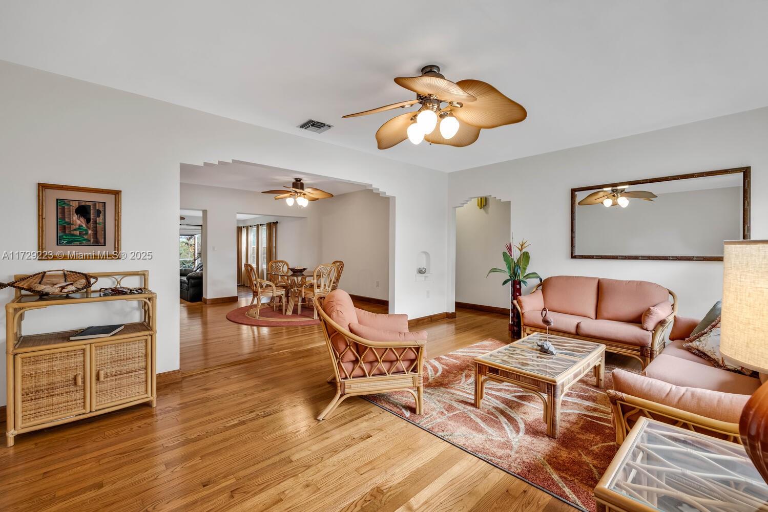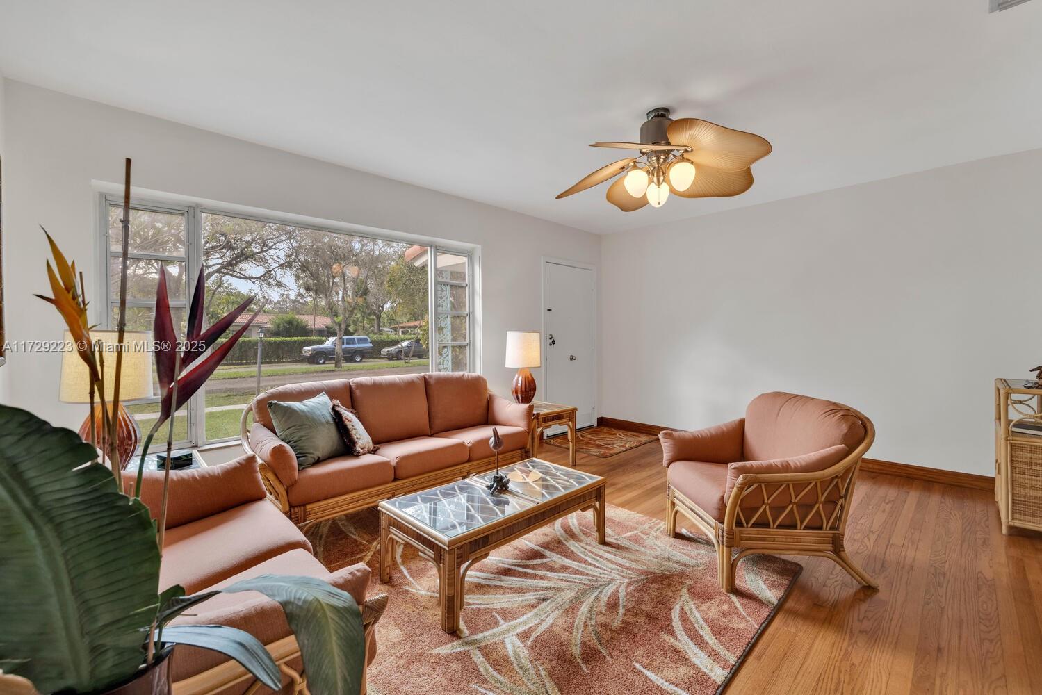 Welcome Home! Wow...what a great place to entertain! Be ready for everyone to come to your house! Big spacious rooms opening one into another times 4! Move right in and 'make it your own' along the way! The kitchen is spacious, white and bright with lots of storage. The garage is clean as a whistle and extends to a covered carport and continued with a long back driveway.....have a need for lots of parking or cars? This is a good choice! The wood floors are gleaming and the family room also leads into a HUGE terrazzo floor screened in patio - a good place to play and relax in any weather. Room for a swimming pool. Primary bedroom has a bathroom ensuite. Located in a special area of Miami Shores with quiet, cul-de-sac streets. Easy to see.