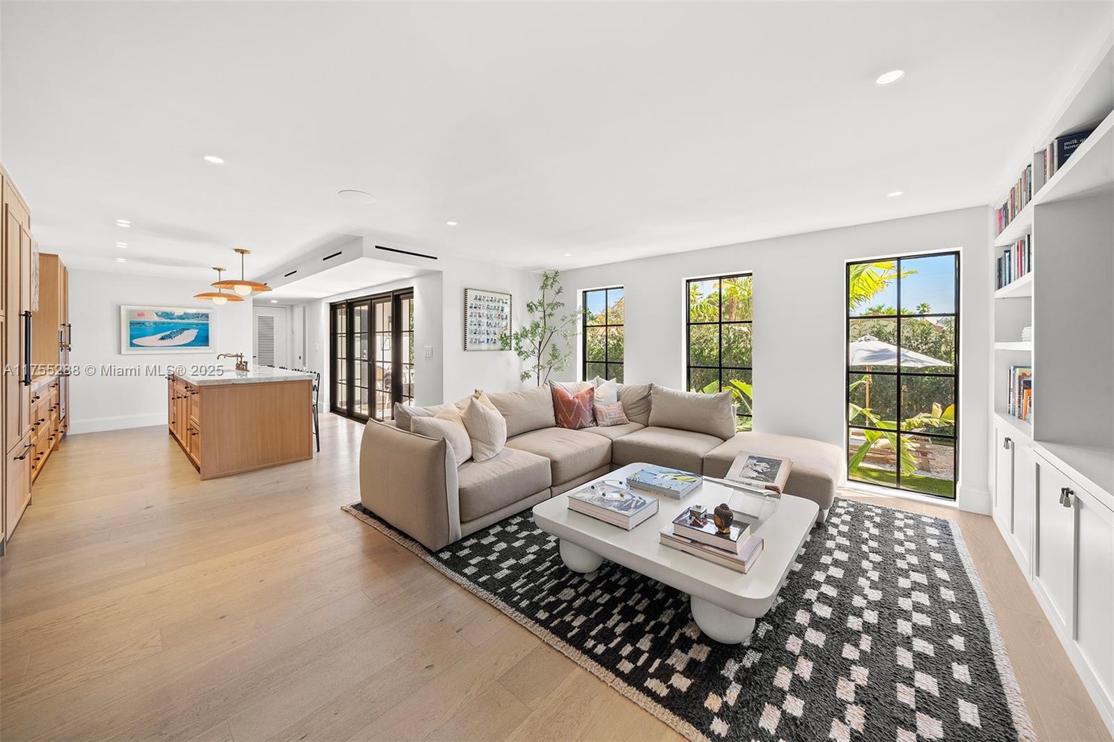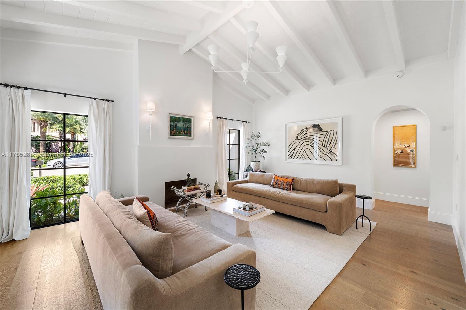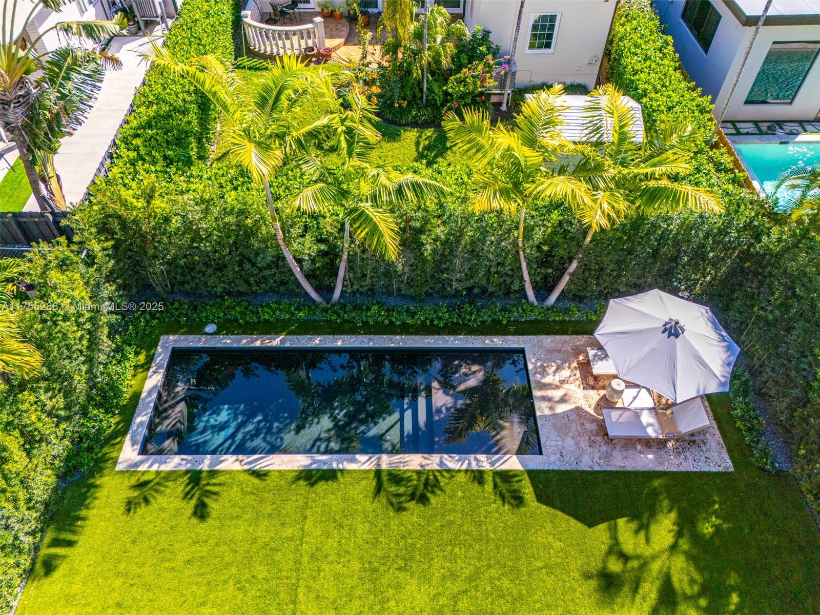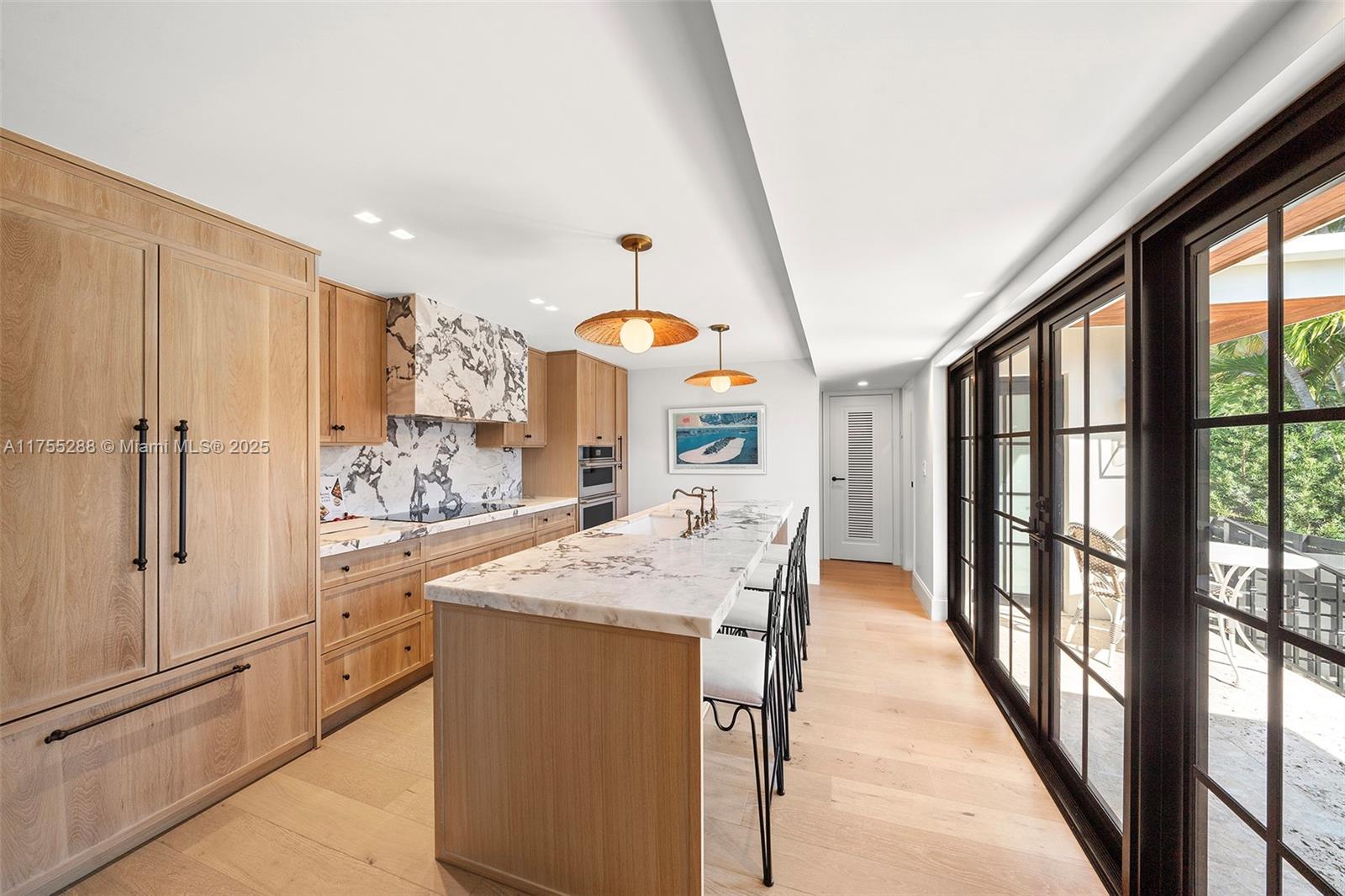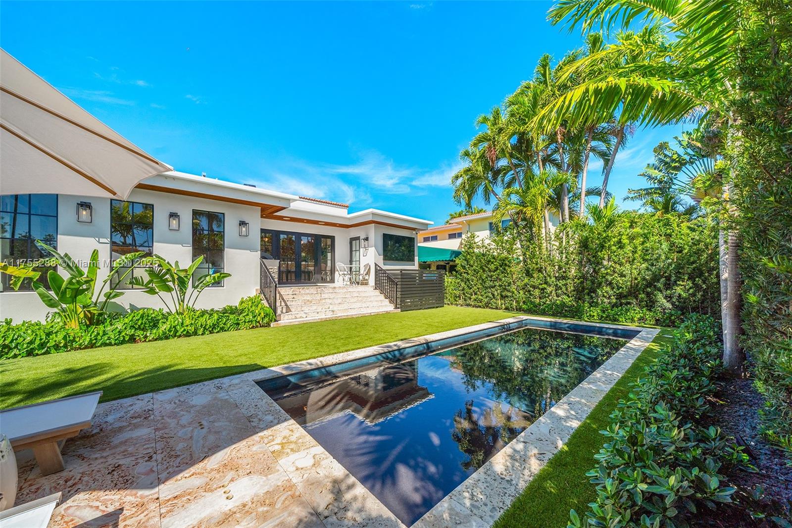 This spacious, fully remodeled two-story home blends modern elegance with high-end finishes. Filled with natural light, it features 3 bedrooms, 3 updated bathrooms, hardwood floors, porcelain tile in the hallway, terrazzo tile in the nursery bathroom, and Florida shellstone in the master bathroom. Redone in 2023 with new electrical, HVAC, plumbing, pool, and flat roof. Luxury touches include Italian doors, Ralph Lauren curtains, Sonos sound, and a marble kitchen island. The quartzite kitchen flows into the dining area, overlooking a fruit tree garden. French doors open to a deck & backyard with a pool and barbecue. Features security cameras, impact windows, landscape lighting, artificial turf & sprinkler system. Near the beach, Bal Harbour & A-rated Bay Harbor Schools.