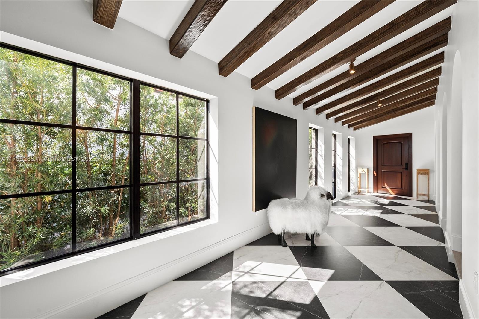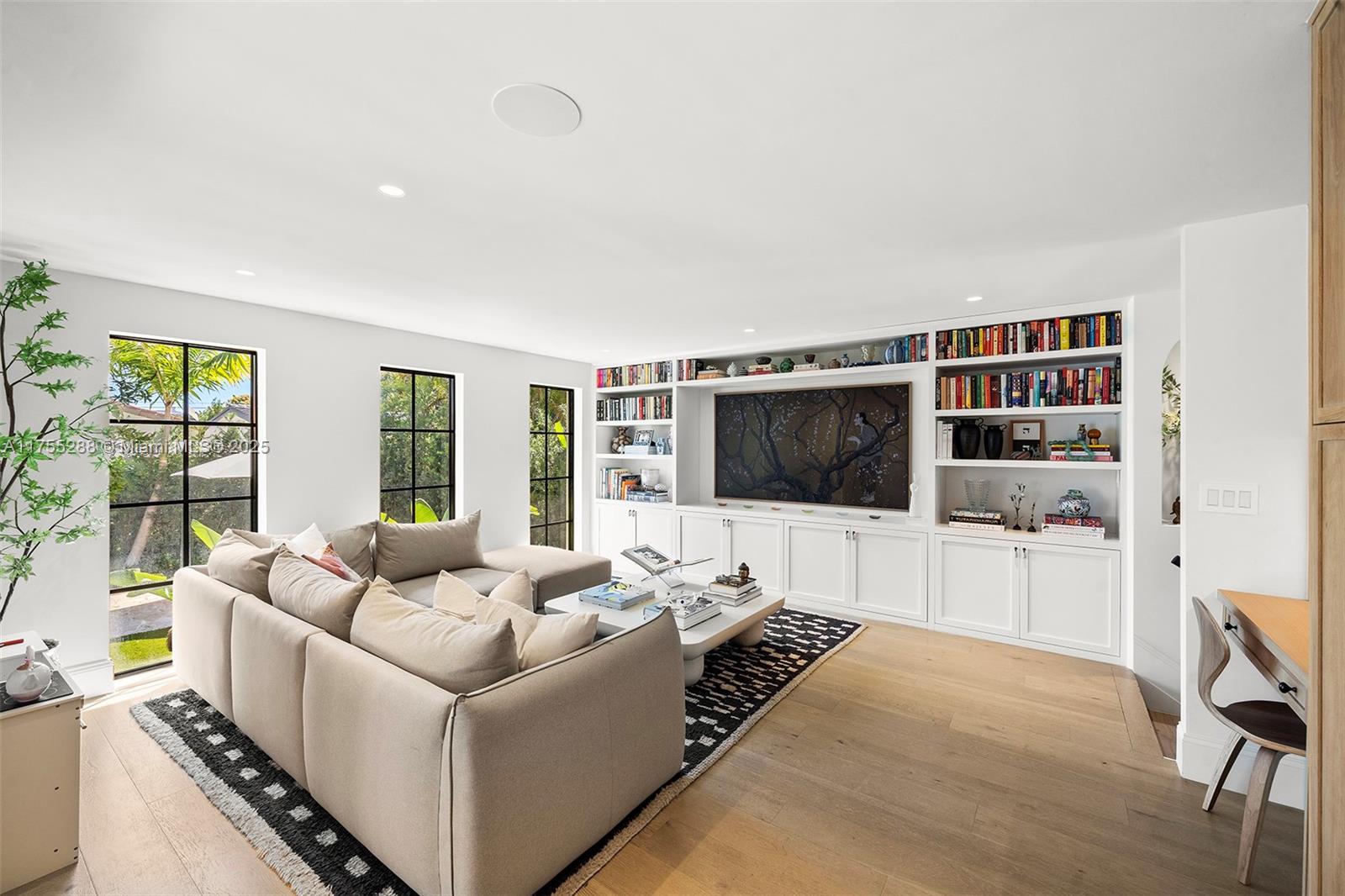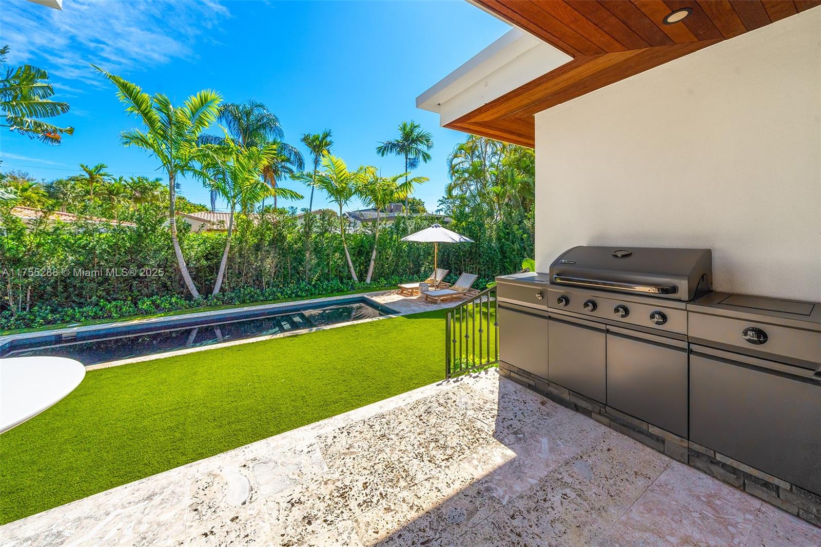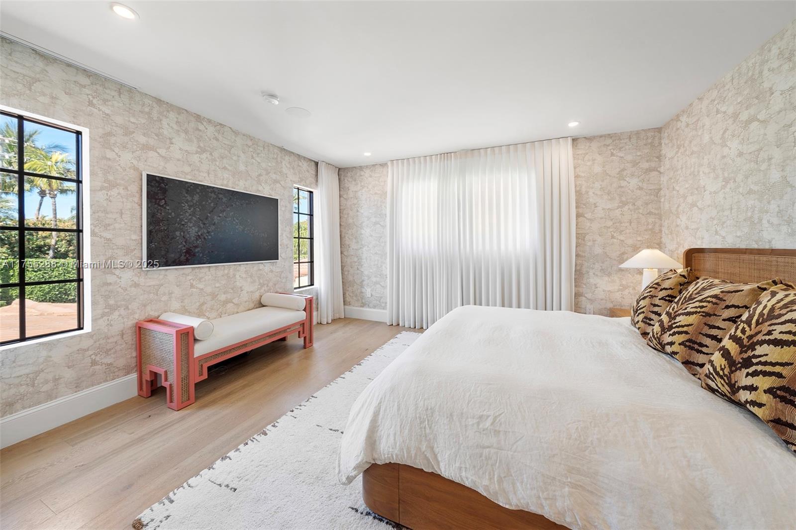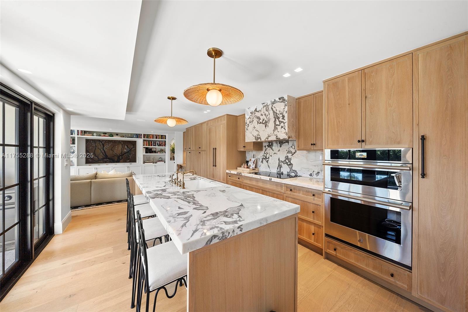 This spacious, fully remodeled two-story home blends modern elegance with high-end finishes. Filled with natural light, it features 3 bedrooms, 3 updated bathrooms, hardwood floors, porcelain tile in the hallway, terrazzo tile in the nursery bathroom, and Florida shellstone in the master bathroom. Redone in 2023 with new electrical, HVAC, plumbing, pool, and flat roof. Luxury touches include Italian doors, Ralph Lauren curtains, Sonos sound, and a marble kitchen island. The quartzite kitchen flows into the dining area, overlooking a fruit tree garden. French doors open to a deck & backyard with a pool and barbecue. Features security cameras, impact windows, landscape lighting, artificial turf & sprinkler system. Near the beach, Bal Harbour & A-rated Bay Harbor Schools.