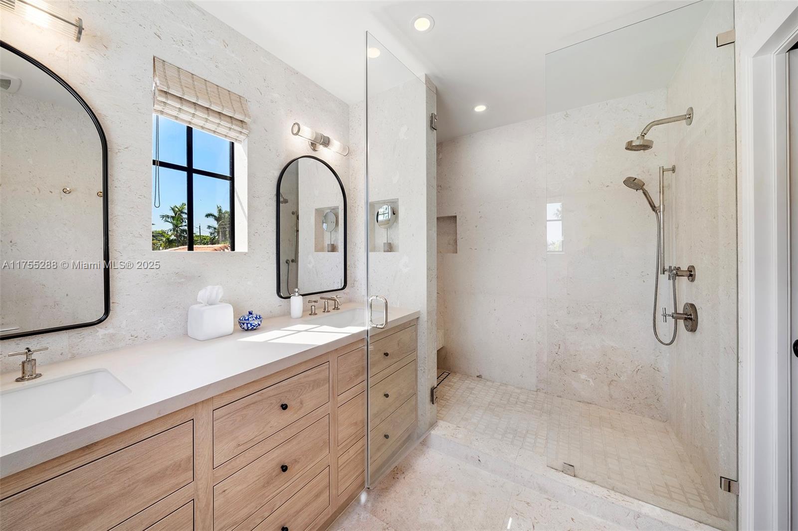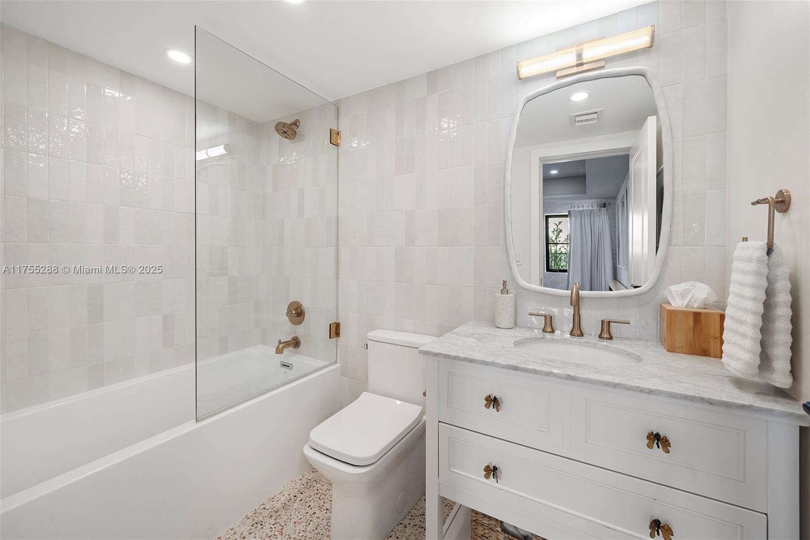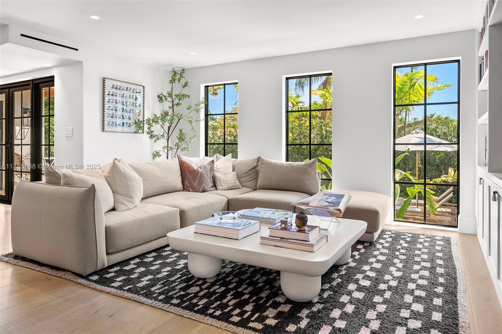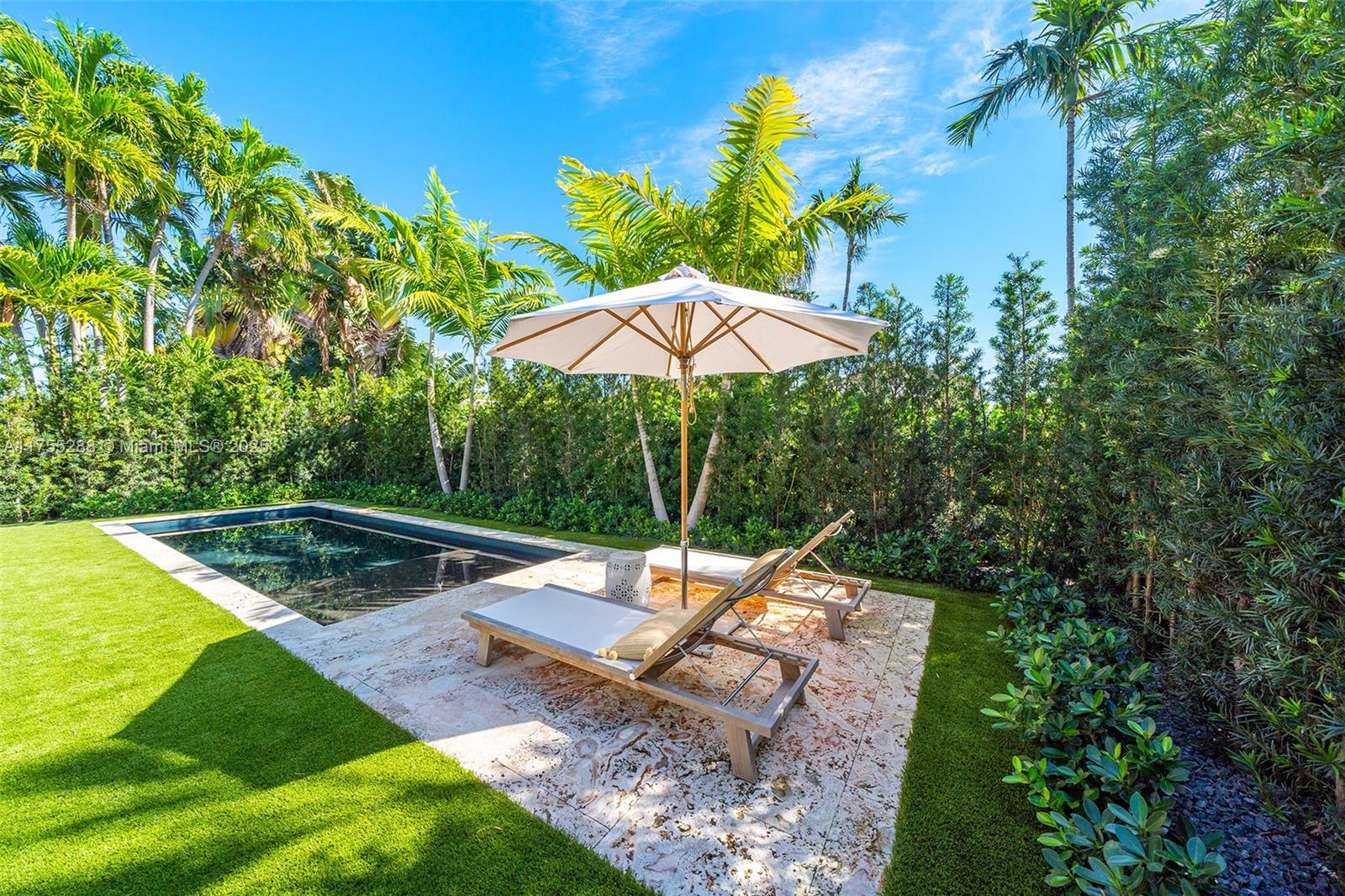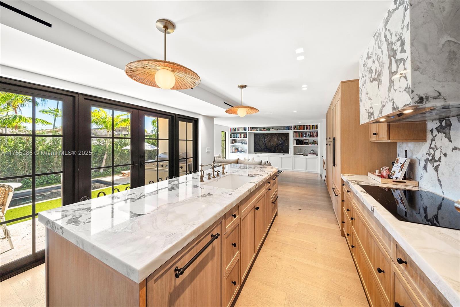 This spacious, fully remodeled two-story home blends modern elegance with high-end finishes. Filled with natural light, it features 3 bedrooms, 3 updated bathrooms, hardwood floors, porcelain tile in the hallway, terrazzo tile in the nursery bathroom, and Florida shellstone in the master bathroom. Redone in 2023 with new electrical, HVAC, plumbing, pool, and flat roof. Luxury touches include Italian doors, Ralph Lauren curtains, Sonos sound, and a marble kitchen island. The quartzite kitchen flows into the dining area, overlooking a fruit tree garden. French doors open to a deck & backyard with a pool and barbecue. Features security cameras, impact windows, landscape lighting, artificial turf & sprinkler system. Near the beach, Bal Harbour & A-rated Bay Harbor Schools.