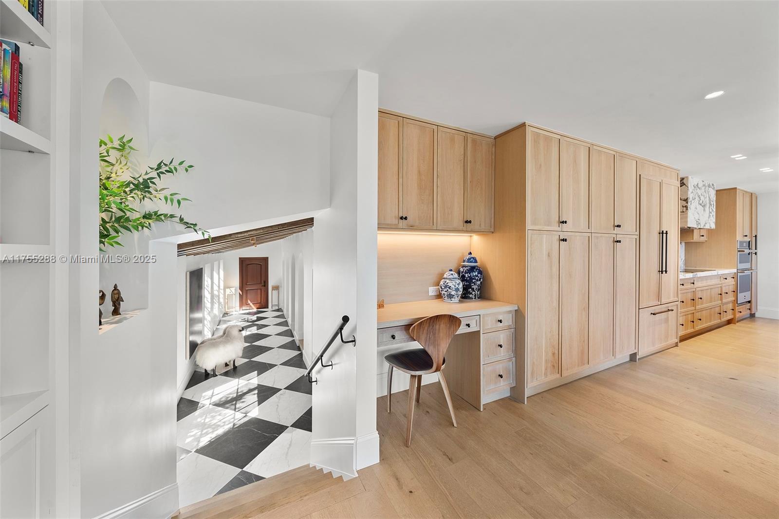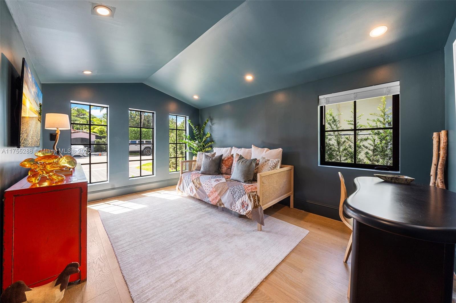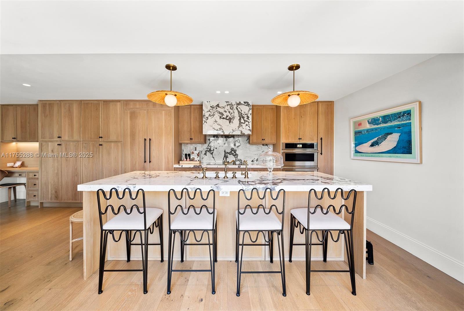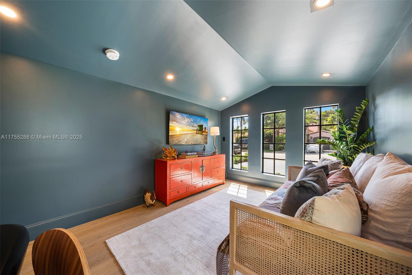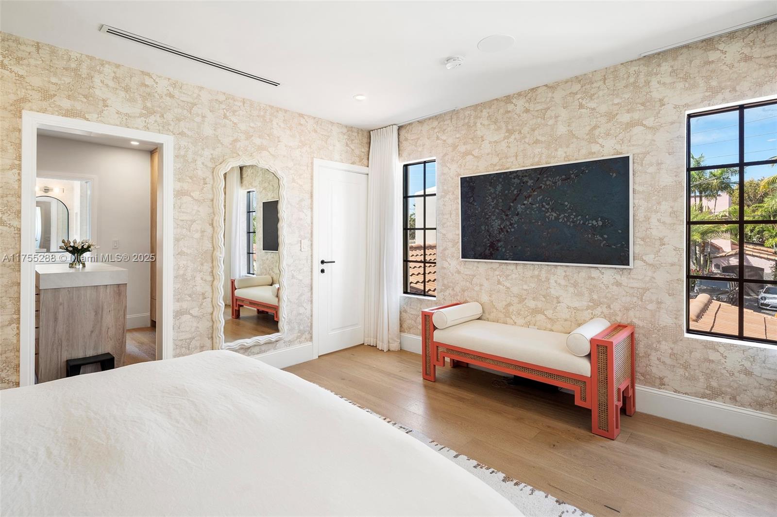 This spacious, fully remodeled two-story home blends modern elegance with high-end finishes. Filled with natural light, it features 3 bedrooms, 3 updated bathrooms, hardwood floors, porcelain tile in the hallway, terrazzo tile in the nursery bathroom, and Florida shellstone in the master bathroom. Redone in 2023 with new electrical, HVAC, plumbing, pool, and flat roof. Luxury touches include Italian doors, Ralph Lauren curtains, Sonos sound, and a marble kitchen island. The quartzite kitchen flows into the dining area, overlooking a fruit tree garden. French doors open to a deck & backyard with a pool and barbecue. Features security cameras, impact windows, landscape lighting, artificial turf & sprinkler system. Near the beach, Bal Harbour & A-rated Bay Harbor Schools.