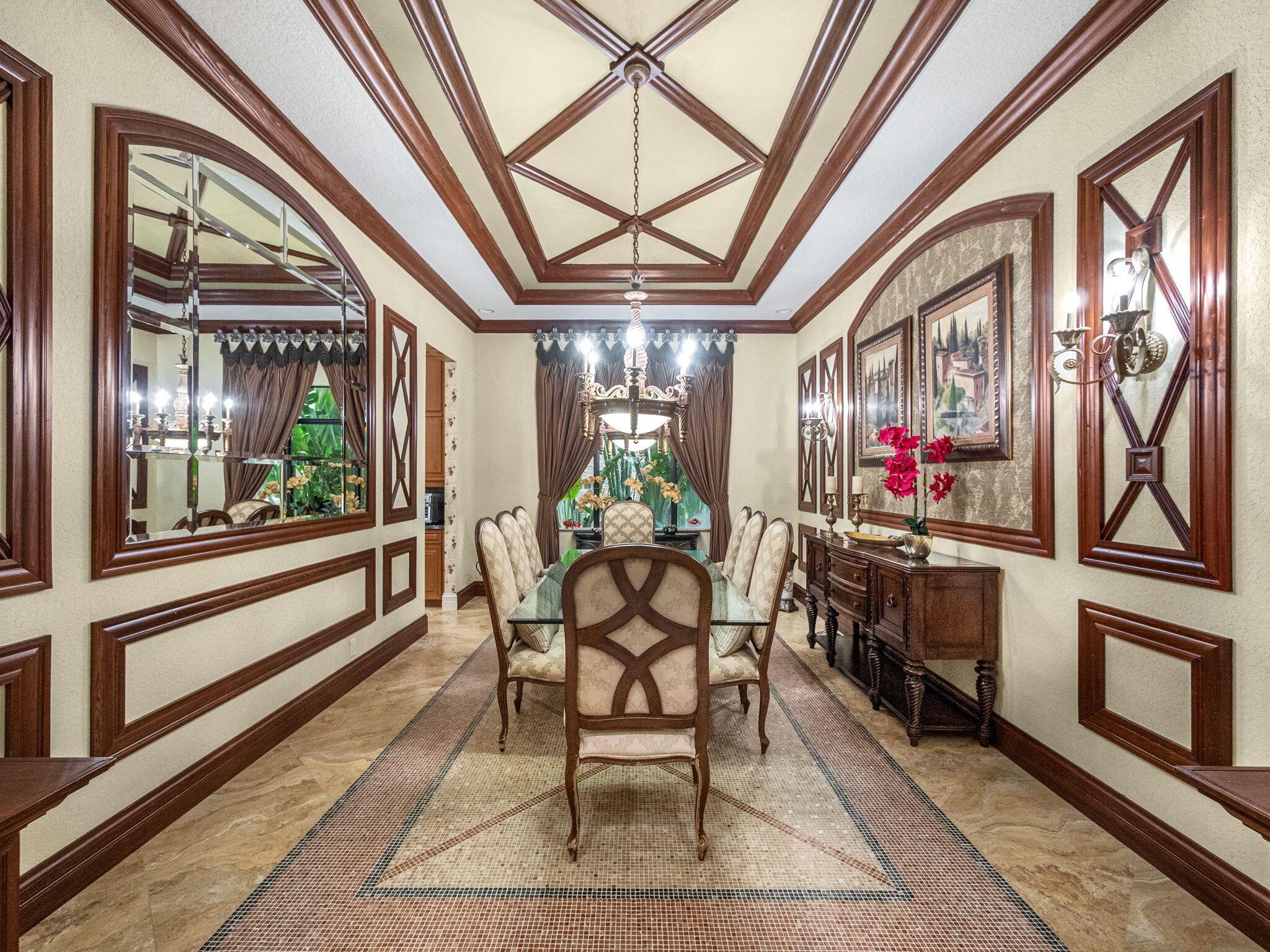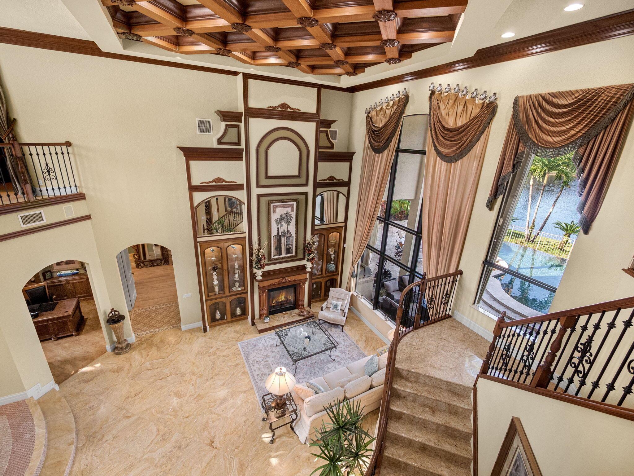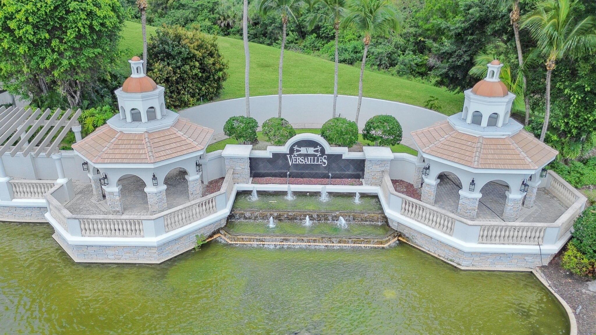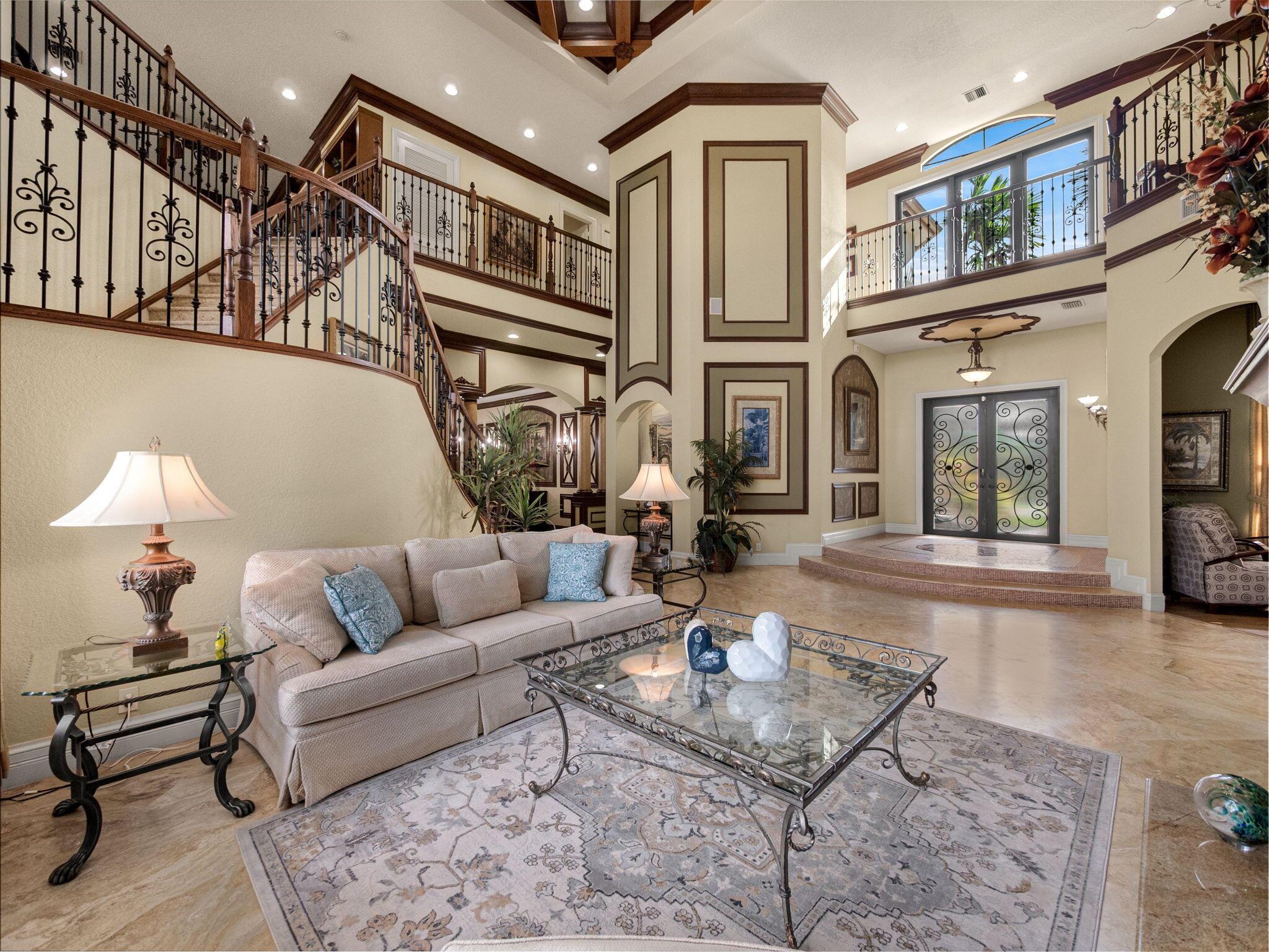 Magnificent former builder's model in Wellington's upscale Versailles sits on a breathtaking lakefront lot with an infinity-edge heated saltwater pool and spa ,travertine tile patio, outdoor kitchen and mango trees. Offering 5 bedrooms 6 1/2 baths and a 3 car garage, this Marseilles model also includes an executive office/library a theater and a spacious loft. Dramatic soaring 23 foot coffered ceilings and the French inspired architectural designs, stately columns, beautified walls, saturnia marble floors, multiple inlaid mosaic insets and diverse custom ceilings, accentuate the uniqueness of this estate home. In 2024,the roof was replaced, complete water filtration system was installed as was LVP flooring in the bedrooms and loft. In 2023 impact doors were installed and a whole house
