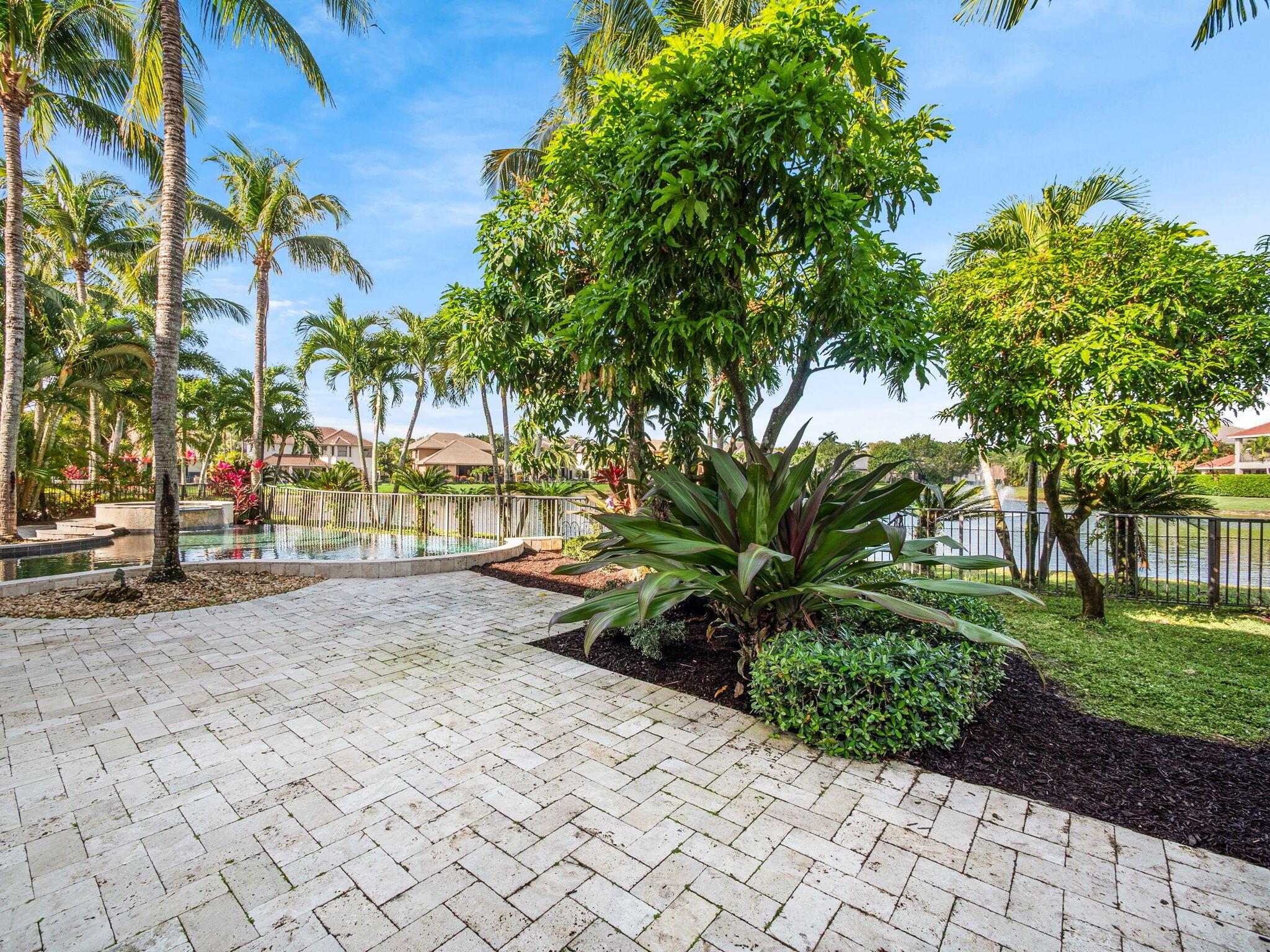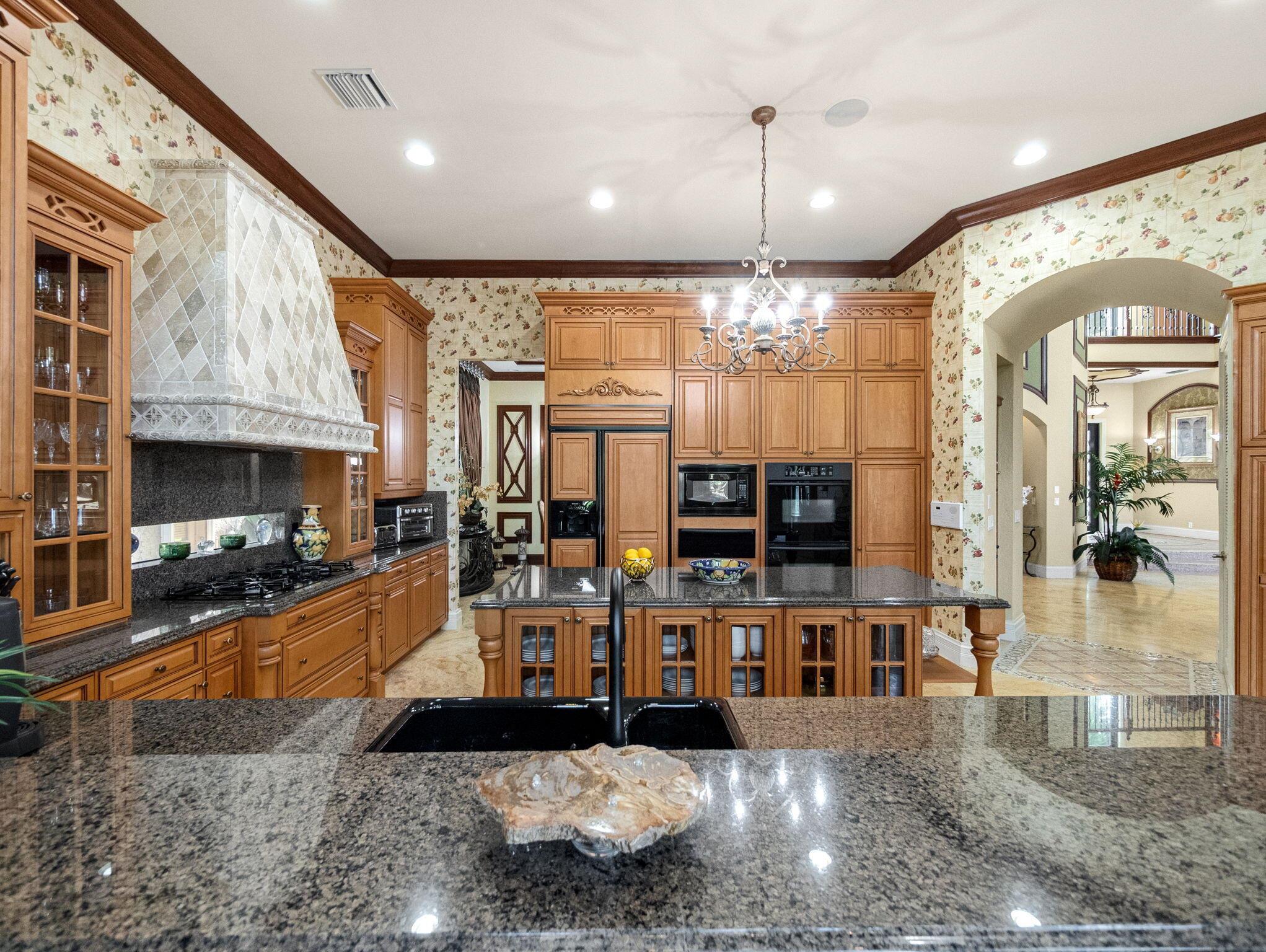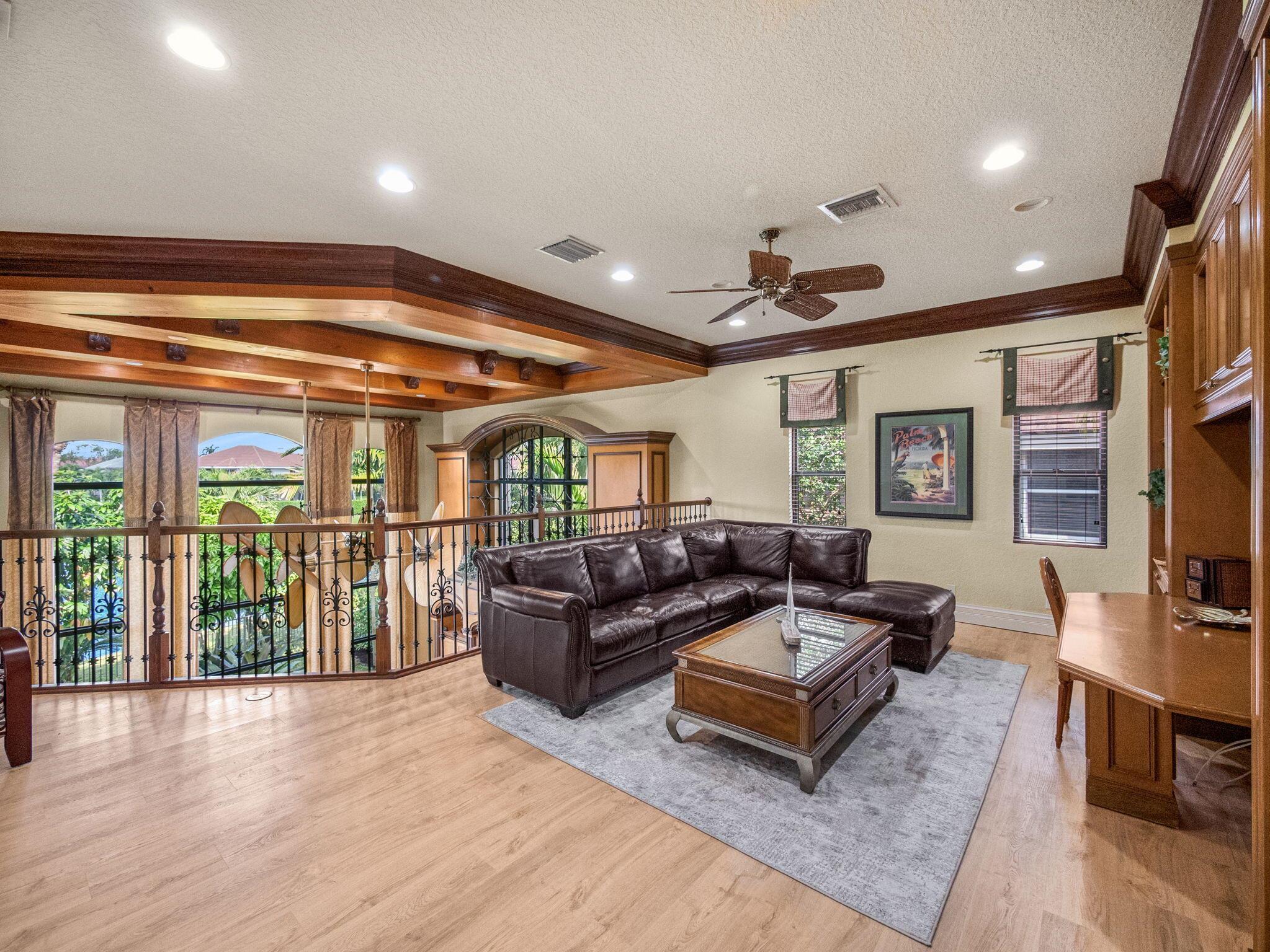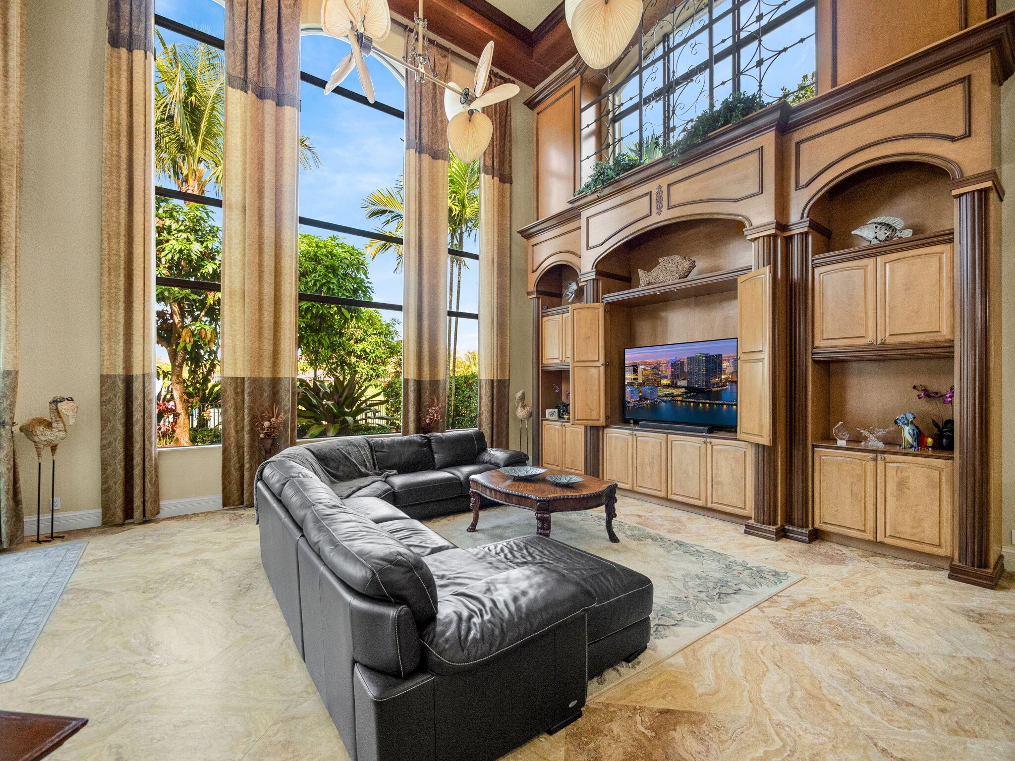 Magnificent former builder's model in Wellington's upscale Versailles sits on a breathtaking lakefront lot with an infinity-edge heated saltwater pool and spa ,travertine tile patio, outdoor kitchen and mango trees. Offering 5 bedrooms 6 1/2 baths and a 3 car garage, this Marseilles model also includes an executive office/library a theater and a spacious loft. Dramatic soaring 23 foot coffered ceilings and the French inspired architectural designs, stately columns, beautified walls, saturnia marble floors, multiple inlaid mosaic insets and diverse custom ceilings, accentuate the uniqueness of this estate home. In 2024,the roof was replaced, complete water filtration system was installed as was LVP flooring in the bedrooms and loft. In 2023 impact doors were installed and a whole house
