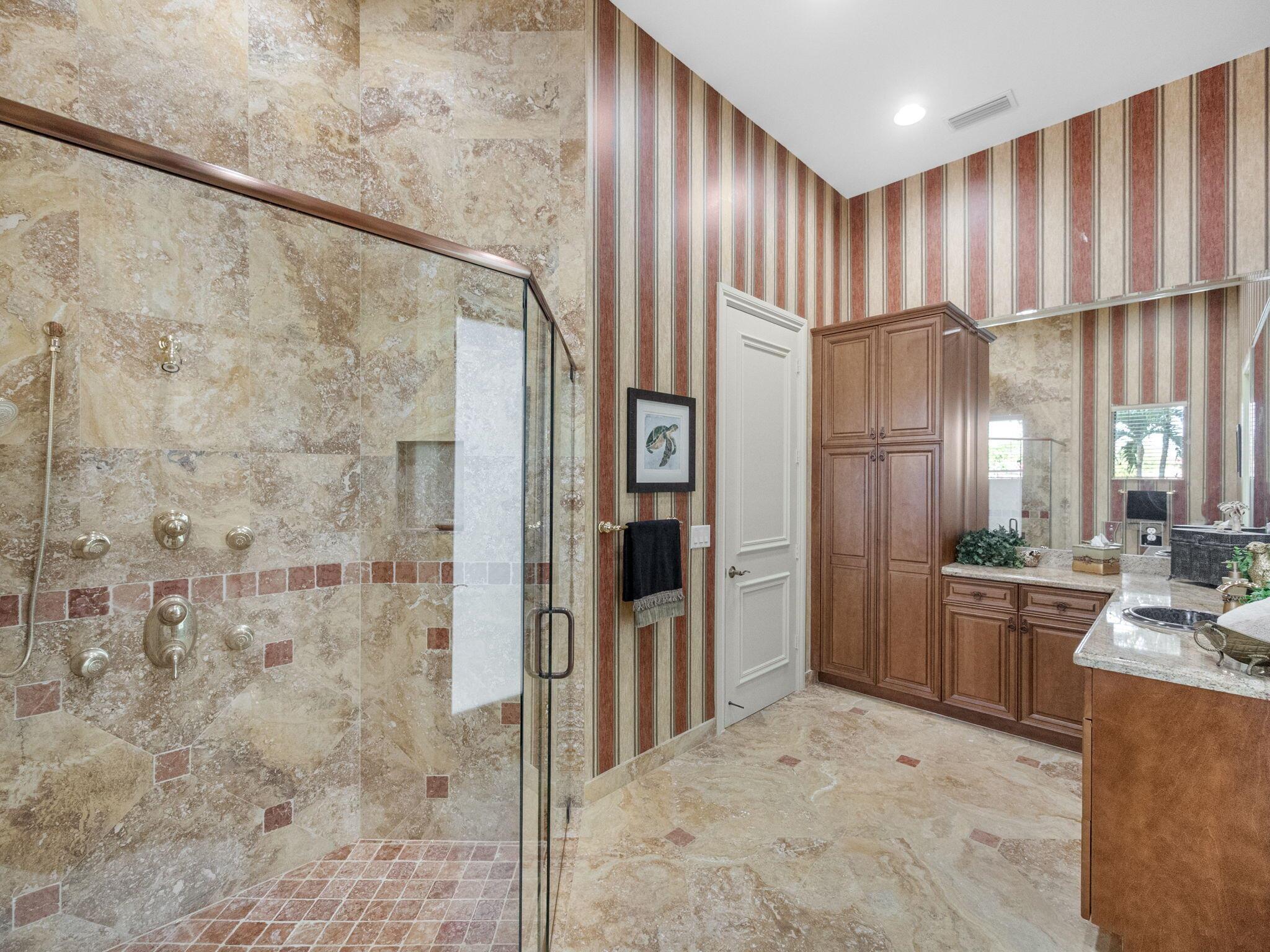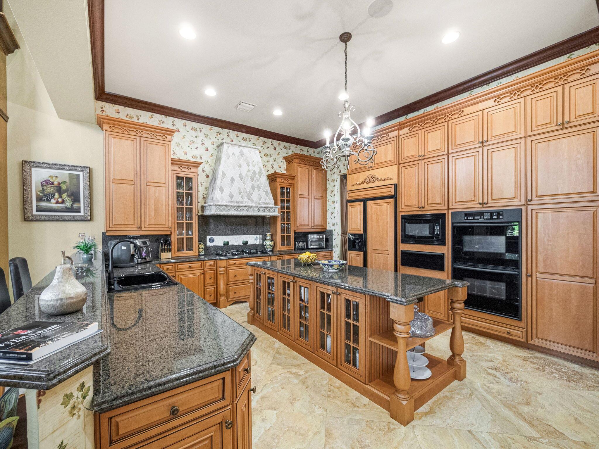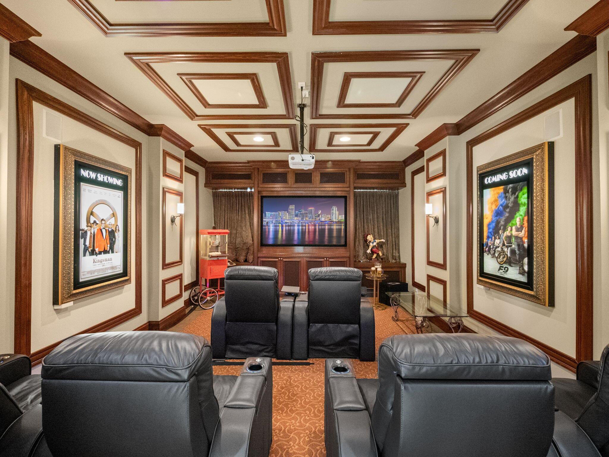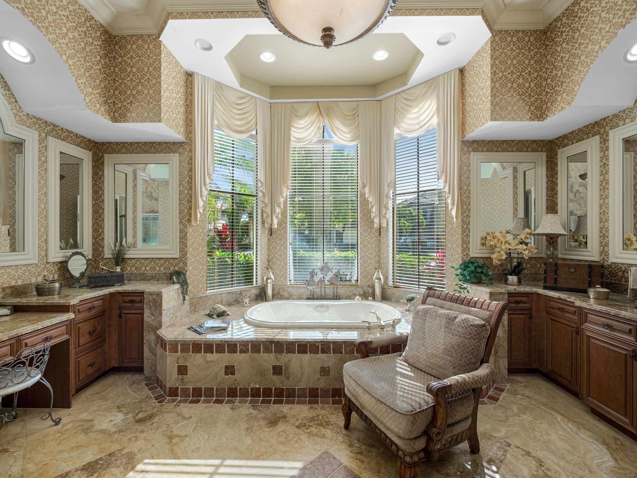 Magnificent former builder's model in Wellington's upscale Versailles sits on a breathtaking lakefront lot with an infinity-edge heated saltwater pool and spa ,travertine tile patio, outdoor kitchen and mango trees. Offering 5 bedrooms 6 1/2 baths and a 3 car garage, this Marseilles model also includes an executive office/library a theater and a spacious loft. Dramatic soaring 23 foot coffered ceilings and the French inspired architectural designs, stately columns, beautified walls, saturnia marble floors, multiple inlaid mosaic insets and diverse custom ceilings, accentuate the uniqueness of this estate home. In 2024,the roof was replaced, complete water filtration system was installed as was LVP flooring in the bedrooms and loft. In 2023 impact doors were installed and a whole house