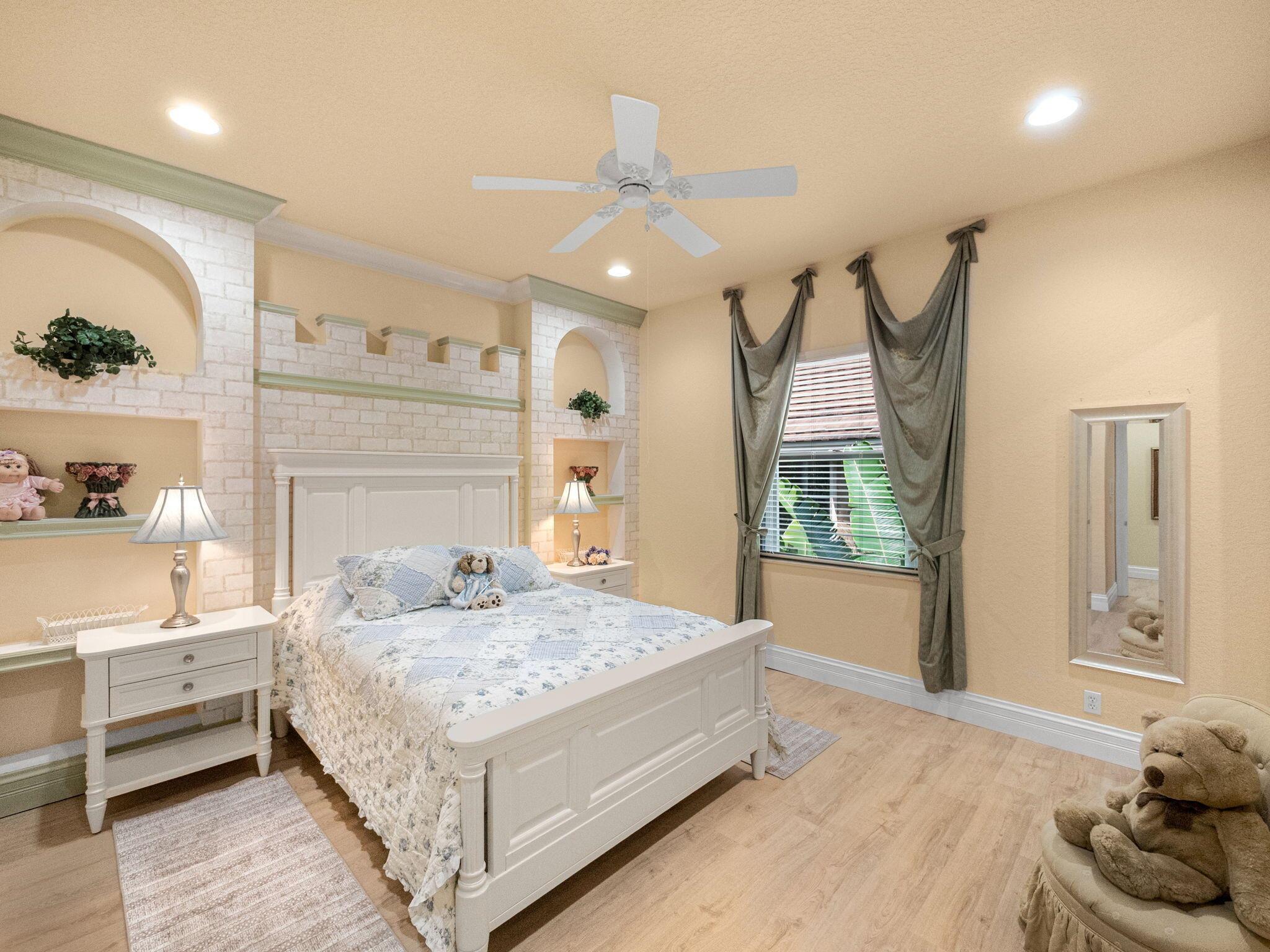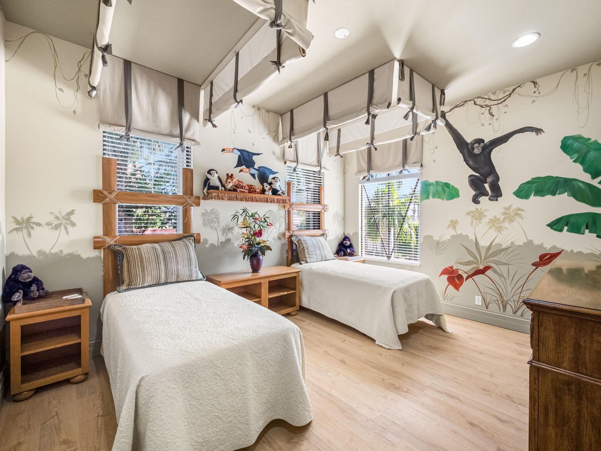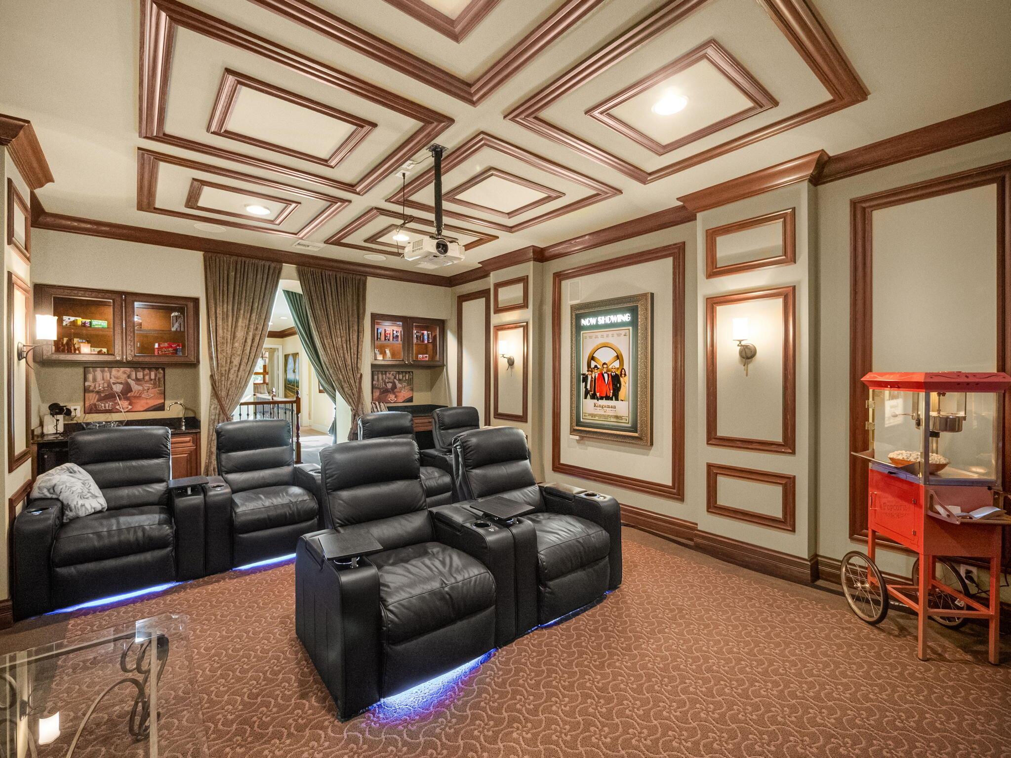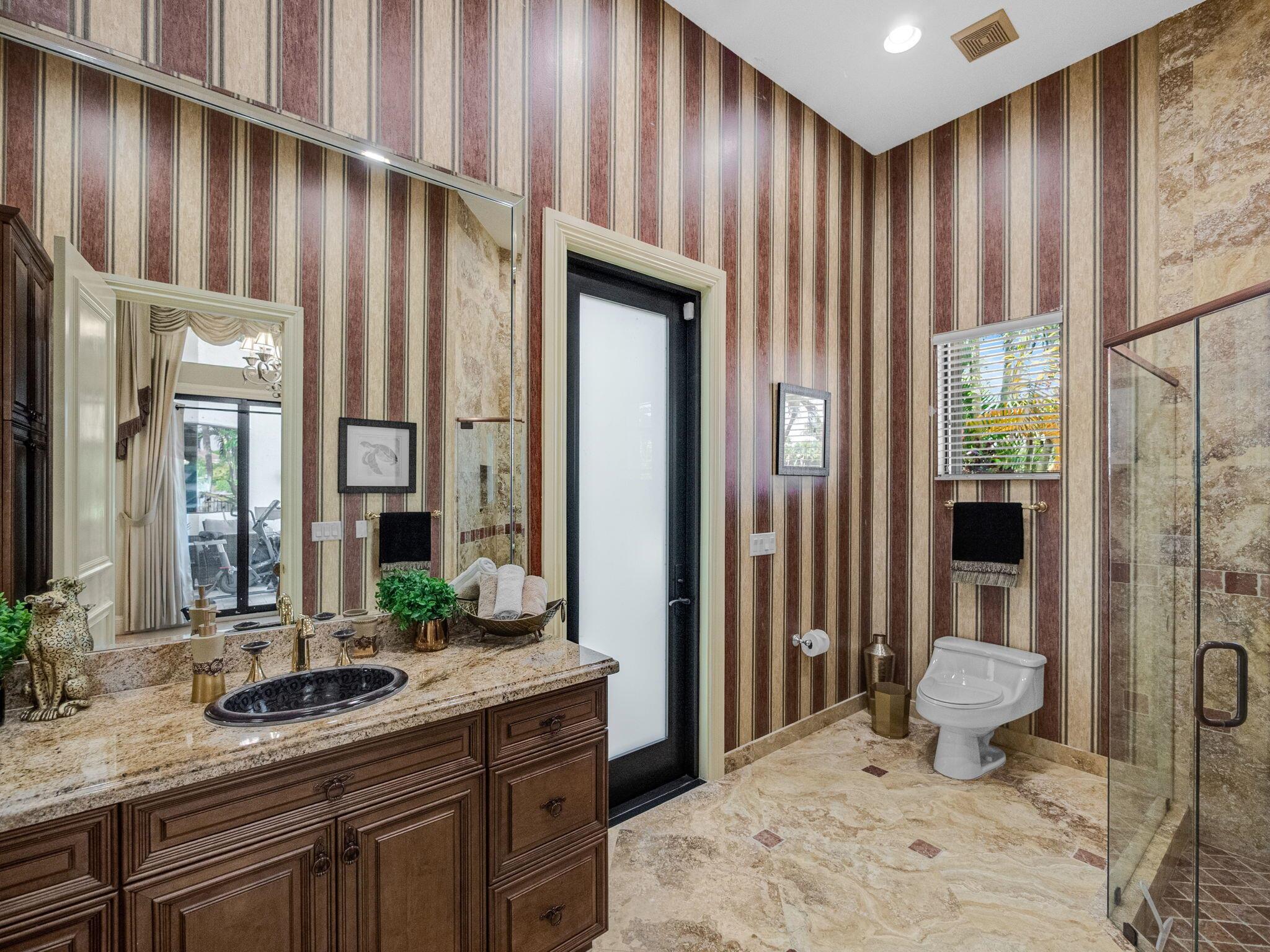 Magnificent former builder's model in Wellington's upscale Versailles sits on a breathtaking lakefront lot with an infinity-edge heated saltwater pool and spa ,travertine tile patio, outdoor kitchen and mango trees. Offering 5 bedrooms 6 1/2 baths and a 3 car garage, this Marseilles model also includes an executive office/library a theater and a spacious loft. Dramatic soaring 23 foot coffered ceilings and the French inspired architectural designs, stately columns, beautified walls, saturnia marble floors, multiple inlaid mosaic insets and diverse custom ceilings, accentuate the uniqueness of this estate home. In 2024,the roof was replaced, complete water filtration system was installed as was LVP flooring in the bedrooms and loft. In 2023 impact doors were installed and a whole house