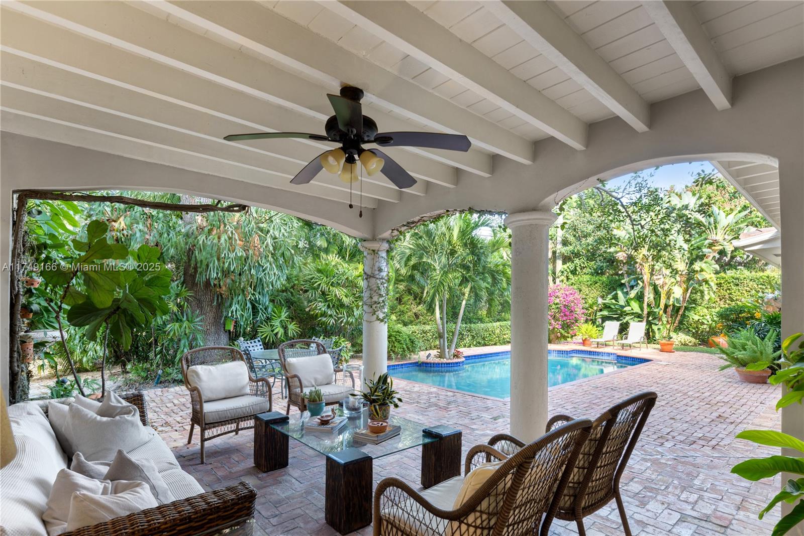 Discover this beautifully maintained residence, showcasing curated design and modern functionality. A grand, double-height family room, an architectural statement providing an open, airy atmosphere. Wood and marble floors throughout combine warmth and sophistication. The living room's fireplace creates a cozy focal point. The first floor offers 3 spacious bedrooms & 3 baths. The private second-floor primary suite features a sitting room, indulgent spa bath, and custom walk-in closets. Outdoor entertaining is effortless with a brick patio and covered terrace overlooking the pool. Integrated speakers enhance the ambiance inside and out. Equipped with double-pane windows, a whole-house generator, built-in garage workstation, and sprinkler system for ultimate comfort and security.