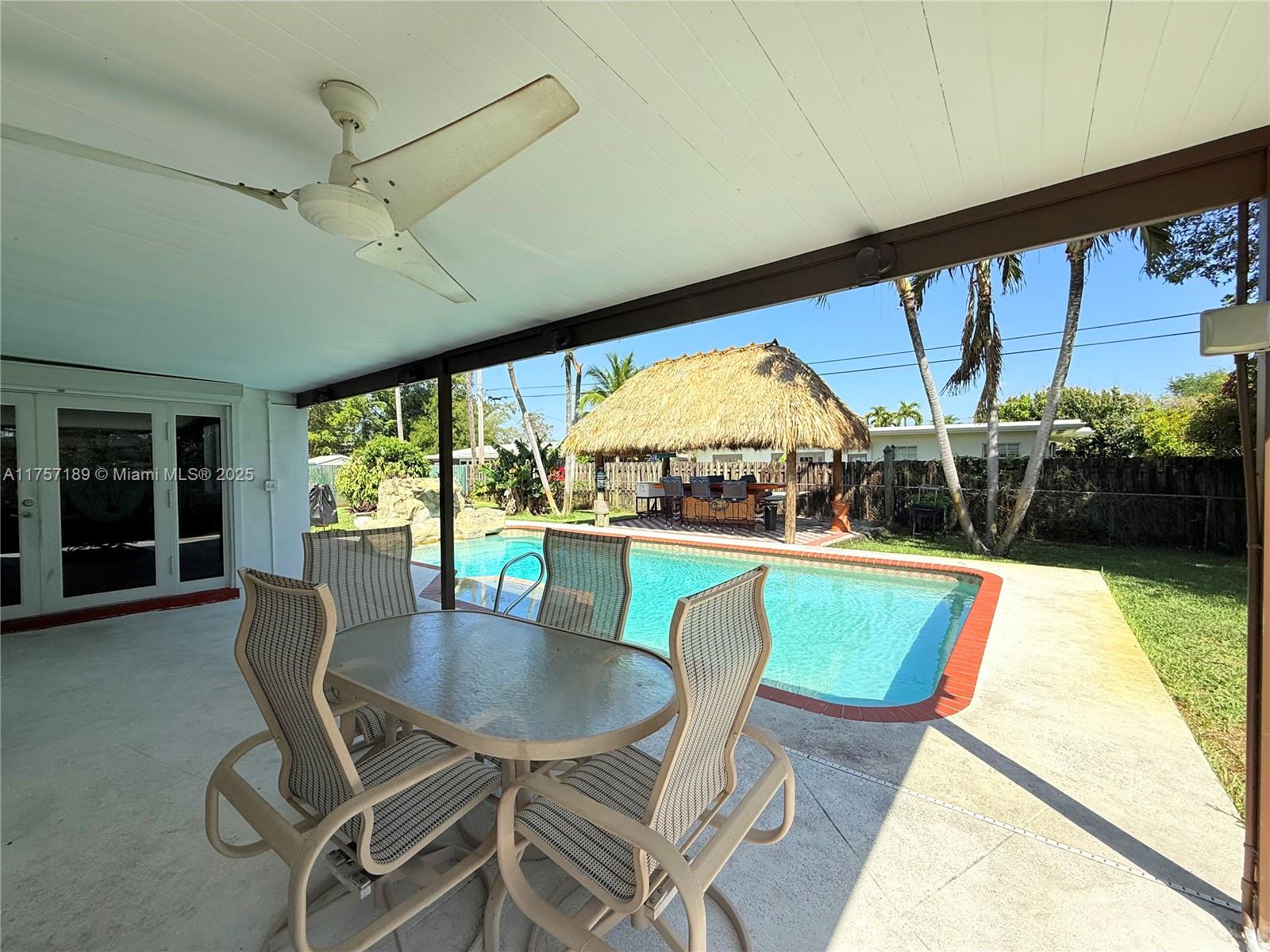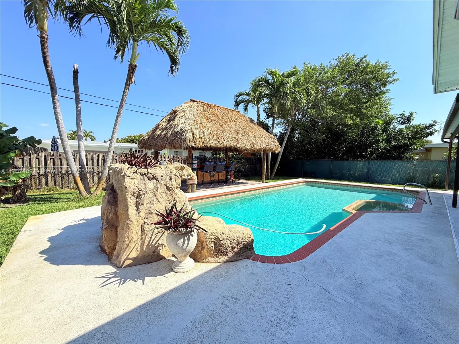 Must see 3 bed/2 bath home in sought after Plantation Gardens. Oversized 10,921 sq ft lot with room to park RV or boat on each side of the home. Enjoy a saltwater pool, with hot tub and waterfall. A tiki hut with bar including water and electricity. Large covered patio ideal for relaxing or entertaining. Features include tile floors, new A/C, new flat roofs, gas tankless water heater, gas dryer, and double oven. Upgraded electric panel with generator hookup. Smart home with Alexa controls, security cameras, screened porch, and 2-car garage. Located in a quiet neighborhood near parks, shopping, dining, Turnpike, and Ft Lauderdale Airport. Schedule your private tour today!. New roof will be installed!!!!!!!!!