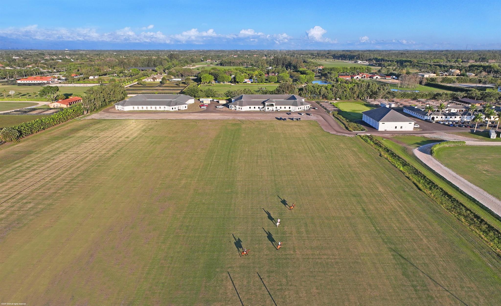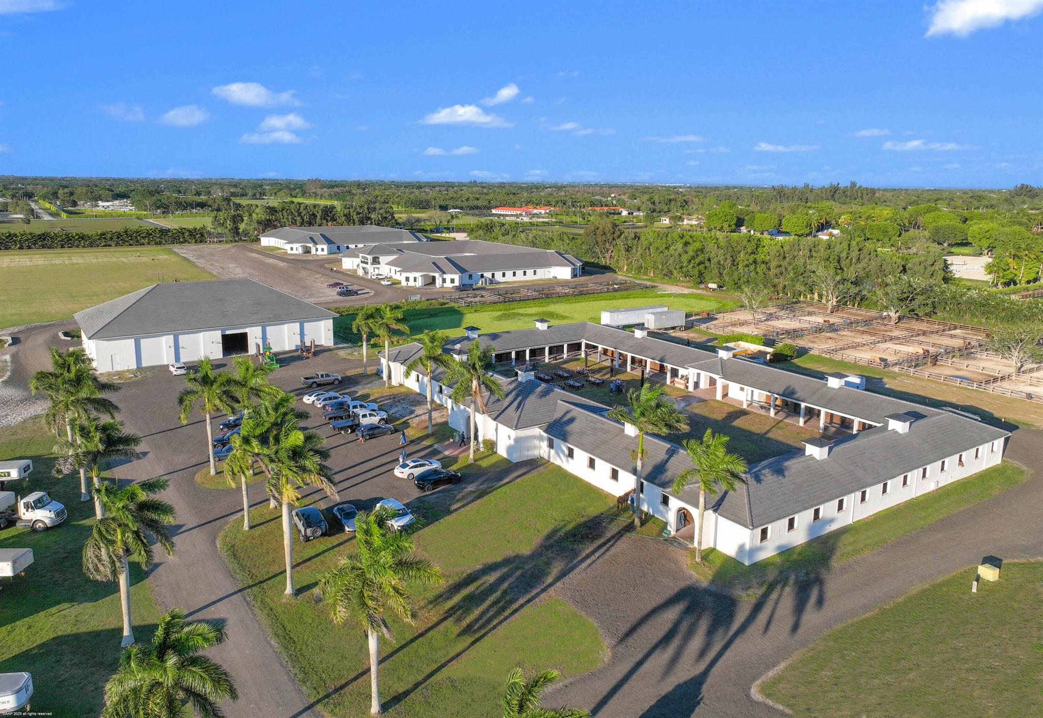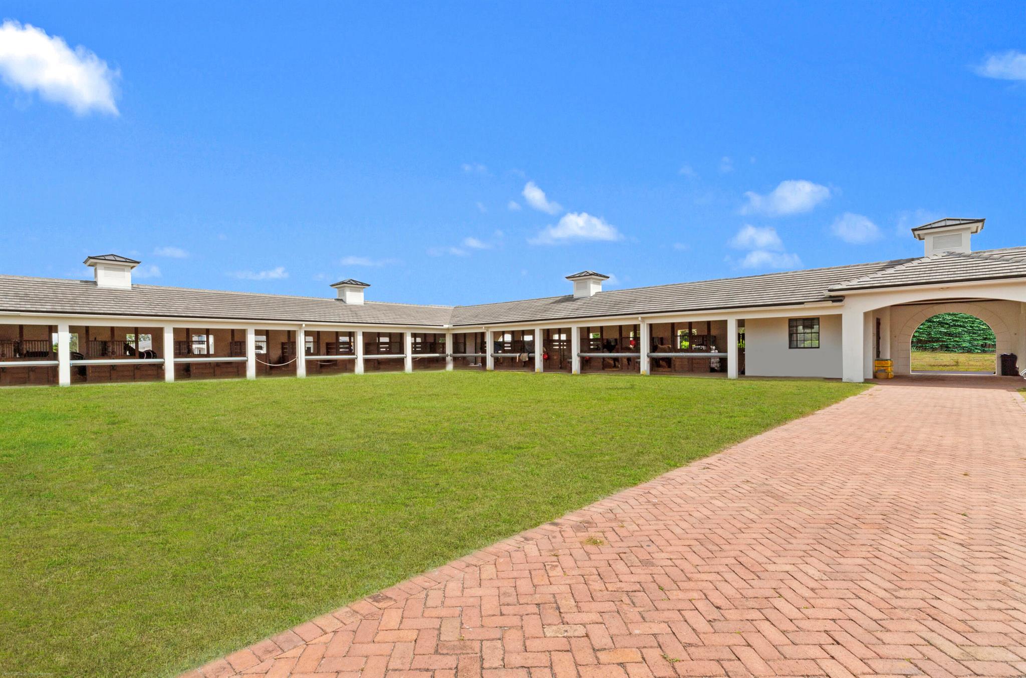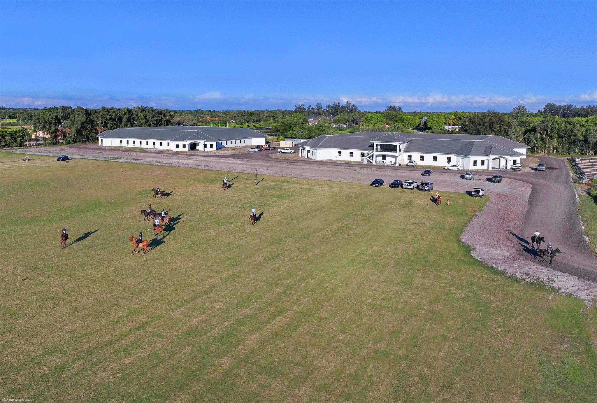 Reduced $7,500,000. One-of-a-kind opportunity to own a 46.96 acre equestrian facility in a prime Wellington location on a paved road and with no homeowner's association. The property boasts 4 stables, totaling175 stalls, full size polo field with exercise track, a second stick & ball practice field, maintenance garage and two staff houses. Two new show barns were built in 2024, one with 52 stalls & the other with 59, it also features a 2nd floor viewing room with balcony overlooking the polo fields. The original courtyard-barn holds 48 horses and the over flow barn has 16 stalls. The staff houses each have 4BR & 4Bths. The property is comprised of multiple parcels which could lend itself to future subdivision. This farm has unlimited potential for all equestrian disciplines. A must see!
