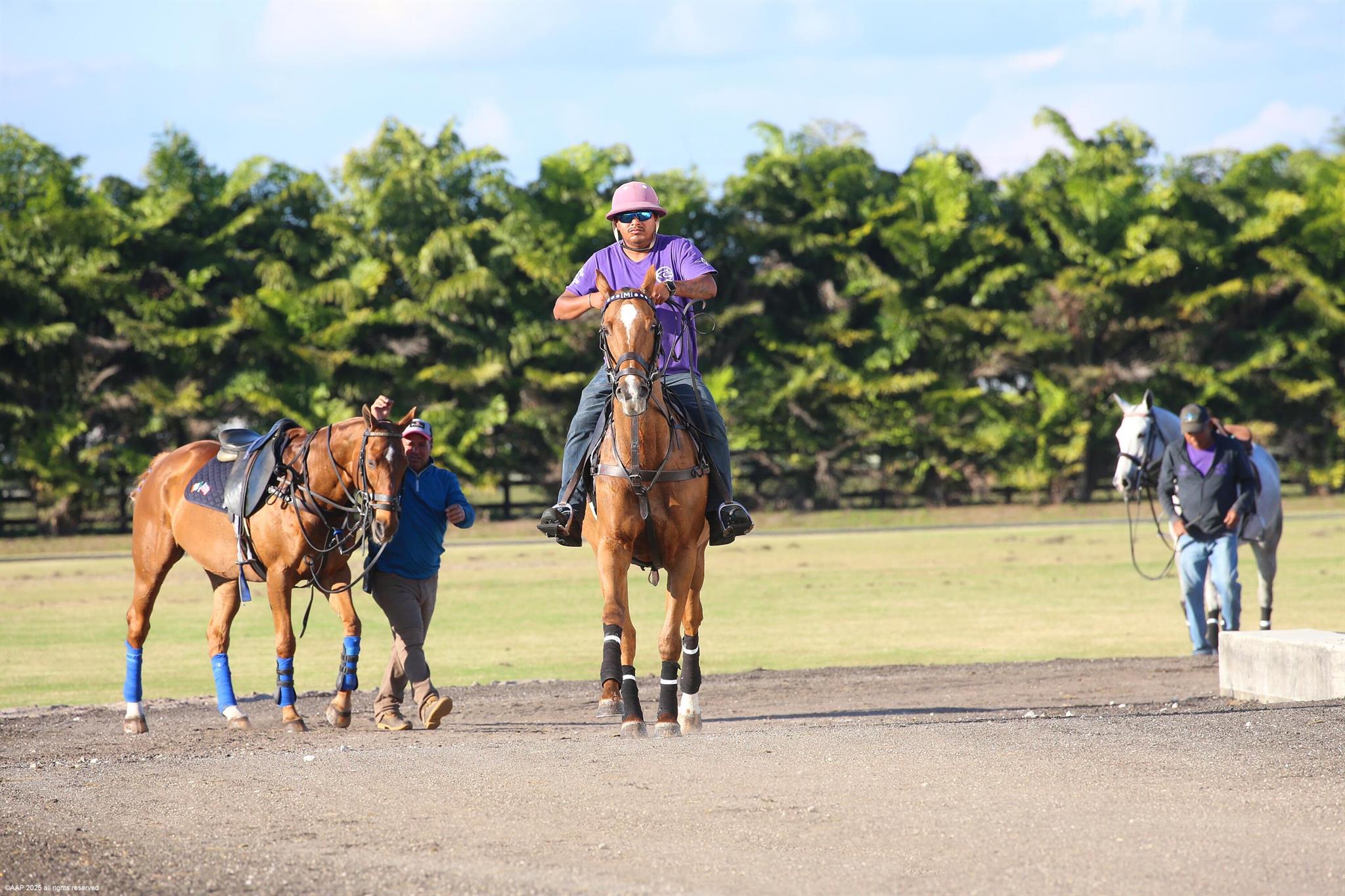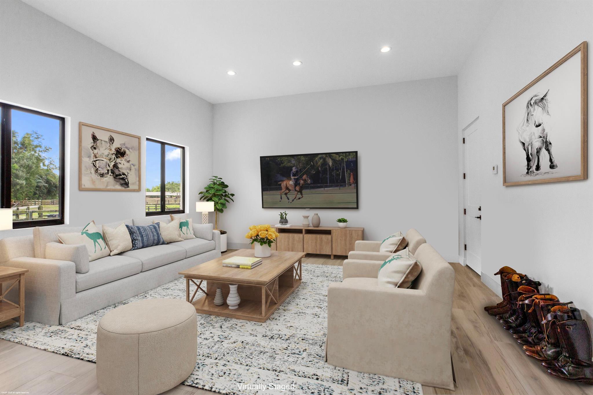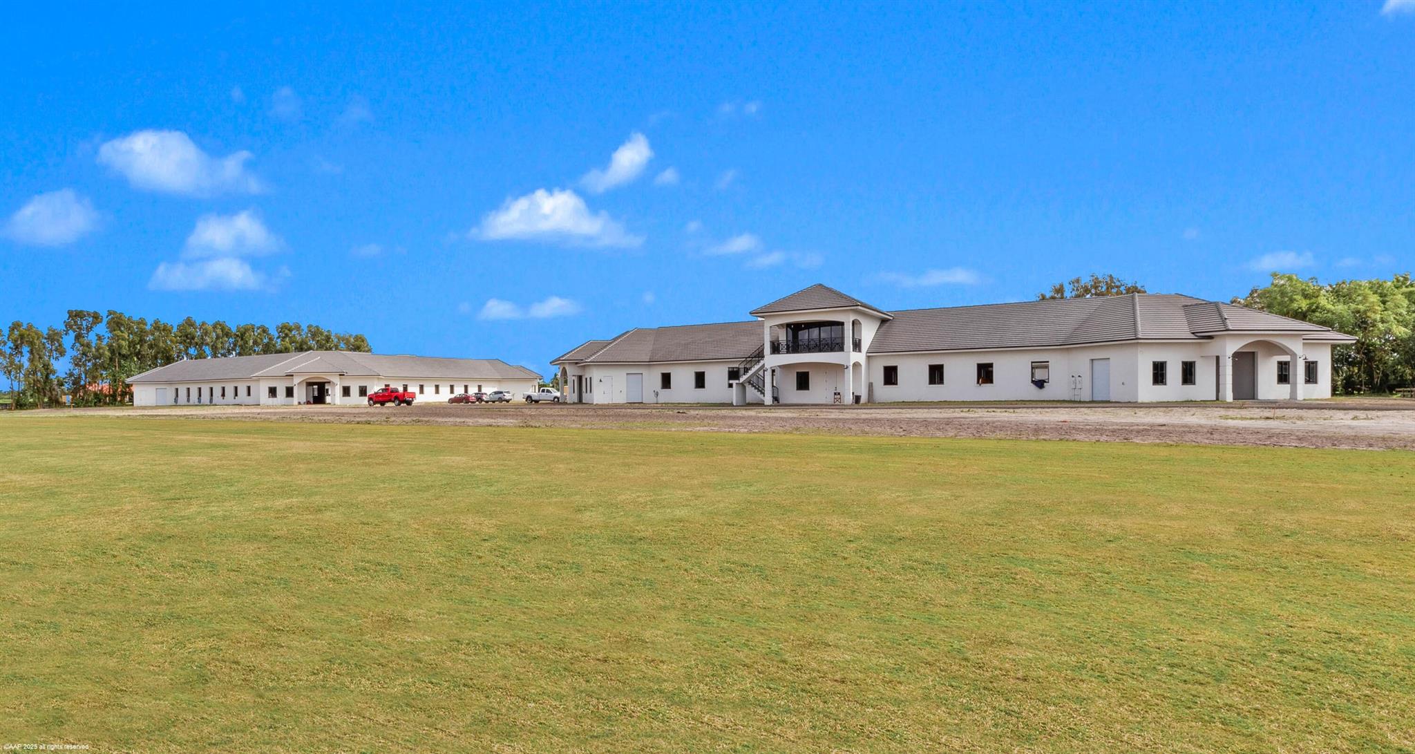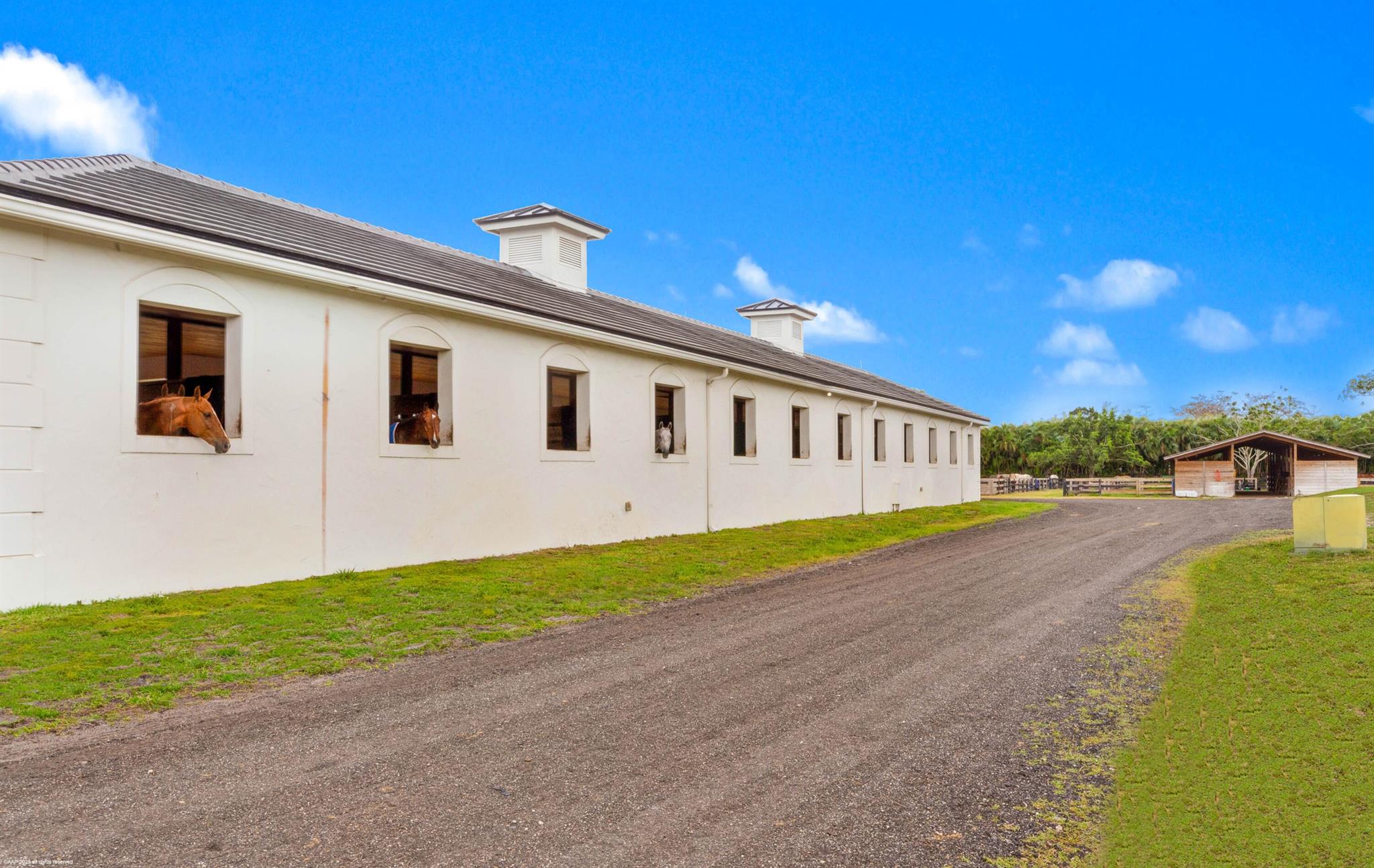 Reduced $7,500,000. One-of-a-kind opportunity to own a 46.96 acre equestrian facility in a prime Wellington location on a paved road and with no homeowner's association. The property boasts 4 stables, totaling175 stalls, full size polo field with exercise track, a second stick & ball practice field, maintenance garage and two staff houses. Two new show barns were built in 2024, one with 52 stalls & the other with 59, it also features a 2nd floor viewing room with balcony overlooking the polo fields. The original courtyard-barn holds 48 horses and the over flow barn has 16 stalls. The staff houses each have 4BR & 4Bths. The property is comprised of multiple parcels which could lend itself to future subdivision. This farm has unlimited potential for all equestrian disciplines. A must see!