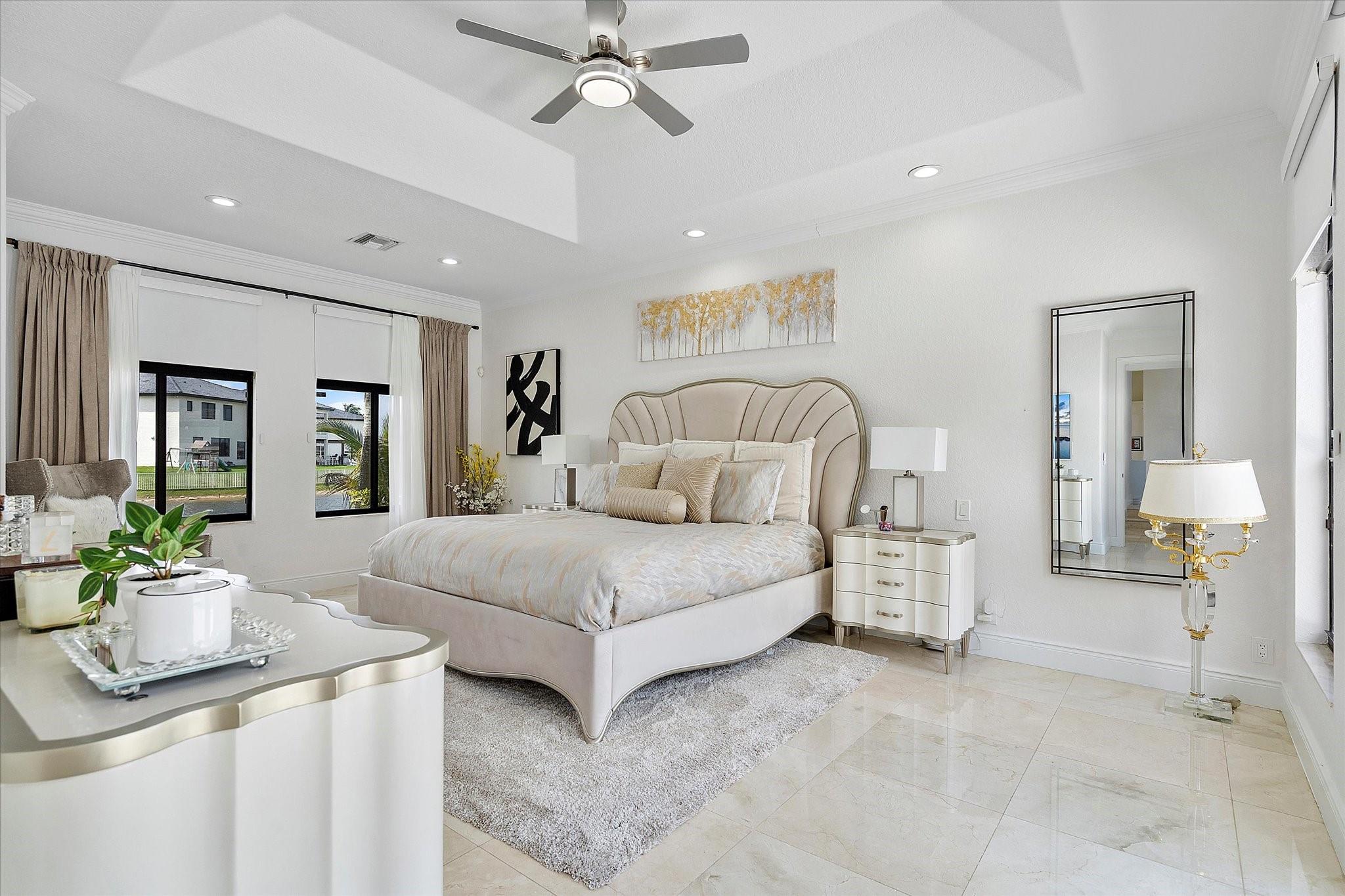 Experience luxury living in the prestigious Sunset Lakes community! This beautifully remodeled lake front home features 7-bedroom, 5-bath, an inviting courtyard with an open floor plan and elegant marble flooring throughout. Recent upgrades include NEW interior and exterior paint, a NEW tile roof, and NEW gutters. Enjoy breathtaking lake and pool views from the NEW balcony. The chef-inspired kitchen boasts modern appliances and Calcutta quartz countertops. An attached guest house with a full bath offers privacy for guests. Attached 3 car garage. Relax in the exquisite marble patio & pergola or the NEW Saltwater pool. Don’t miss this incredible opportunity! See additional features list in photos.