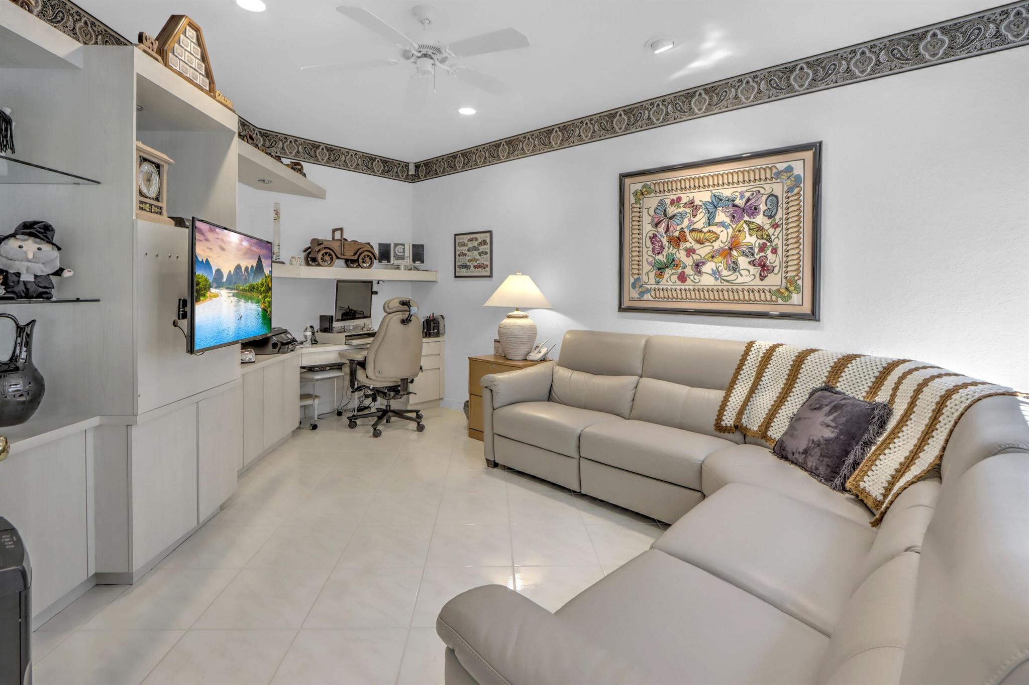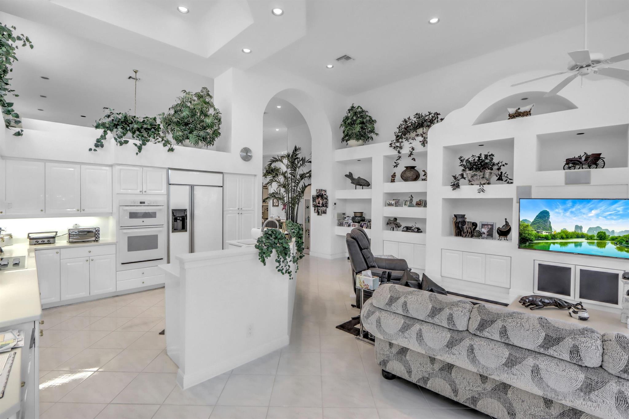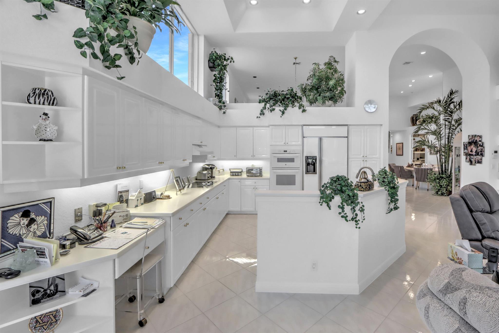 Tranquil lake views and sunlight fill this one-story home of 3 bedrooms plus an office - open & bright featuring volume ceilings with LED high-hat lighting; white neutral tile floors & beige carpeting; and a spacious open kitchen with white 42'' high-gloss cabinetry. The Primary Suite offers his & hers marble bathroom with elevated toilets; the Library has a built-in desk and shelves; the Living Room has a built-in wet bar with refrigerator and the Garage has epoxy flooring. Other features include sold core molded doors; central vacuum & water filtration systems; interior surveillance cameras. The backyard offers a screened patio & an open area with a pool & spa overlooking the lake. Offered furnished or unfurnished at the same price. Roof replaced in 2017.