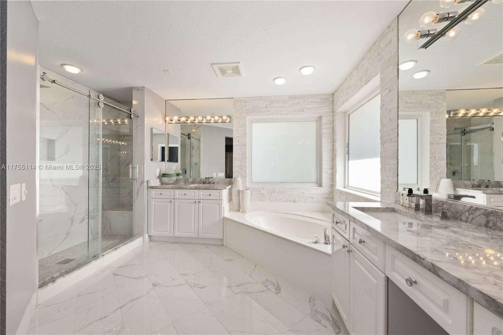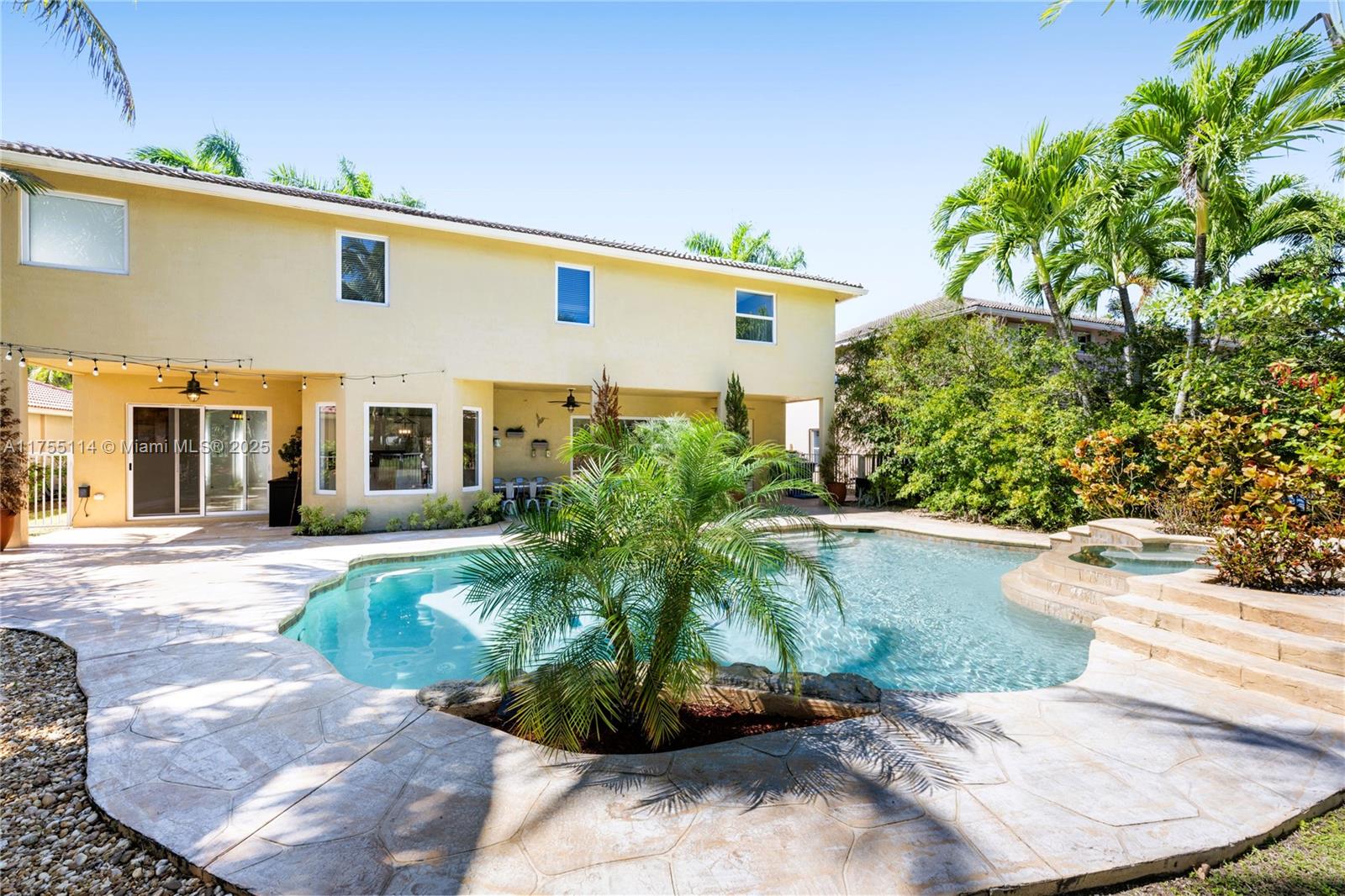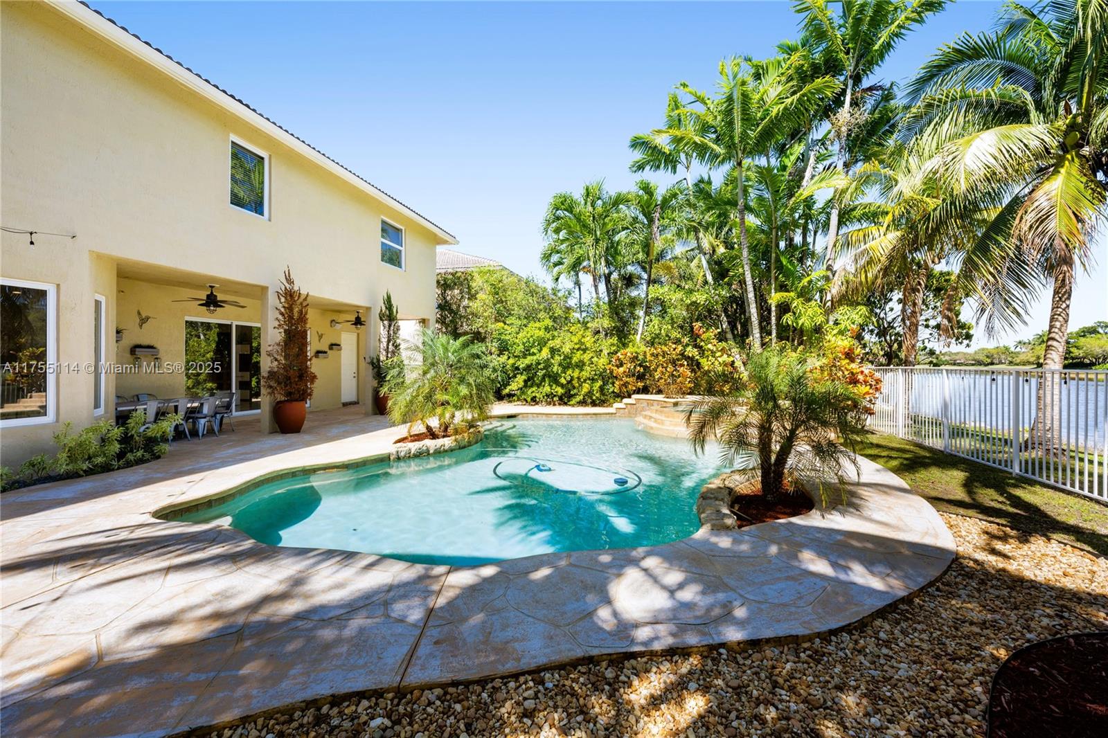 Welcome to this exceptional lakefront residence in the exclusive, resort-style gated community of Savanna. This stunning 5-bedroom, 4-bathroom home features a cabana bath, an office, and a versatile exercise room easily converted into a sixth bedroom. Enjoy an organic-shaped pool and jacuzzi, surrounded by lush tropical gardens with breathtaking lake views. The interior boasts marble floors on the main level, engineered wood upstairs, and an amazing spa-inspired guest bathroom. Brand-new 2024 hurricane-proof doors and windows provide security and elegance. The 3-car garage is designed as a man cave, teen hangout, or game room. Freshly painted and move-in ready, this home offers spectacular entertainment spaces, A+ schools, and world-class community amenities.