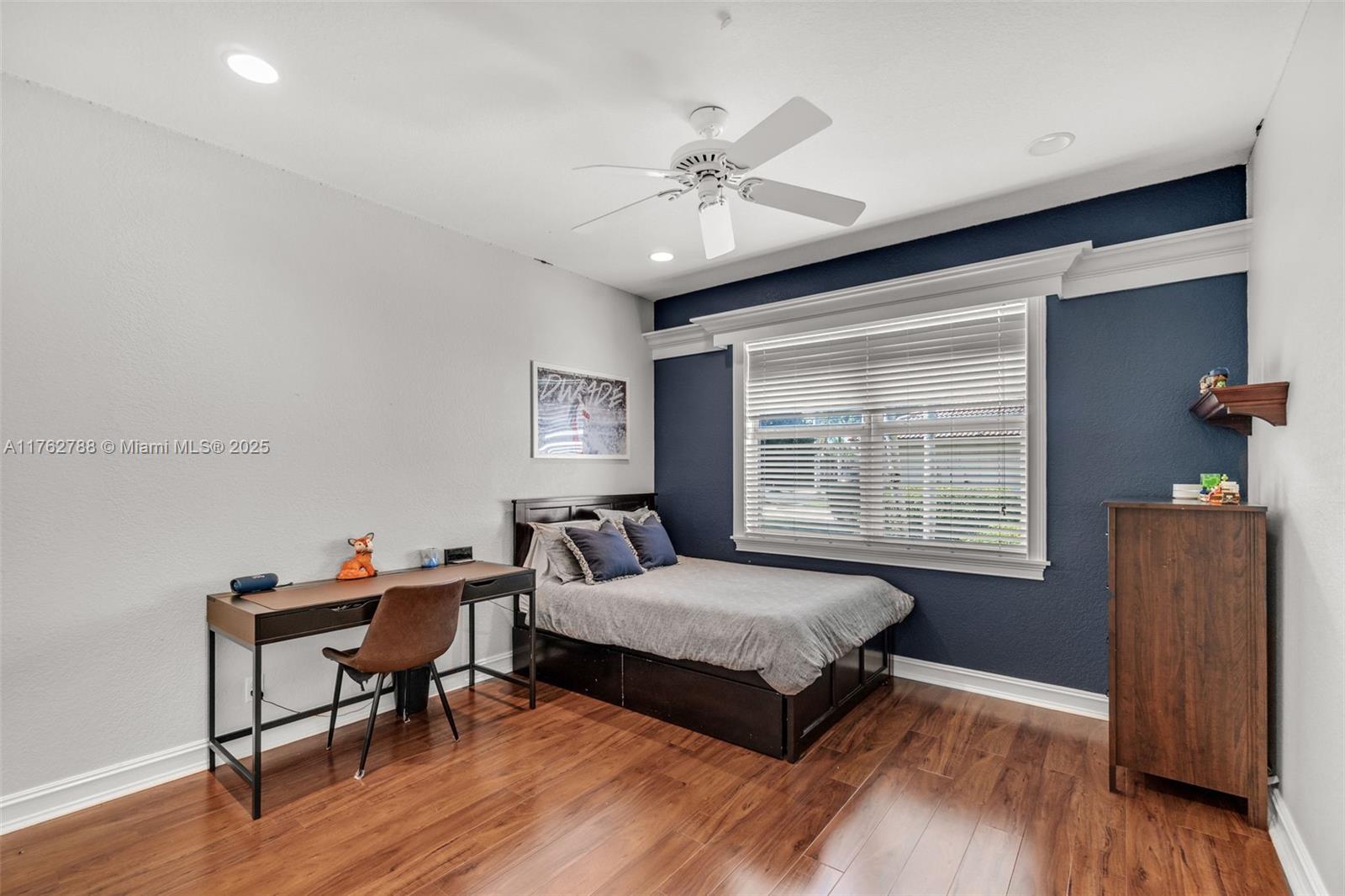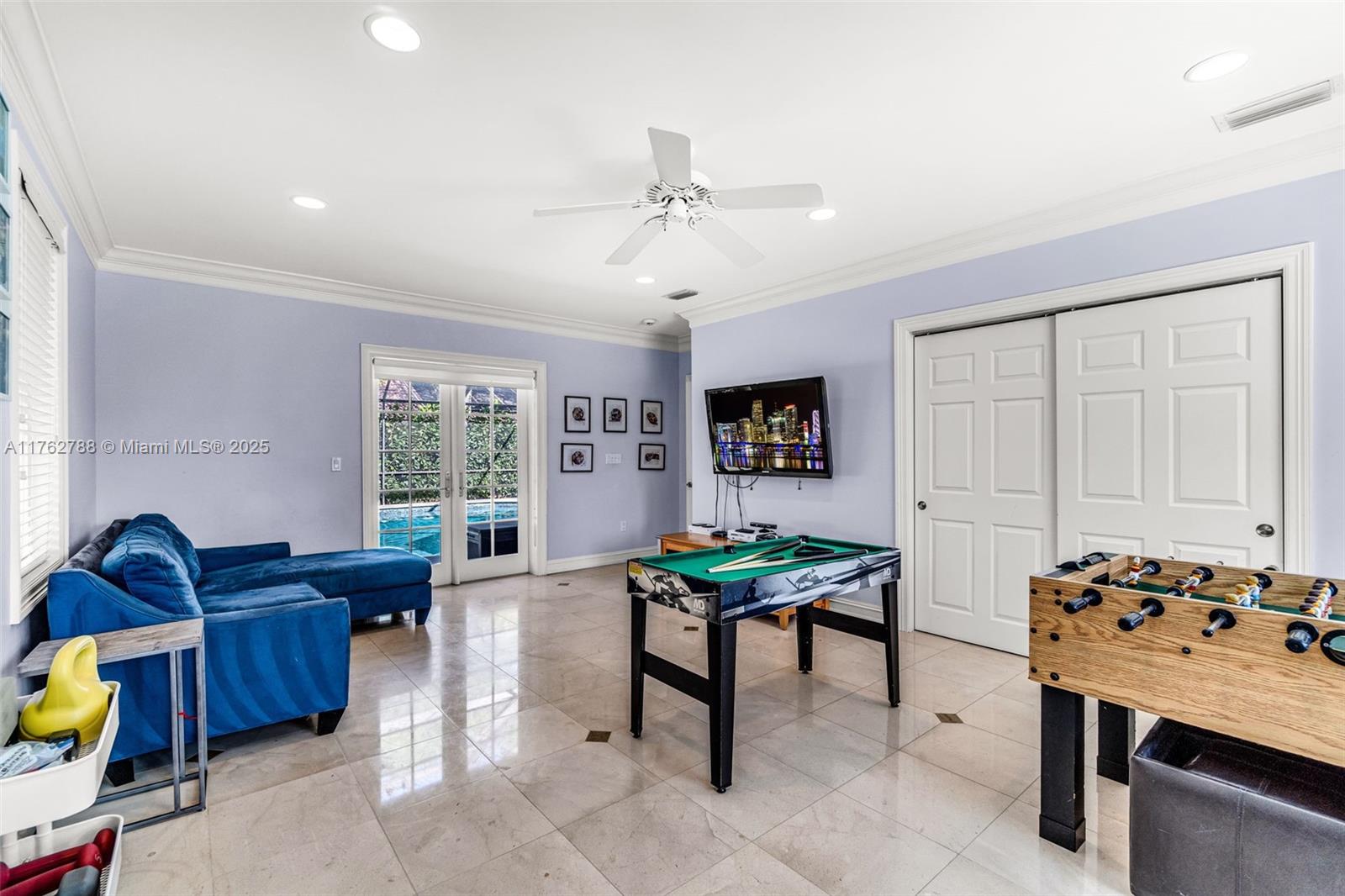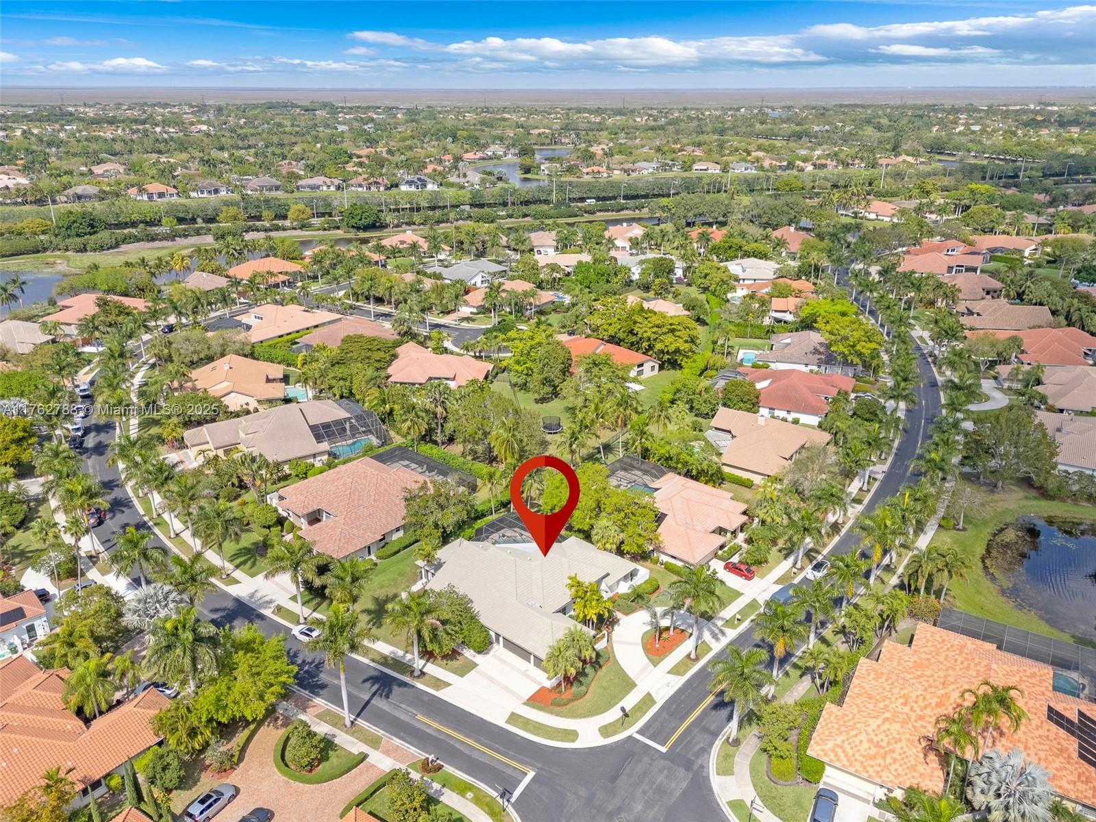 Nestled in the highly sought-after Palm Island community in Weston, this stunning corner-lot home offers A-rated schools and luxury living! Enjoy breathtaking pool view throughout, soaring ceilings, crown moldings, and abundant natural light. Gourmet kitchen features exquisite Taj Mahal countertops and a wine fridge, while custom closets provide ample storage. French doors open to a serene backyard with a saltwater pool, covered patio, and lush privacy hedges. The huge 5th bedroom can serve as a playroom or an extra master suite. Updated primary bathroom, with engineered hardwood floors in primary bedroom, Murphy bed in one of the bedrooms making it spacious. A circular driveway plus an additional side driveway offer plenty of parking. Steps from the community park—this home is a must-see!