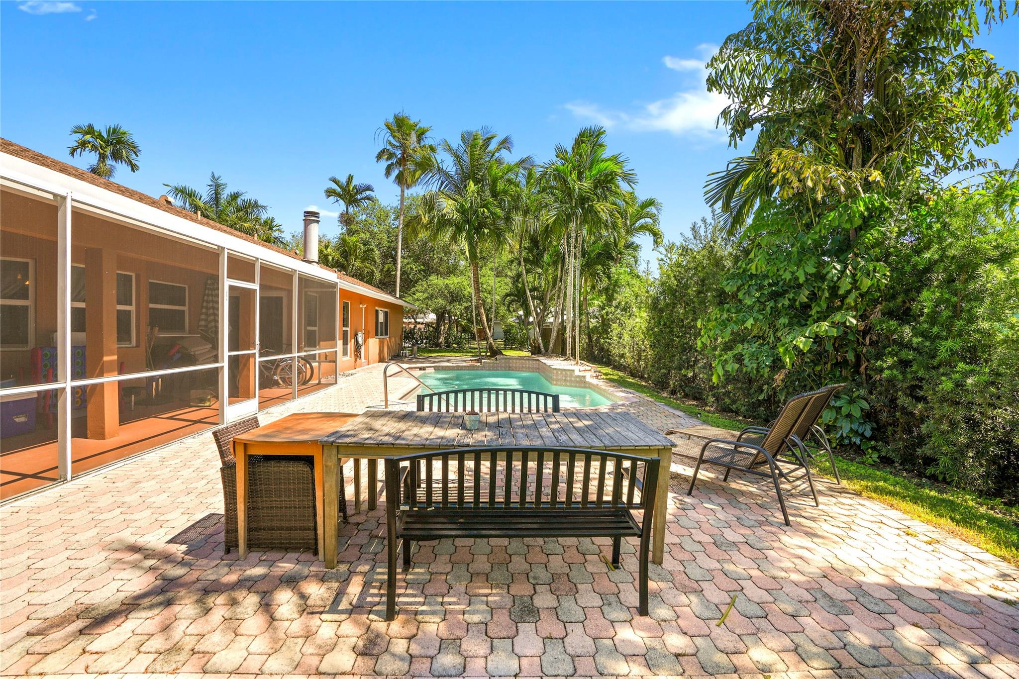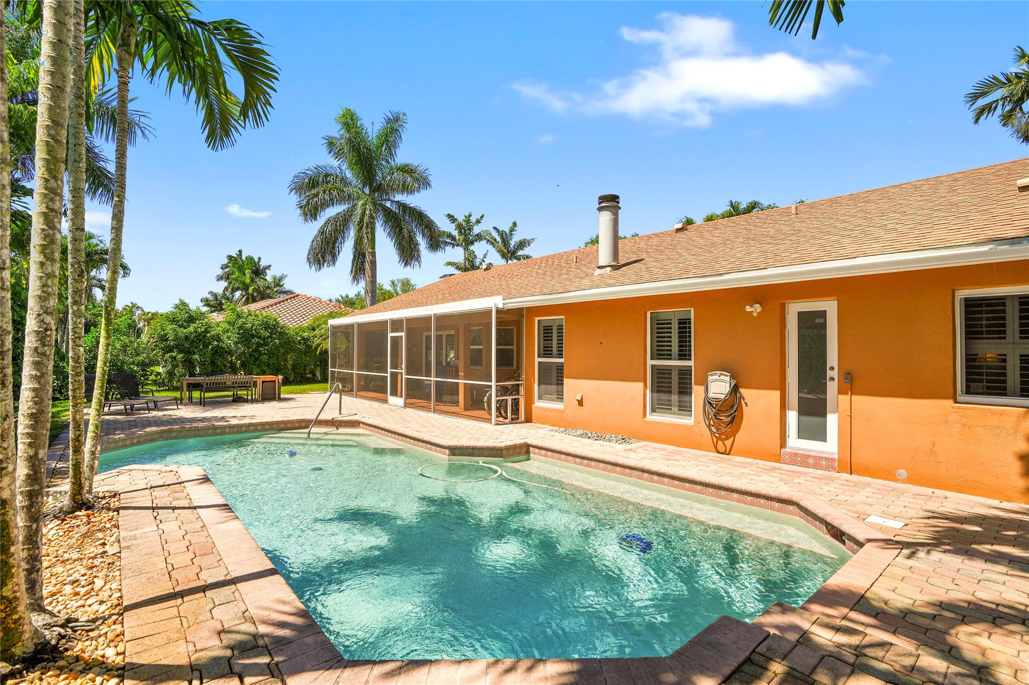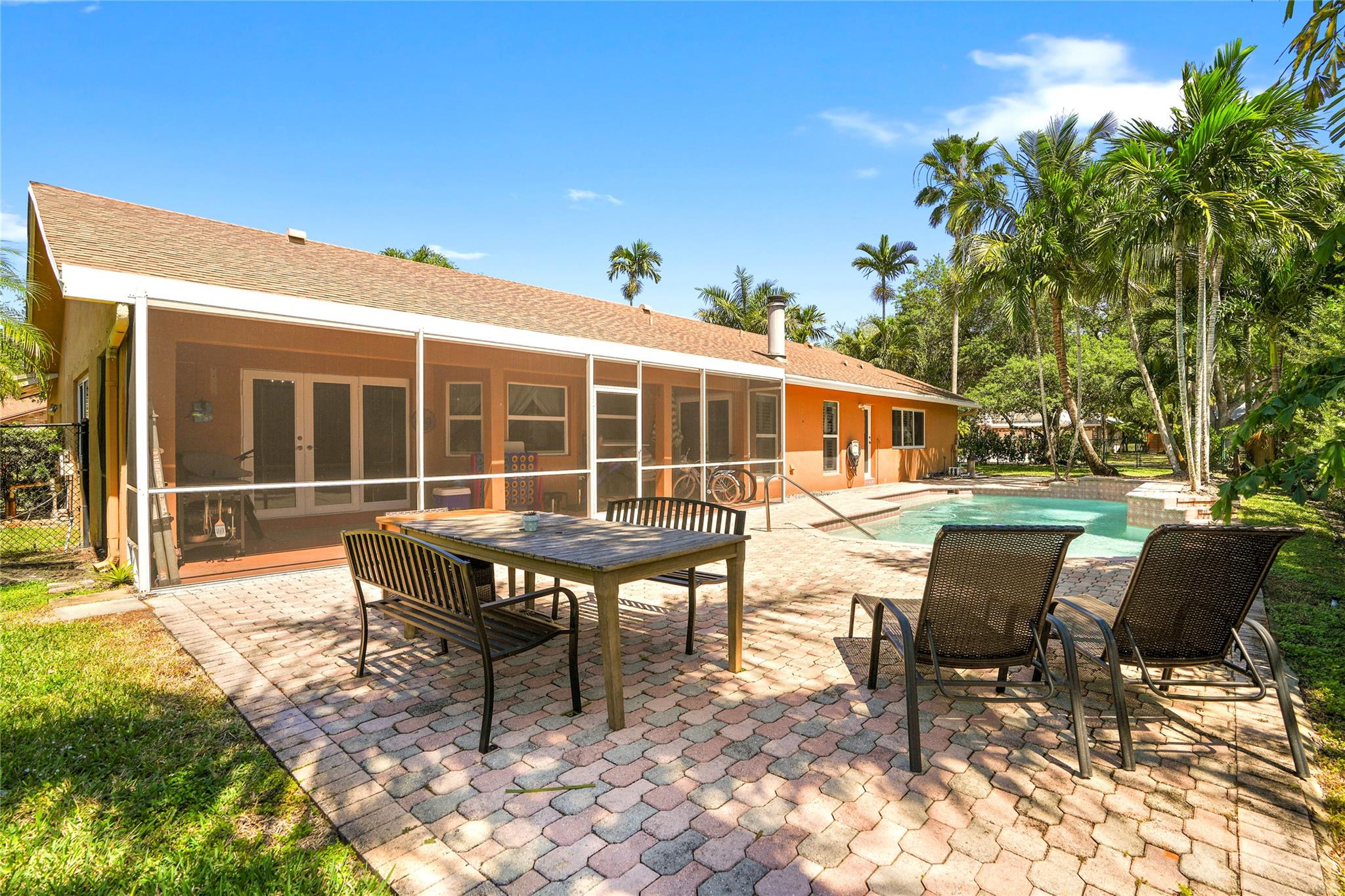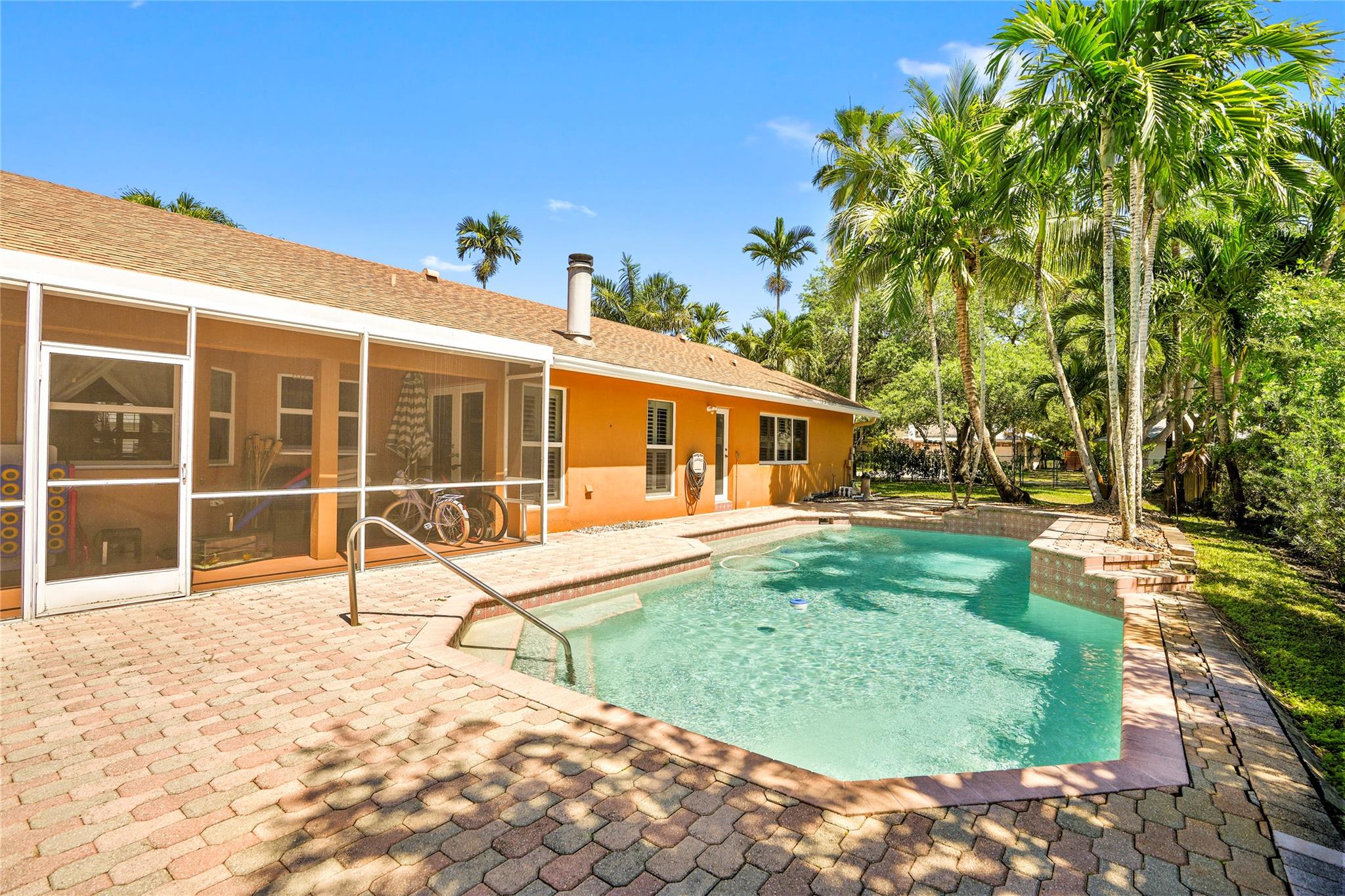 This modern style 3-bed, 2-bath ranch in Pasadena Estates sits on an oversized 1/3+ acre corner lot. Enjoy an open layout with vaulted ceilings, large-format tile, and northern exposure. It features formal dining, a living room with a fireplace, and a family room. The new farmhouse kitchen boasts white shaker cabinets, a blue island with a cooktop, quartz countertops, and stainless steel appliances. The master suite offers a walk-in closet and new bath. Two spacious bedrooms share an updated cabana bath. Outside, a screened patio overlooks a tropical pool, paver sun deck, and large fenced yard. Additional features include a large laundry room, impact windows/doors, new AC, newer fencing, and a 2015 roof. Top-rated schools are nearby