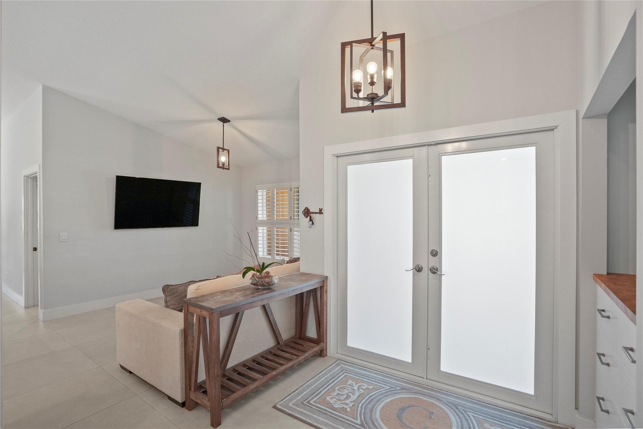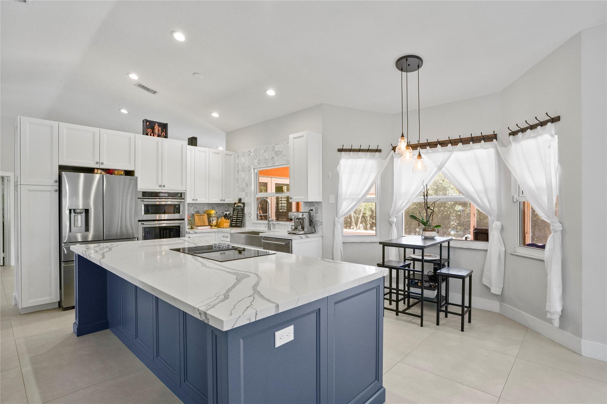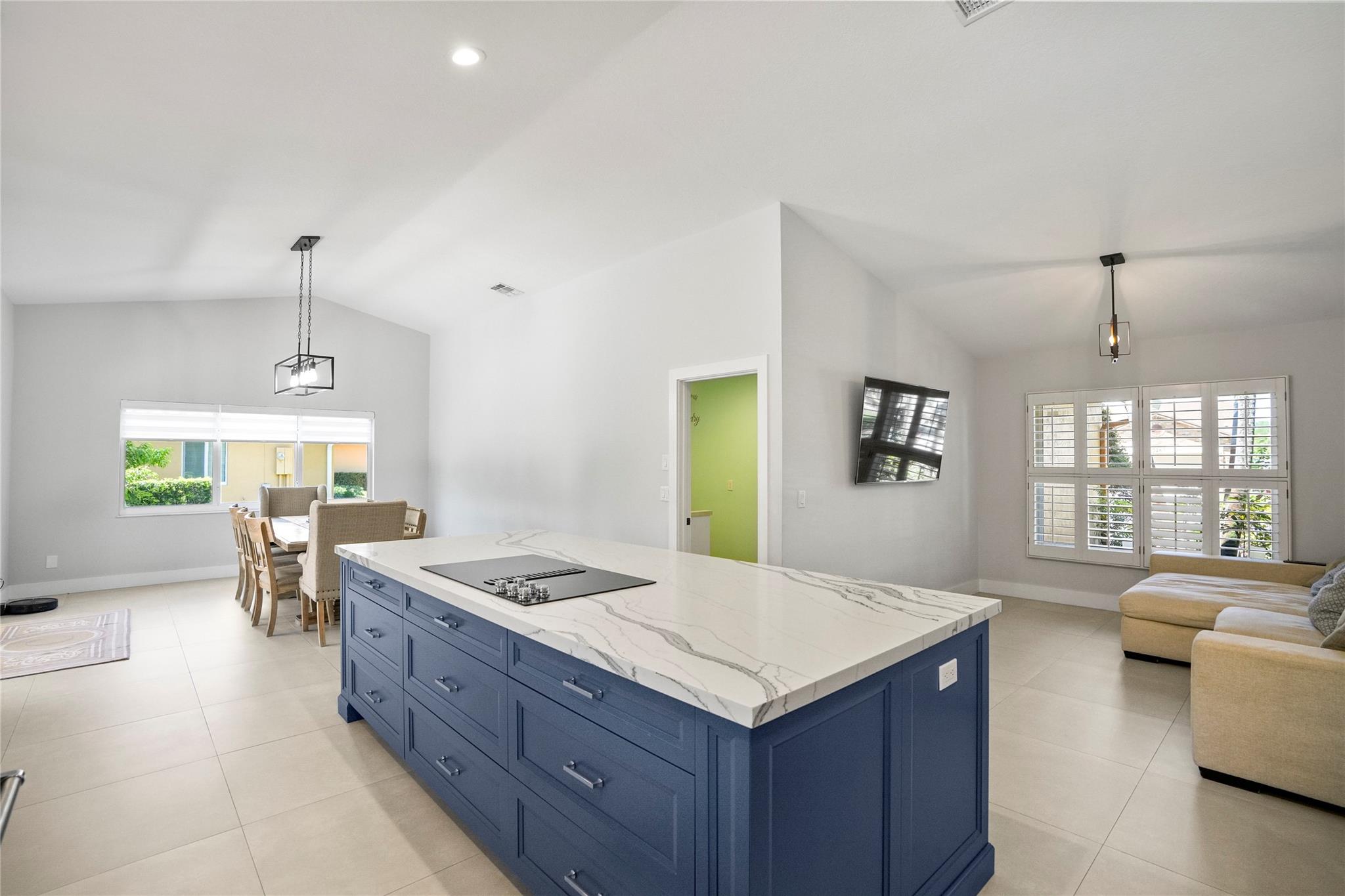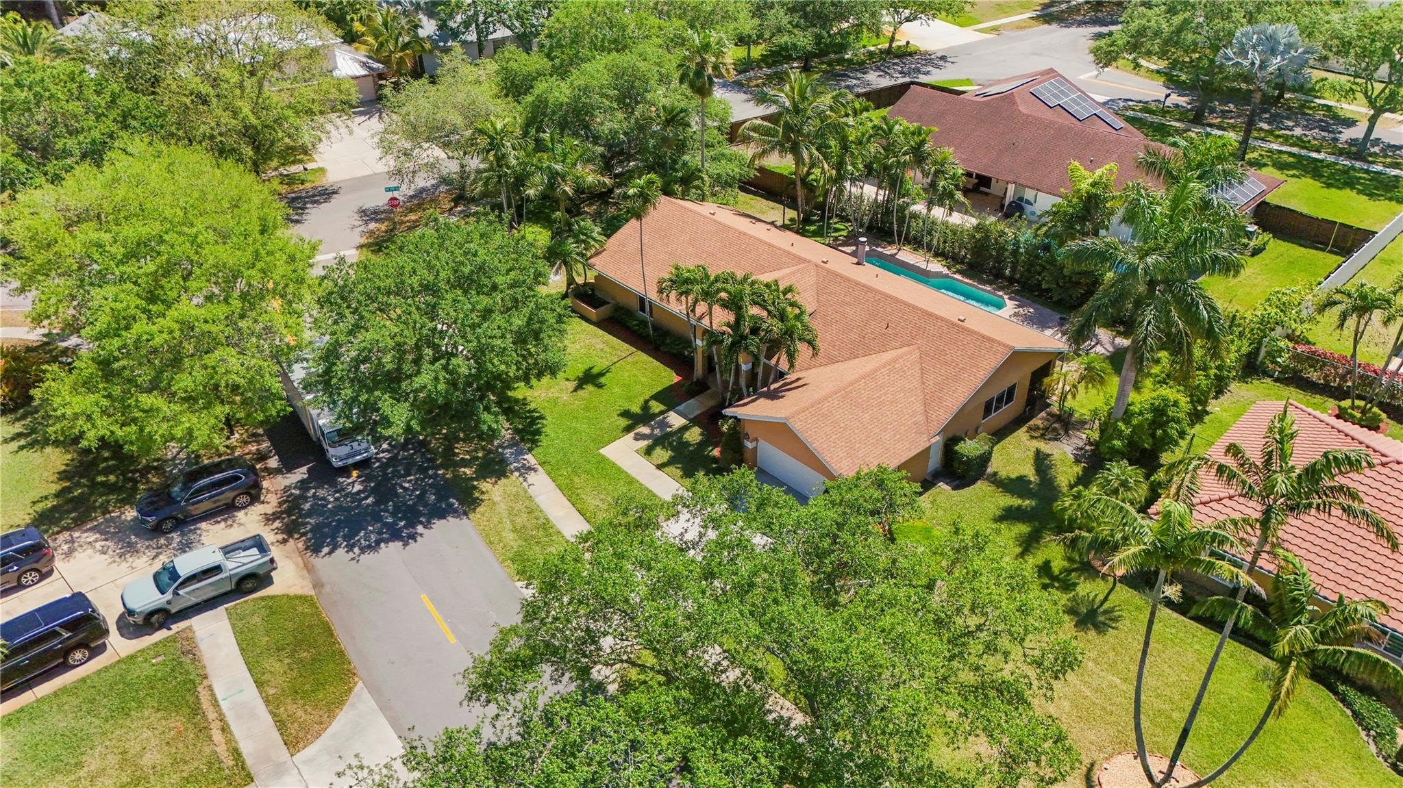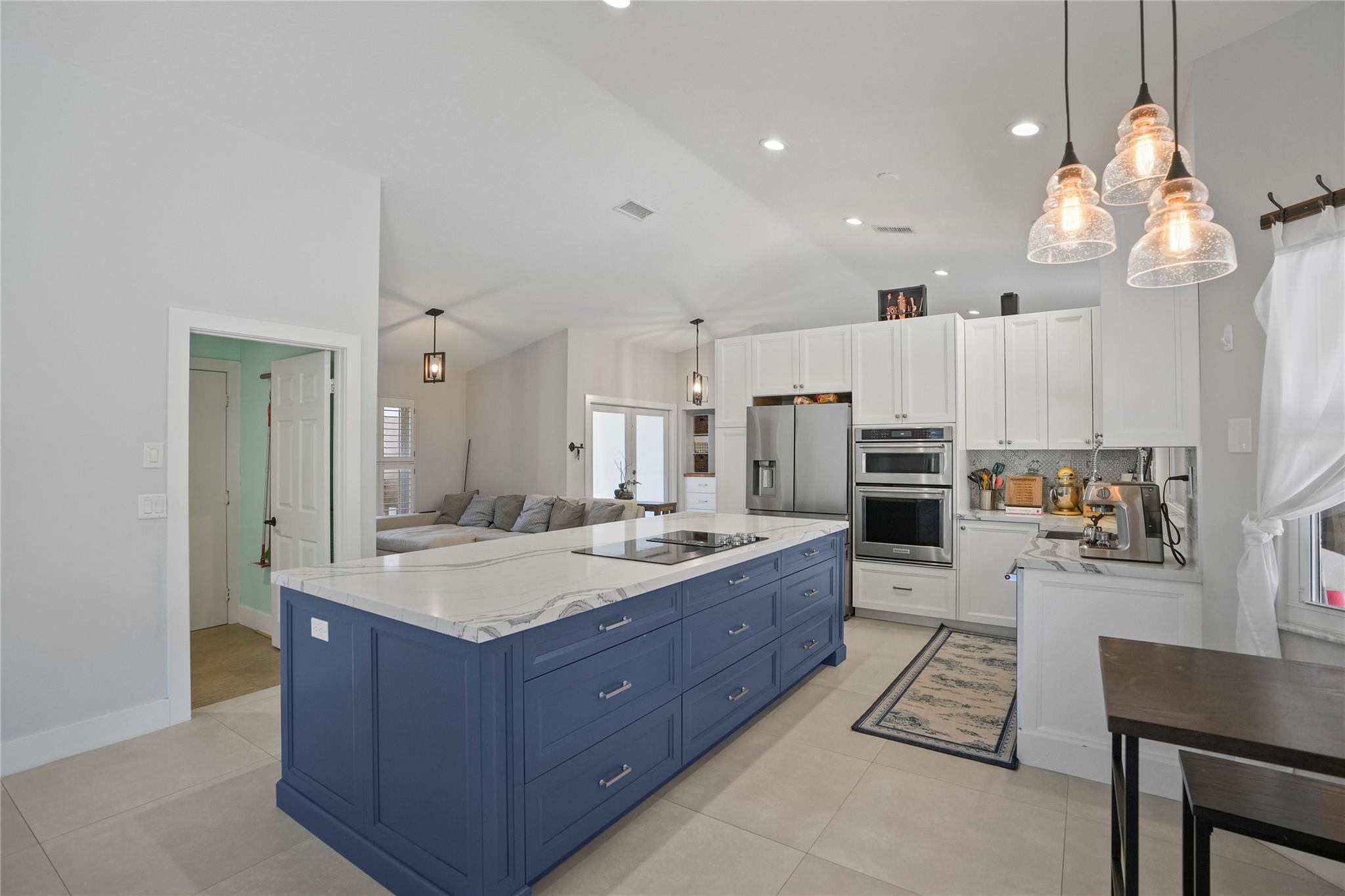 This modern style 3-bed, 2-bath ranch in Pasadena Estates sits on an oversized 1/3+ acre corner lot. Enjoy an open layout with vaulted ceilings, large-format tile, and northern exposure. It features formal dining, a living room with a fireplace, and a family room. The new farmhouse kitchen boasts white shaker cabinets, a blue island with a cooktop, quartz countertops, and stainless steel appliances. The master suite offers a walk-in closet and new bath. Two spacious bedrooms share an updated cabana bath. Outside, a screened patio overlooks a tropical pool, paver sun deck, and large fenced yard. Additional features include a large laundry room, impact windows/doors, new AC, newer fencing, and a 2015 roof. Top-rated schools are nearby