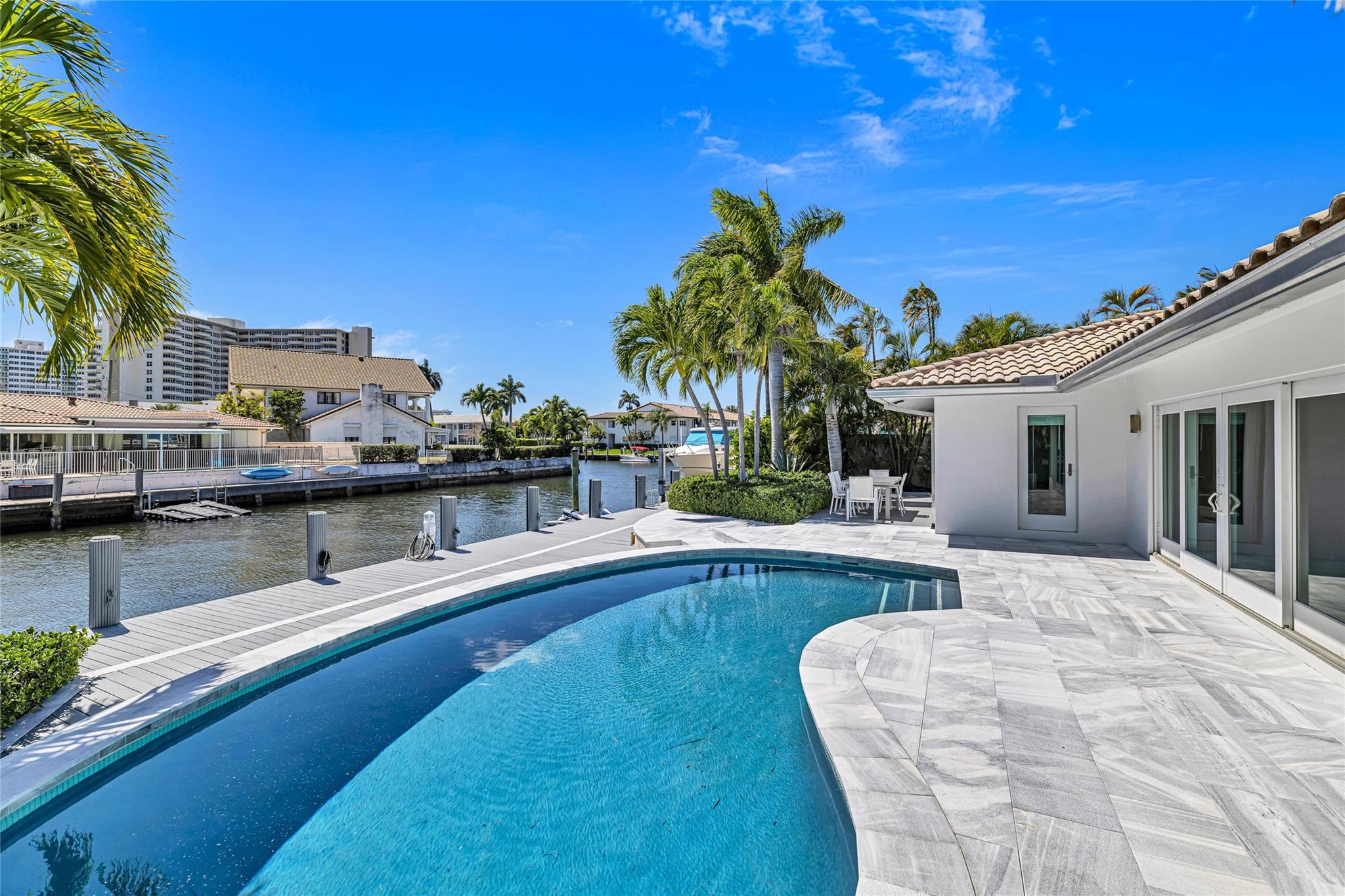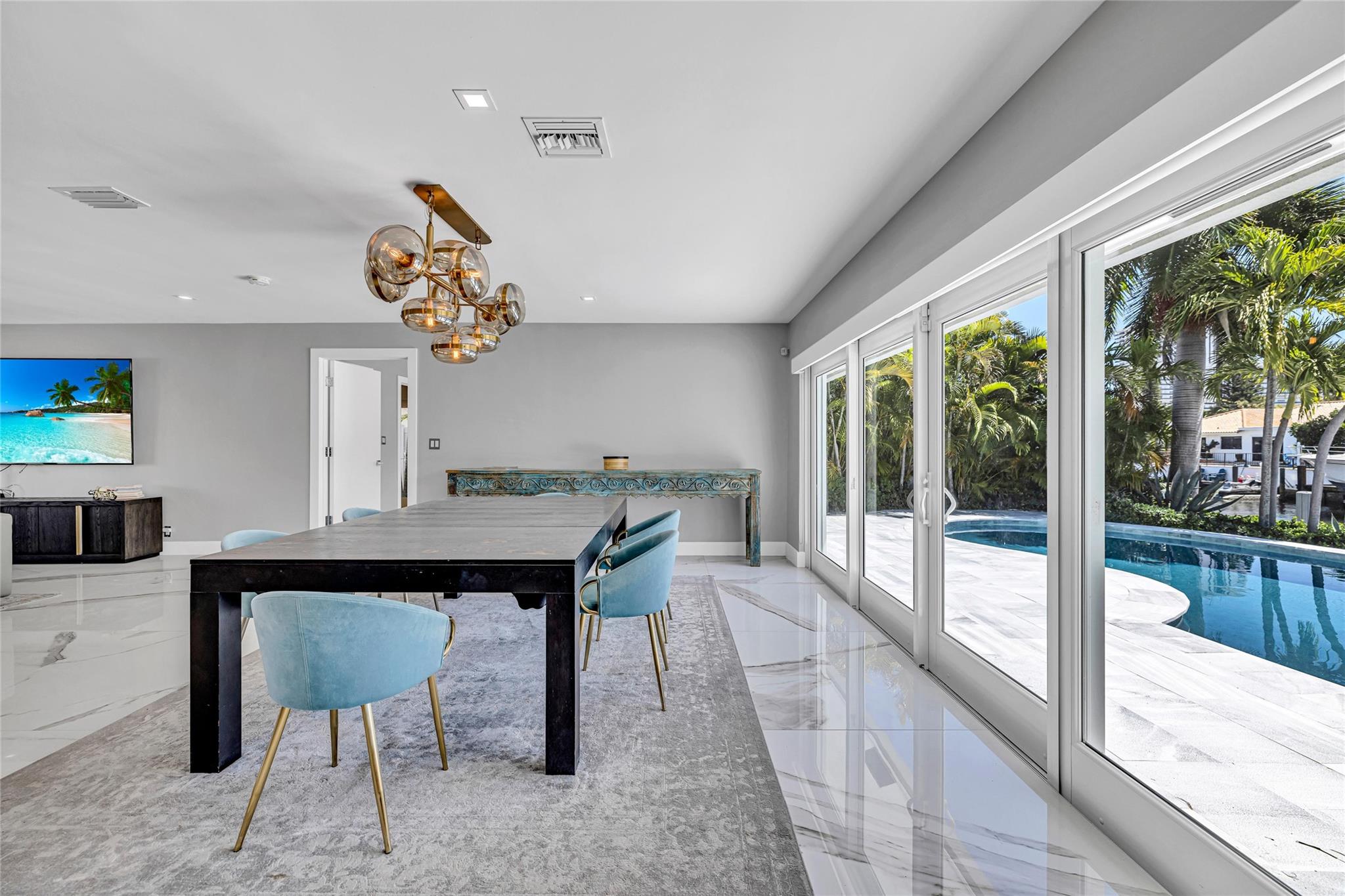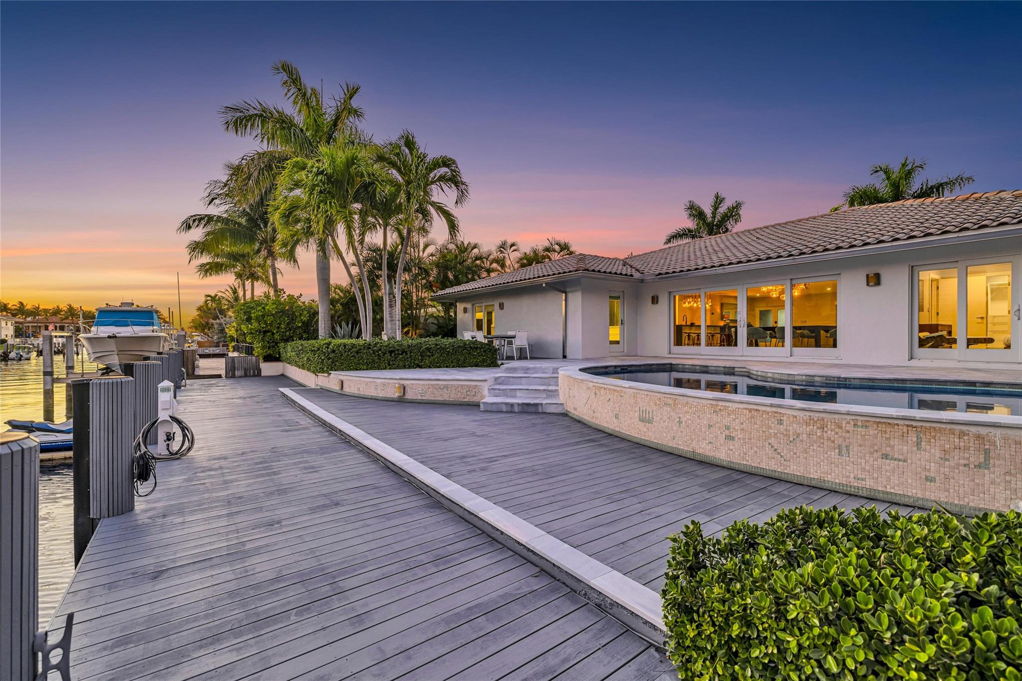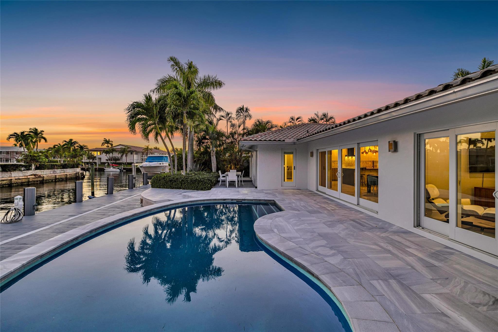 Outstanding waterfront home blocks to the beach in gated Bermuda Riviera. Modern interiors blend seamlessly with the outdoors through wide, sliding glass to a tiered patio and dock surrounding the pool. Designed for entertaining, the kitchen features a long center island, modern appliances and ample storage. The split plan allows each bedroom to enjoy privacy. The primary suite is a quiet retreat with sliders out to the pool, a massive walk-in closet and a 13 x 18 foot bathroom featuring a multi-spray shower. All three baths are updated in modern finishes. 16 foot squares of porcelain flooring is consistent throughout the house. The oversized garage has twin bays with extra wide doors. Multiple dining and shopping options are located within minutes of the property. Home Warranty Included