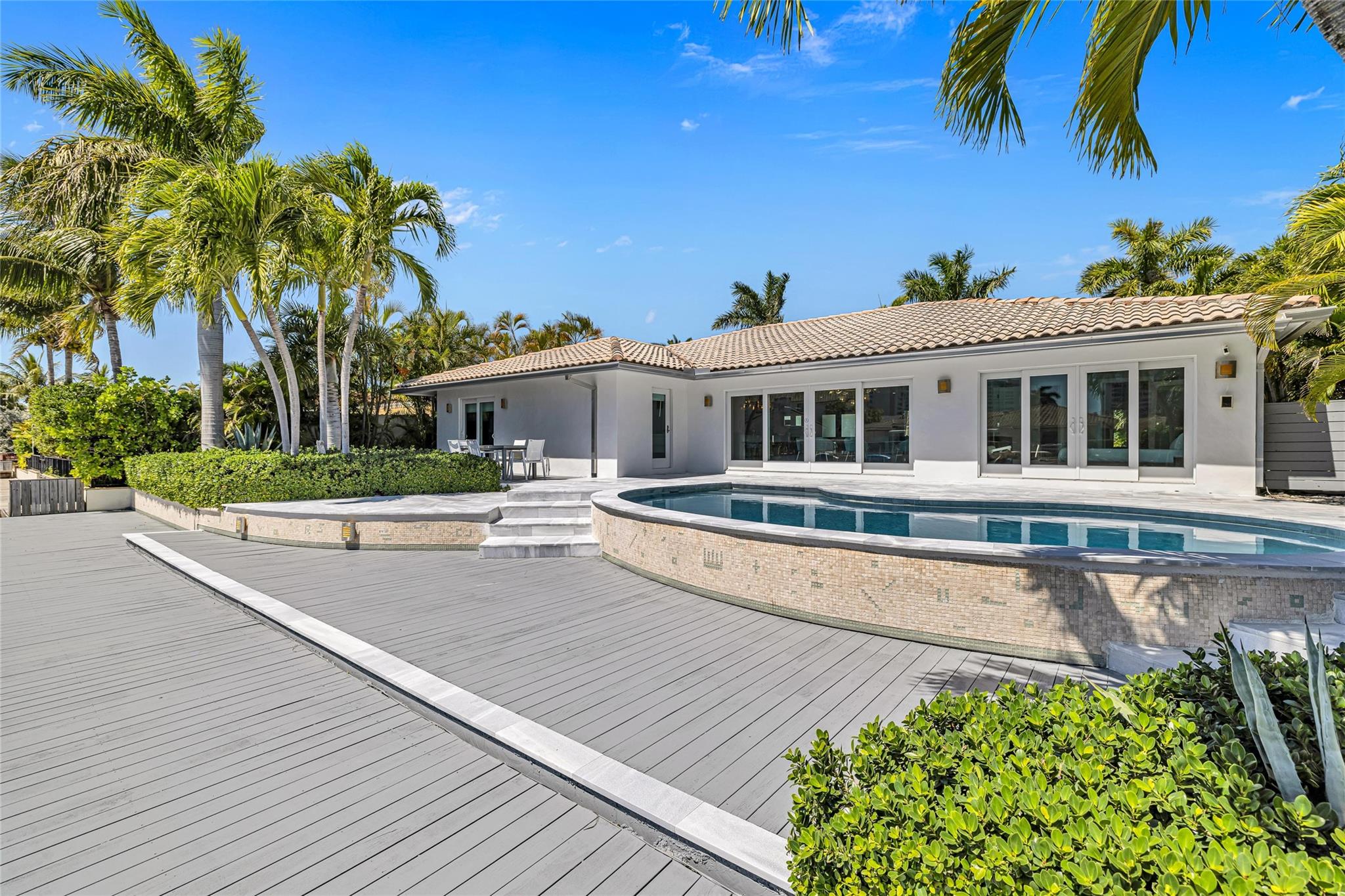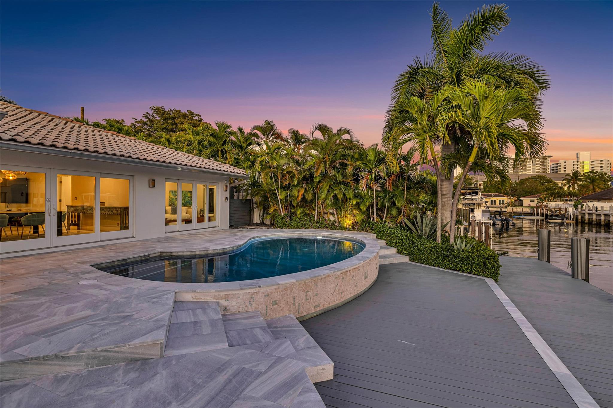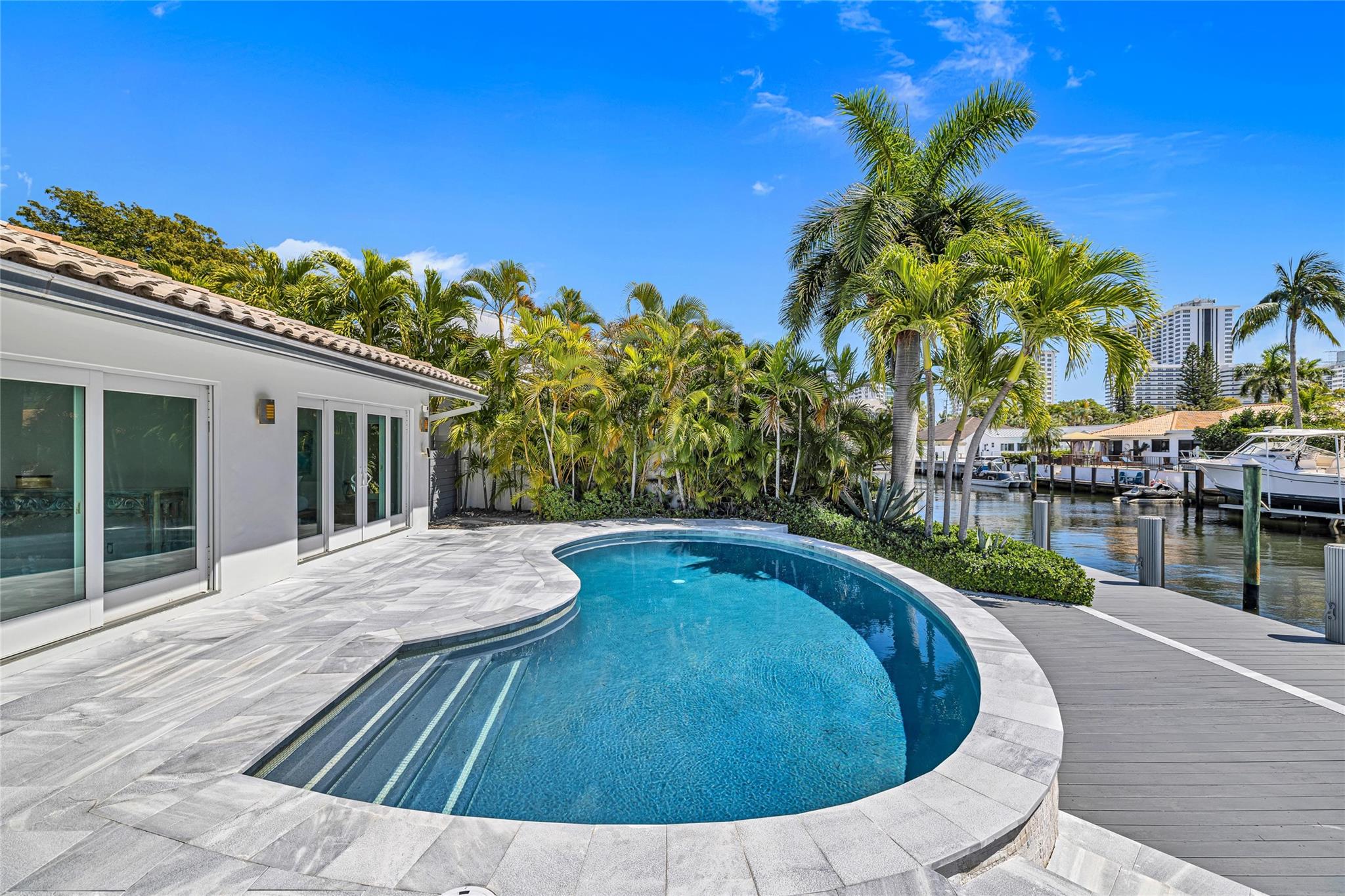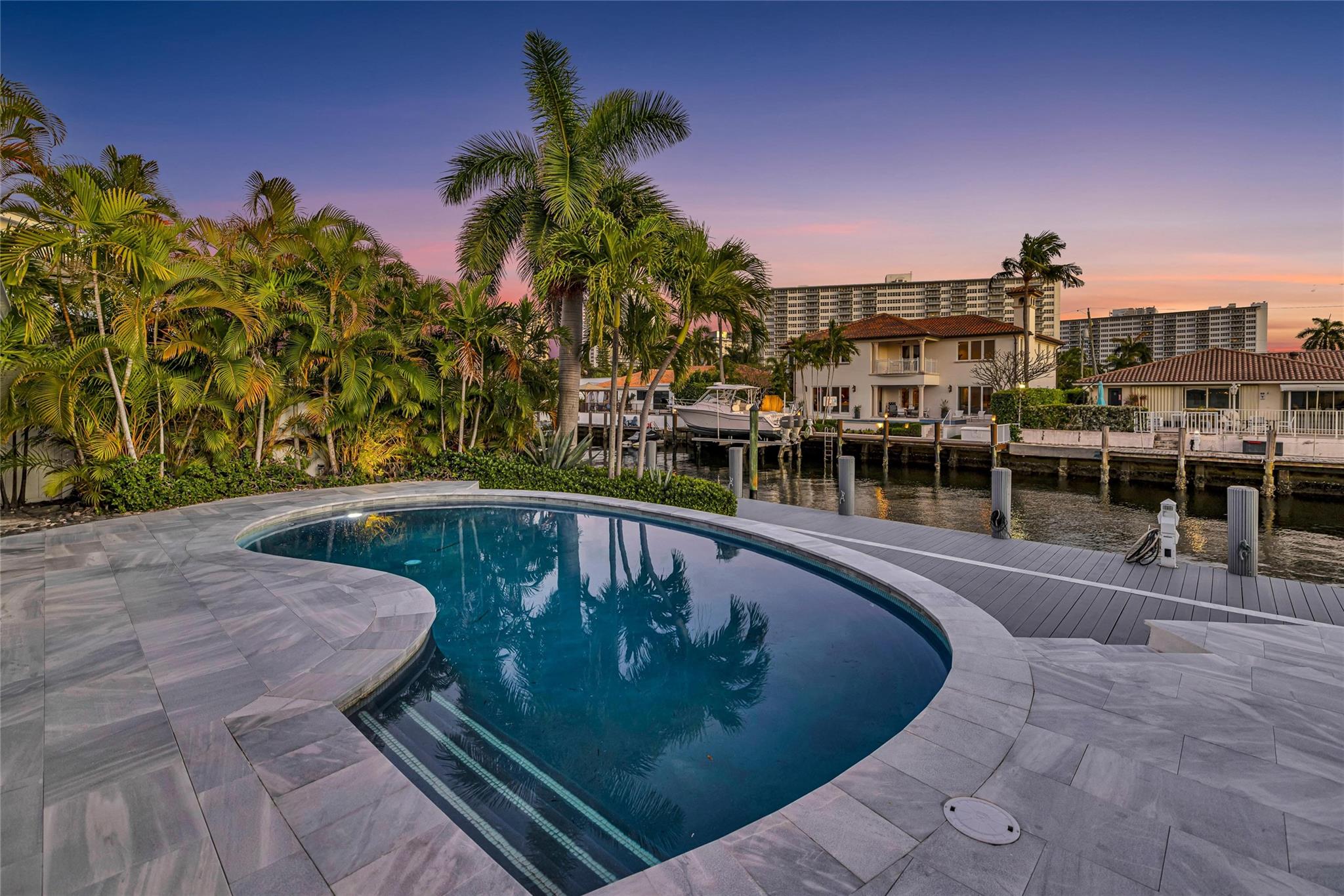 Outstanding waterfront home blocks to the beach in gated Bermuda Riviera. Modern interiors blend seamlessly with the outdoors through wide, sliding glass to a tiered patio and dock surrounding the pool. Designed for entertaining, the kitchen features a long center island, modern appliances and ample storage. The split plan allows each bedroom to enjoy privacy. The primary suite is a quiet retreat with sliders out to the pool, a massive walk-in closet and a 13 x 18 foot bathroom featuring a multi-spray shower. All three baths are updated in modern finishes. 16 foot squares of porcelain flooring is consistent throughout the house. The oversized garage has twin bays with extra wide doors. Multiple dining and shopping options are located within minutes of the property. Home Warranty Included