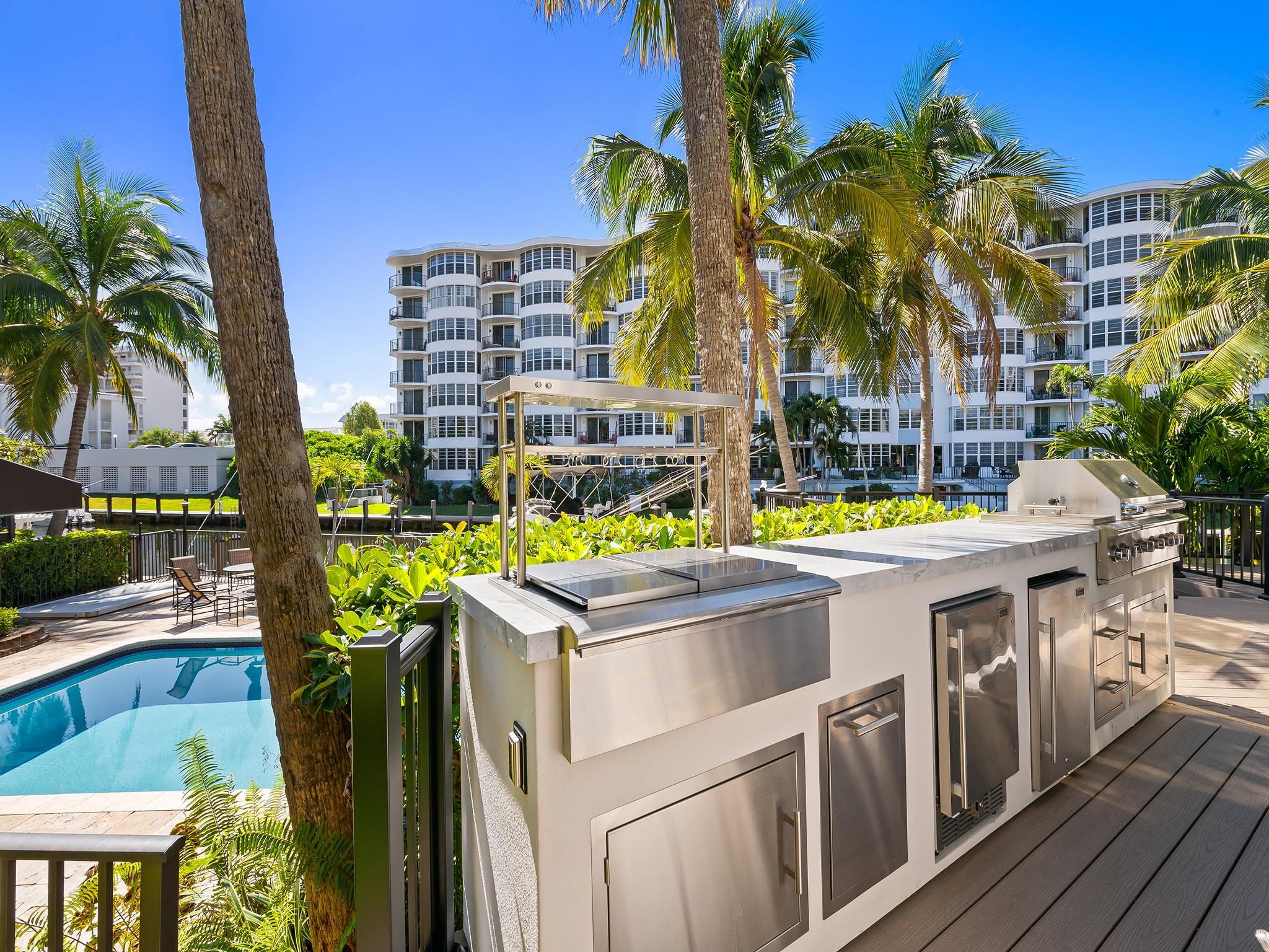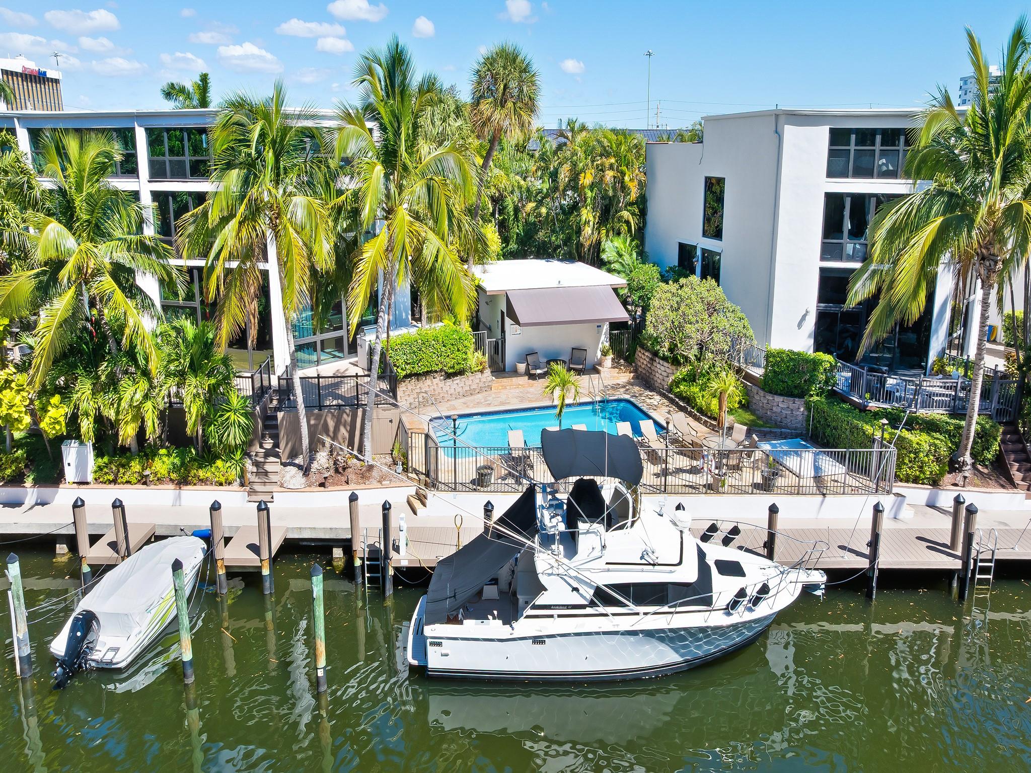 Step into unparalleled luxury & modern elegance with this impeccably remodeled 2 bed, 2.5 bath + loft waterfront corner townhome with a 32' boat slip. Every inch of this home exudes sophistication, with custom millwork, flawless finishes, breathtaking design elements, & water views. The gourmet eat-in kitchen showcases a striking island with premium counters, Wolf & Sub-Zero appliances, & wine refrigerators. Both bedrooms feature spa-like en-suite baths, plus a stylish powder room. Recent upgrades include a new roof, A/C, impact glass windows, & advanced electrical systems. Outside, enjoy the new deck overlooking your boat with a Paradise Grills summer kitchen. A truly exceptional Smart home in the coveted Coral Ridge neighborhood you must experience firsthand!