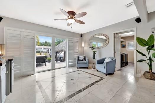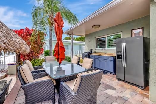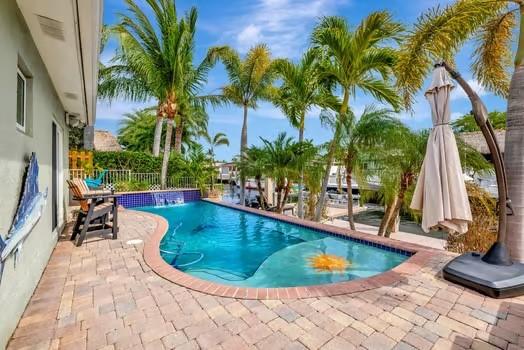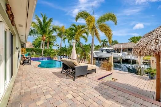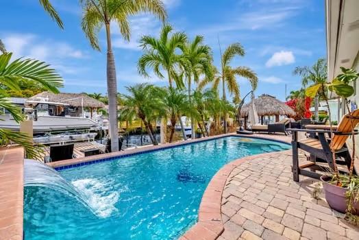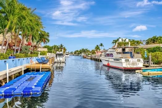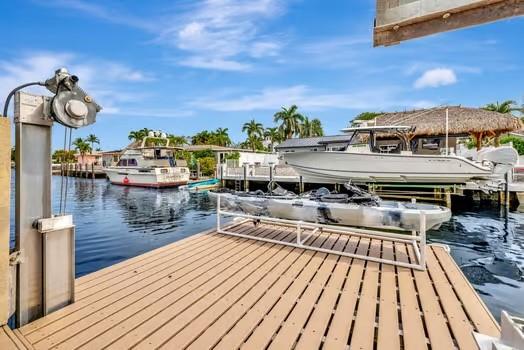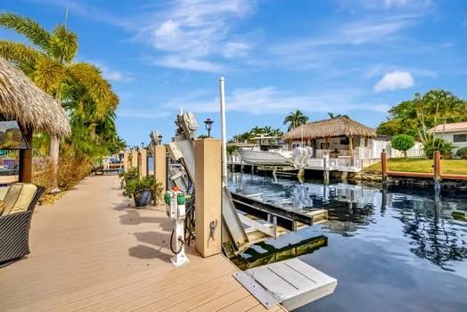 Paradise awaits! Discover your new waterfront home in Pompano Beach, featuring NO FIXED BRIDGES and 77 feet of water frontage with a composite dock and direct ocean access. Boating enthusiasts will love the remote-controlled 25,000 lb boat lift and submersible jet ski lift. Step into your private resort-style backyard, complete with a heated pool, outdoor kitchen, and a luxurious tiki hut equipped with lighting, surround sound, cable, and a ceiling fan. Inside, this beautifully designed home offers 3 bedrooms, 2 bathrooms, a spacious interior laundry room, and a attached garage. The open floor plan includes two living areas and an oversized, remodeled kitchen—perfect for entertaining. All of this is just blocks from the beach, top-rated restaurants, shopping, and private schools.