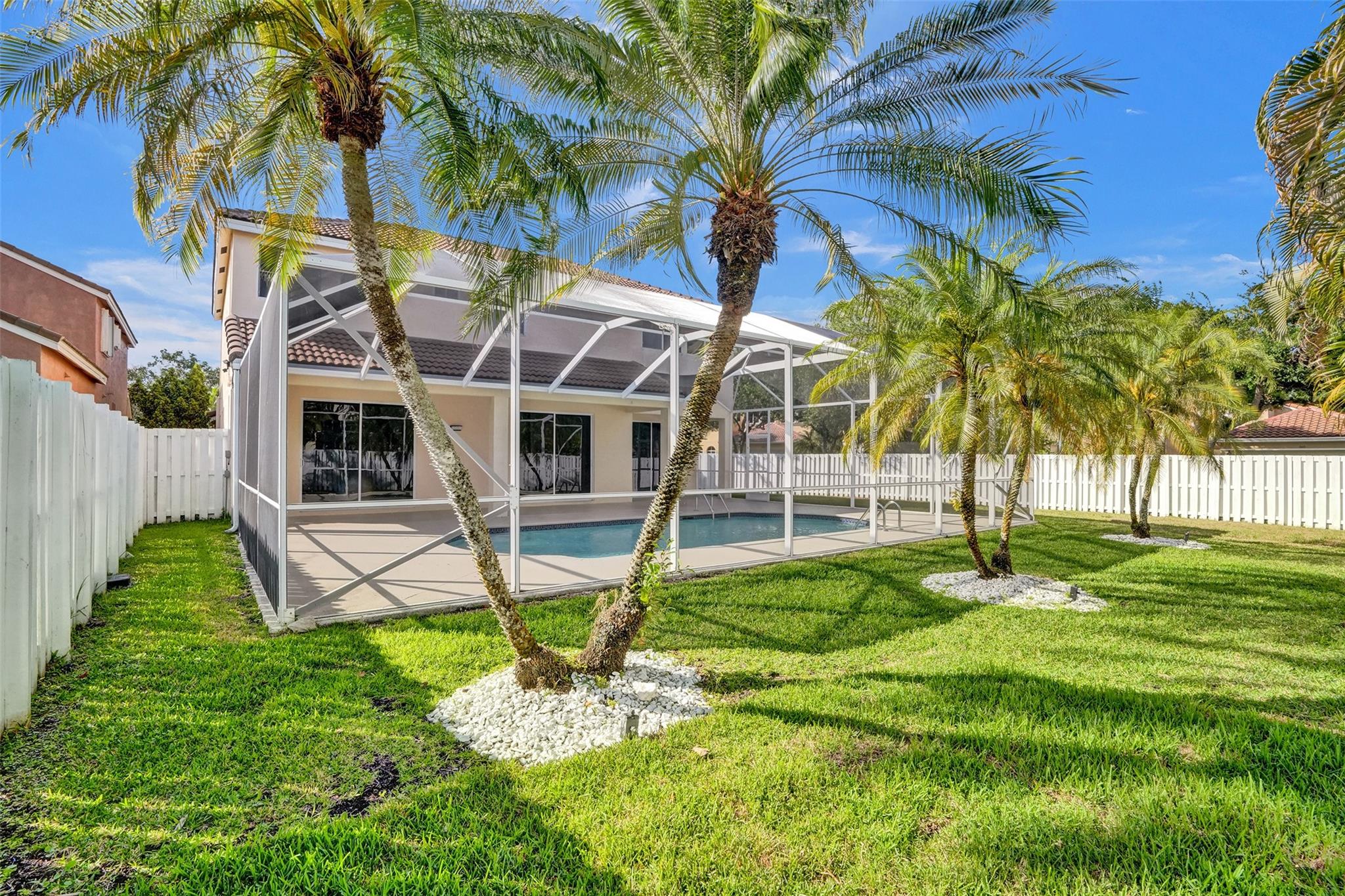 Beautiful Weston 5 bedroom / 3 full bathroom salt water pool home in the exclusive gated community of 'The Falls'. 2022 S-tile roof! First floor den can be converted to 5th bedroom. Primary Bedroom has 2 walk-in closets, ensuite bathroom with dual sinks, a separate shower and Roman size Jacuzzi tub. Brick paver walkway leads to your double door entry. Dramatic volume living ceilings make this home feel extra spacious. Large eat-in kitchen with plenty of cabinets and pantry, granite counters, and stainless appliances. Huge private fenced backyard great for a play area and pets. Fully screened pool with safety fence and covered patio. Walking distance to Eagle Point Elementary and Tequesta Trace Middle schools. Zoned for Cypress Bay High. Great schools and a neighborhood to raise a family!