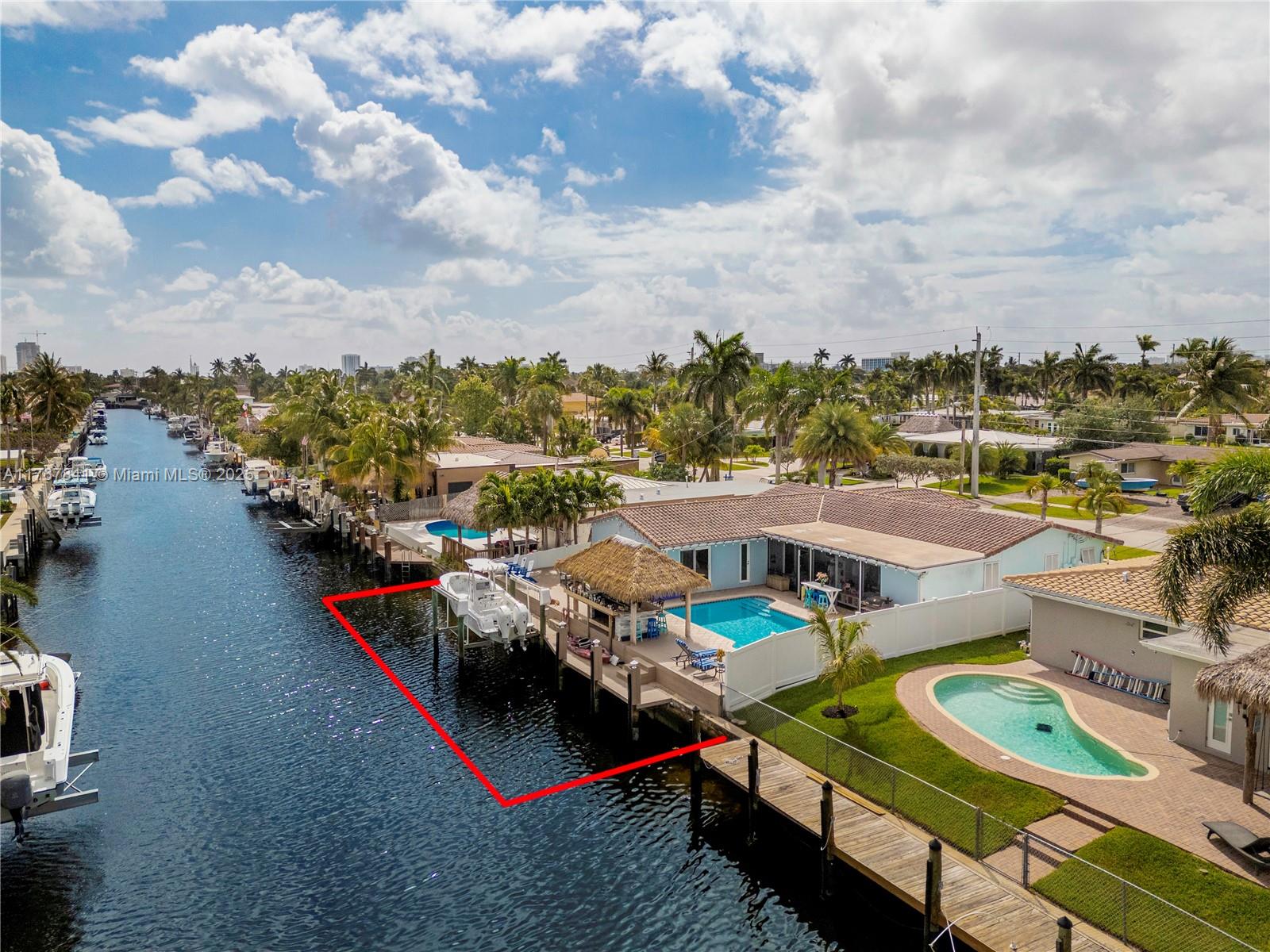 Resort-style living in this waterfront property. Bring your boat to this ocean access, split floor plan home. Complete hurricane windows, doors, and garage door. 3-bedroom, 2-bathroom gem includes a heated pool. 2-car garage is air-conditioned and carpeted & auto garage door opener. NO CAST IRON PIPES, build with PVC. Backyard paradise, complete with a TIKI Bar featuring refrigerators, ice maker, & sink. Enjoy ample room for entertaining under the synthetic palm roof. Take advantage of the $10,000lb four-post boat lift, second bridge clearance same as Federal Highway bridge. The large primary bedroom and bath include a separate shower, whirlpool tub, and walk-in closet. Each bedroom has a walk-in closet. EV charger. East Pompano Beach close to beaches, I-95, shopping & restaurants