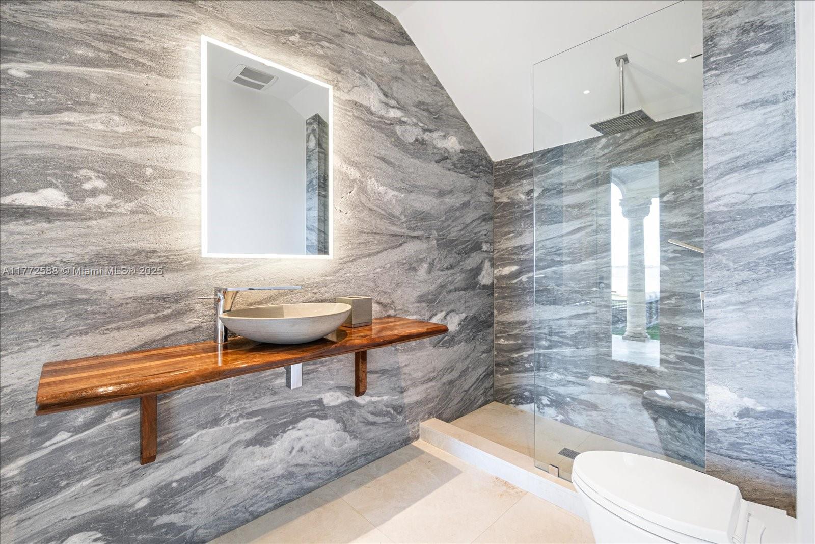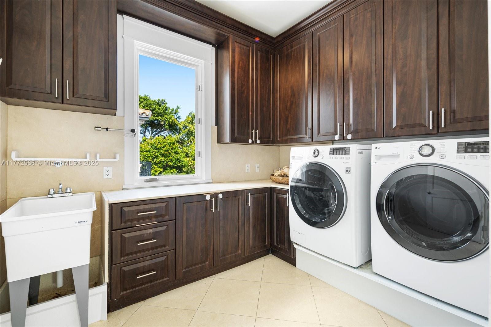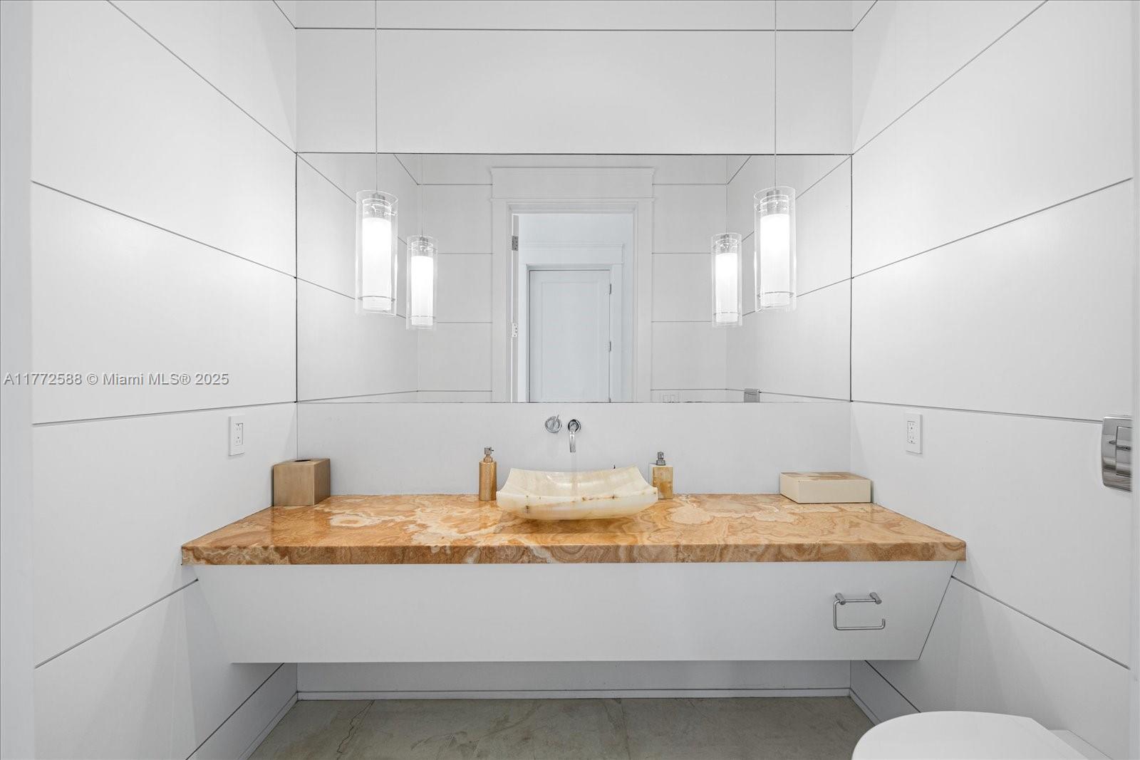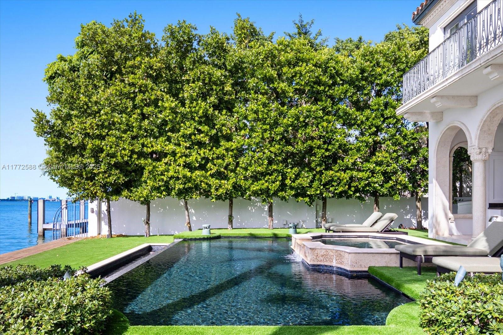 Luxury modern Mediterranean home on prestigious North Bay Road with breathtaking panoramic open bay views. Six bedrooms all with ensuite bathrooms, half bathroom and cabana bath. Featuring grand double height ceiling in entry foyer with stairs either side surrounding intimate sitting area, double master suites, theater/library, den w/fireplace, billiard room, and 12' ceilings throughout. The exterior has large covered patio with chef summer kitchen with commercial Viking appliances, and outdoor entertainment bar. Three car garage with double height ceiling for car lifts. Infinity pool with stunning sunset views to the west. With over 100 feet on water and new dock for you to moor a large yacht, on which you cruise Biscayne Bay to dine at various waterfront restaurants.
