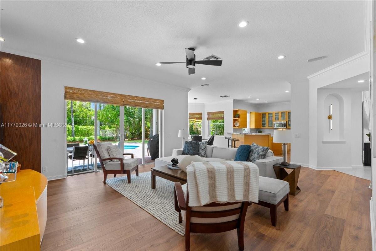 Soaring 2-story ceilings set the tone for this elegant 5 bedroom estate in sought-after Weston Hills, almost 5000 sq ft of living space, a sparkling heated pool/spa, spacious playroom/library & dedicated office- designed for both refined living & family comfort. Expansive owners suite offers 3 custom walk-in closets, versatile sitting area & private deck, perfect for morning coffee or unwinding in the evening. Abundant natural light fills the home, features a newer roof (2022), updated flooring, fenced yard, expansive patio & cabana bath. Dual staircases-one for a grand entrance, the other leading to the children's wing- enhance both flow & functionality. Accordion shutters, circular driveway & 3-car garage add to the appeal. Recent price adjustment & A-rated schools, a true forever home!