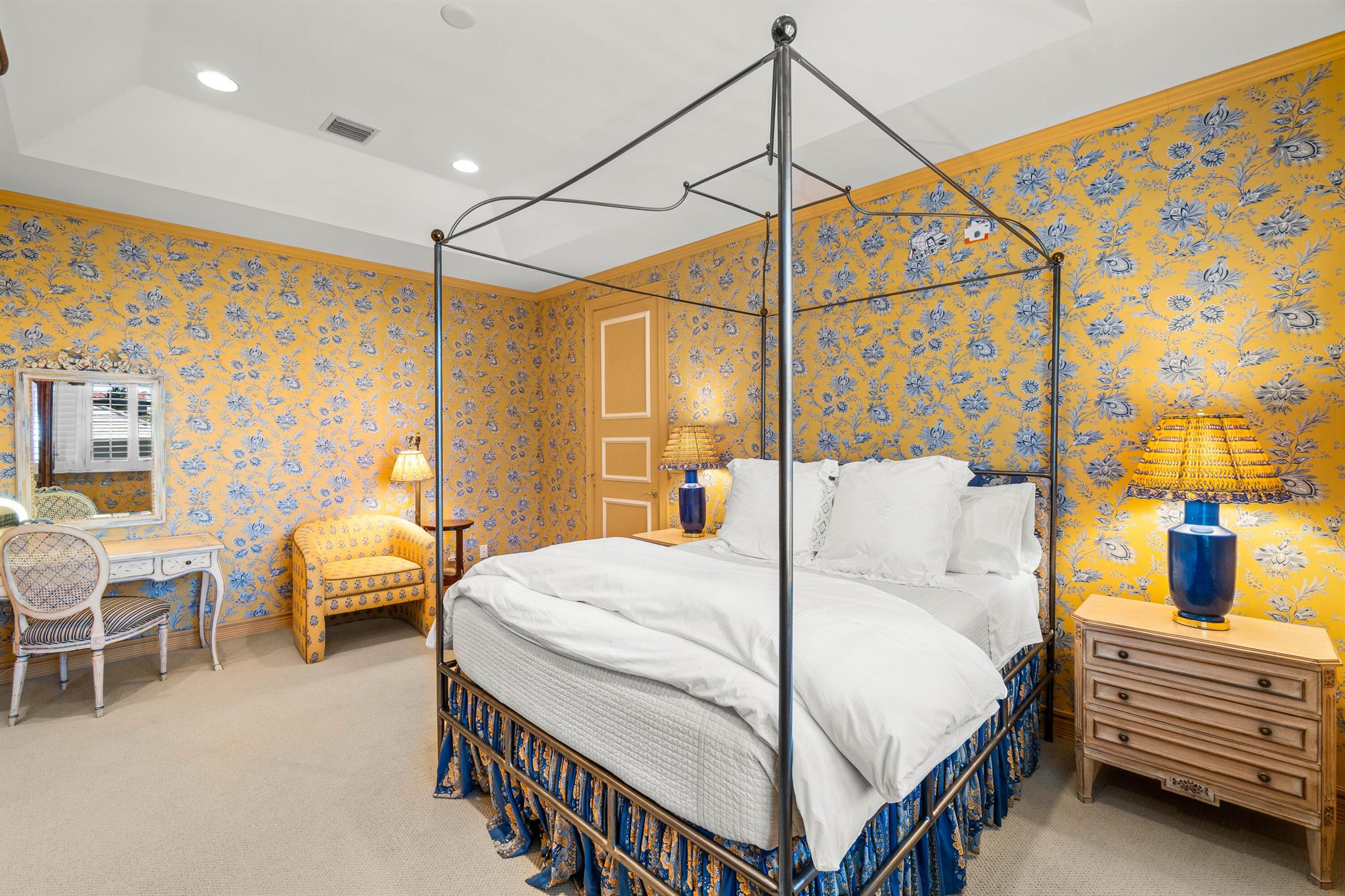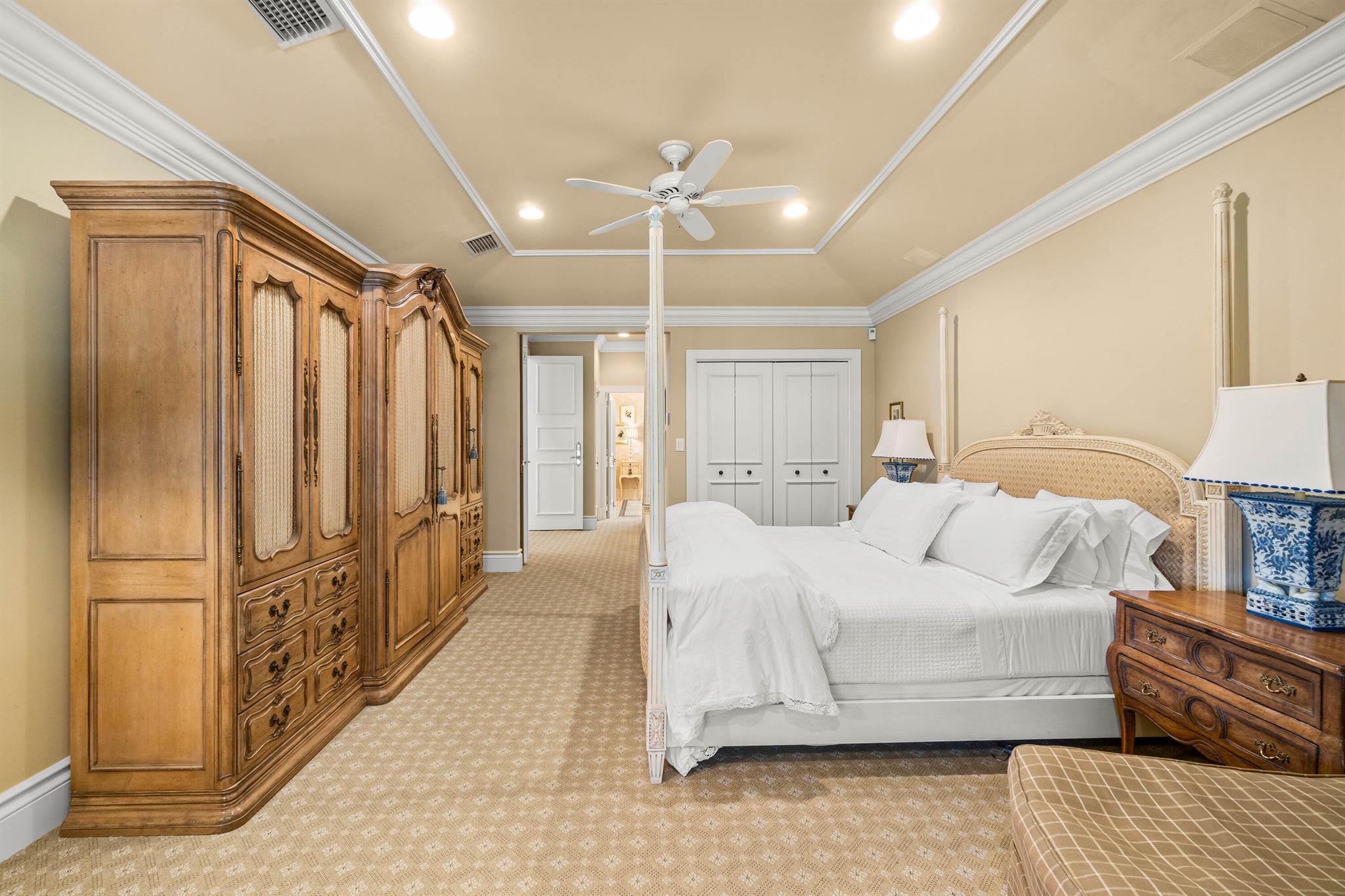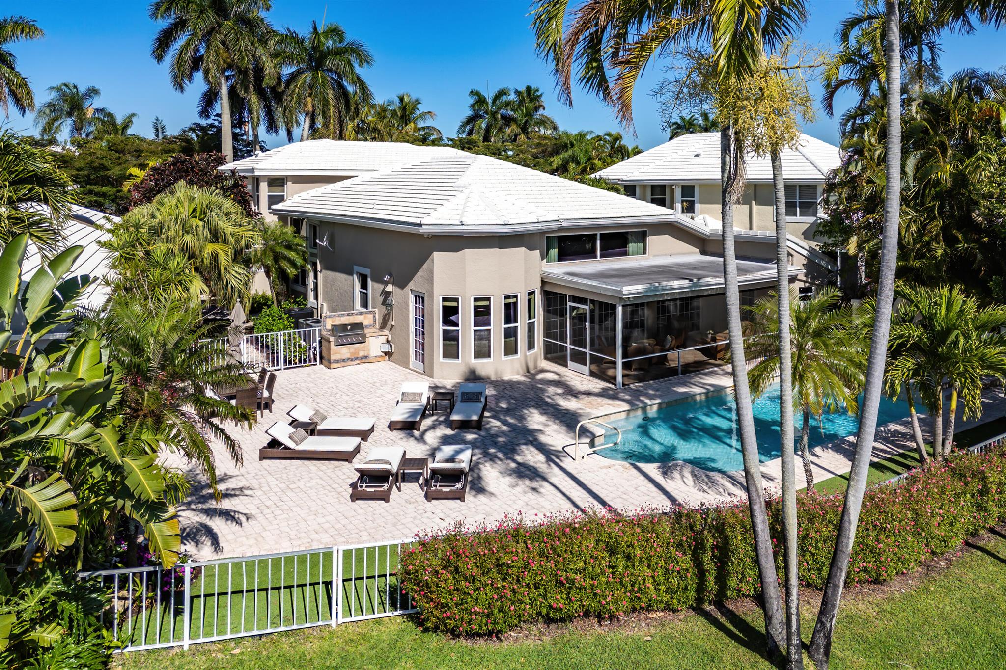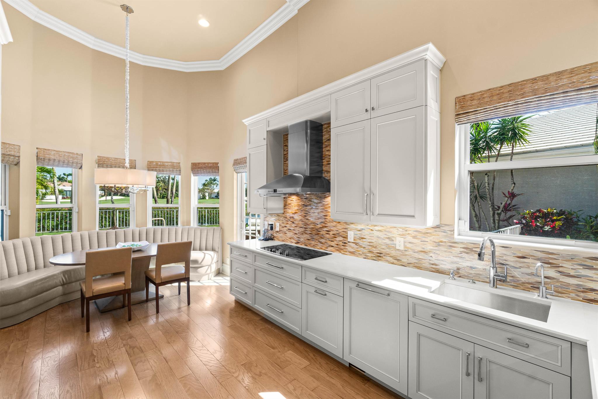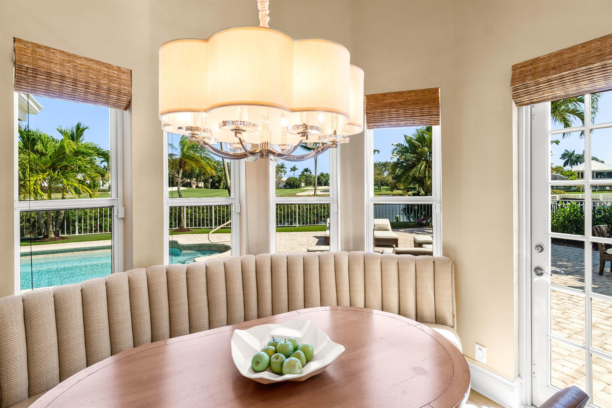 Step into this breathtaking home, where abundant natural light and elegant design create an inviting atmosphere. The formal dining area, illuminated by a stunning light fixture, seamlessly leads into the gourmet kitchen. The chef's kitchen features newer appliances with a wine fridge, while also incorporating a charming eat-in area with picturesque views of the backyard, golf course, and lake. The spacious living room is bathed in natural light, thanks to its large windows and sliding doors that open to an expansive screened-in patio. Adjacent to the living room, a stylish wet bar with ample cabinetry and bar seating makes entertaining effortless. Nearby, the sophisticated den/office is outfitted with custom built-ins, offering the perfect workspace. The luxurious primary suite is a