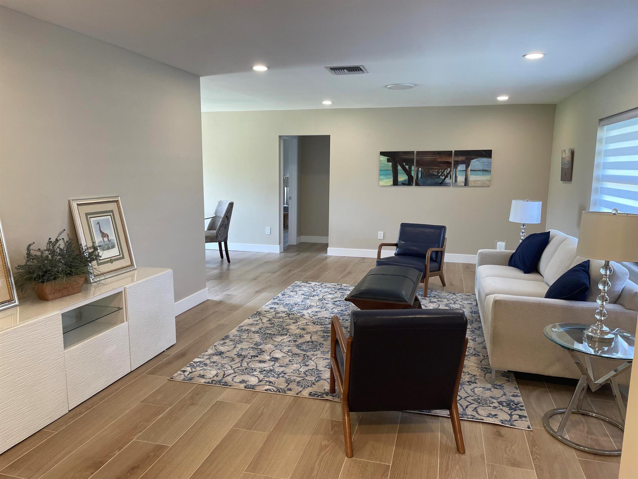 Roof is 2020 and A/C is 2022 and completely hurricane protected and renovated. Step into this tastefully updated home where modern living meets timeless charm. The wood look tile floors flow throughout the entire house. The heart of the home is the beautiful kitchen with quartz countertops and stainless steel appliances. This is a turn key ready to move into home in a fantastic location. Enjoy your Florida lifestyle just a few miles from the beach and all that Atlantic Avenue has to offer. This communities HOA covers the replacement of roofs, lawn service, gym, pickleball, tennis, walking trail and so much more.
