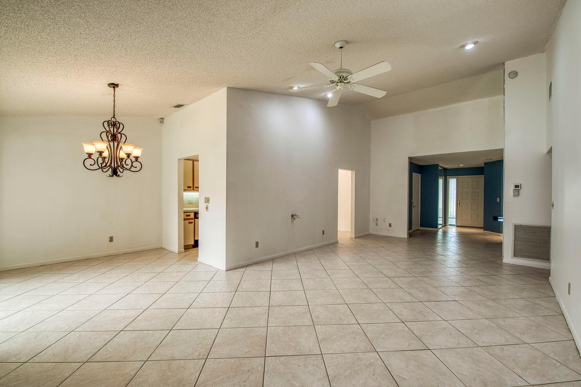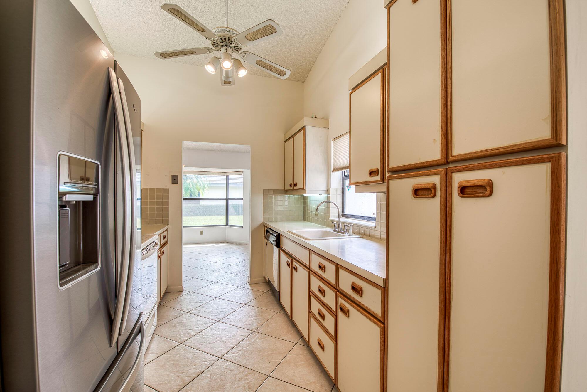 This cozy and meticulously maintained villa in the sought-after Fairmont Place offers peaceful living in one of the most private locations in the community. Nestled at the back of the neighborhood with no through traffic, the home features 2 bedrooms, 2 bathrooms, and a thoughtful layout with the kitchen and garage on one side, and bedrooms on the other. The spacious living area flows into a dining room with a charming bay window, while the galley-style kitchen includes unique touches like a built-in butcher block and knife station. The primary suite features a large walk-in closet, private en-suite, and sliding door access to the covered patio, complete with roll-down shutters and faux rock tile flooring. Additional perks include an indoor laundry room and a long one-car garage with