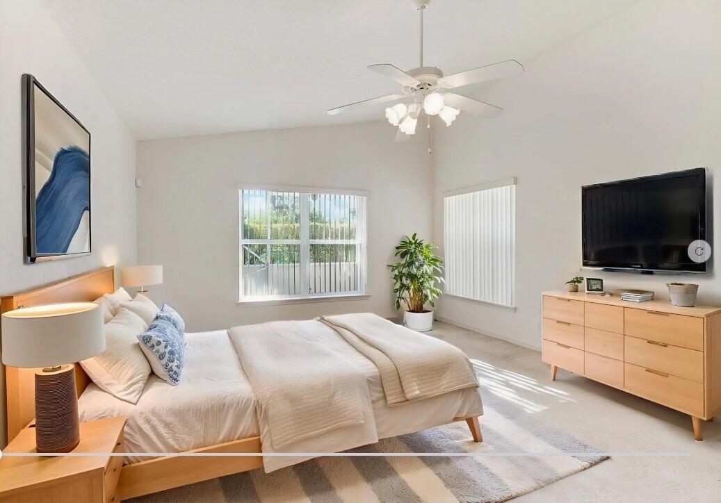 Pride of ownership, bright open space, and vaulted ceilings adorn in ever aspect of this meticulously maintained home, including the impeccable landscaping and custom paver driveway. Primary Bedroom features a large bathroom with double sinks, separate tub and shower, and large walk-in-closet. The private fenced yard can be extended approximately 25' to expand the yard area and features a covered and fully screened patio with oversized raised SPA and fully fenced yard. 3rd Bedroom/Den does not have a closet. AC unit replaced in 2020 and includes a UV Light, New Water Heater November 2024. Full hurricane protection with accordion shutters.Grande Palms is a small intimate gated community of 61 single family homes and offers residents a private pool and tennis courts.