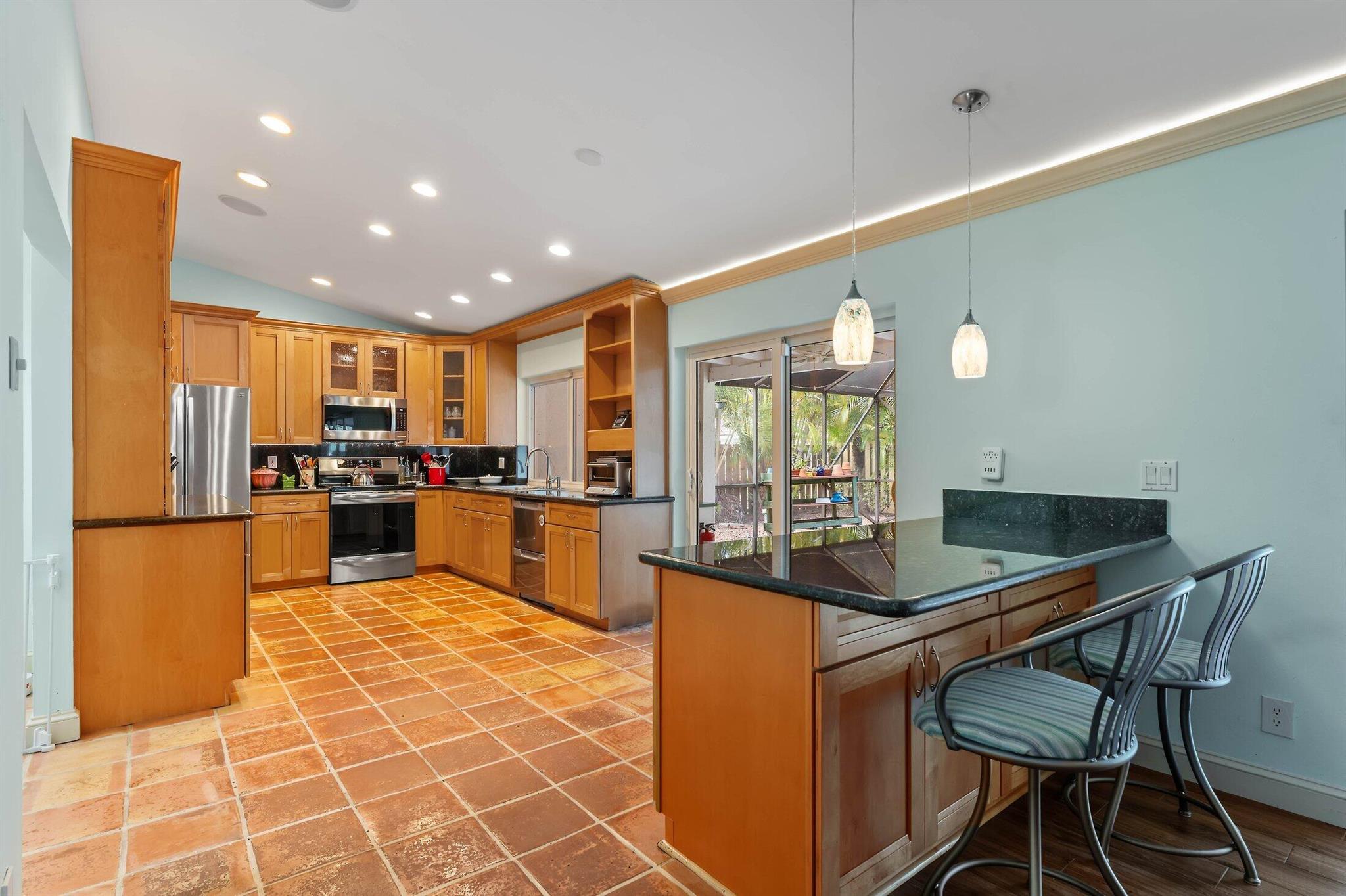 Welcome to your dream home nestled in the picturesque neighborhood of Lakewood Oaks in Boca Raton! This charming single-family residence boasts four spacious bedrooms and two beautifully renovated bathrooms, a family room, separate living room and dining room with skylights, a large kitchen with Pantry and laundry room.Step inside through the front wrought iron entry and open garden into the foyer. You will discover an open concept home with tall ceilings, beautiful Mexican Tile, and a floor plan that can easily accommodate many different living options. The kitchen gleams with stainless steel appliances, a sink overlooking your pool & yard, plus plenty of cabinets, some with glass fronts, granite countertops and breakfast bar area.
