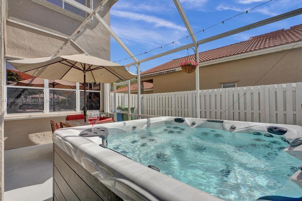 Welcome to a stunning 4-bedroom, 3-bathroom home nestled in the heart of Weston. This residence features an open floor plan with abundant natural light, highlighting the spacious living and dining areas. The modern kitchen boasts stainless steel appliances, granite countertops, and ample cabinetry. The master suite offers a walk-in closet and an en-suite bathroom with dual sinks. Step outside to a beautifully landscaped backyard with a covered patio, perfect for entertaining. Enjoy outdoor spa and seating. Roof replaced 2019, AC replaced 2022, Water Heater 2021. Located in a top-rated school district and close to shopping, dining, and major highways, this home offers the best of Weston living.