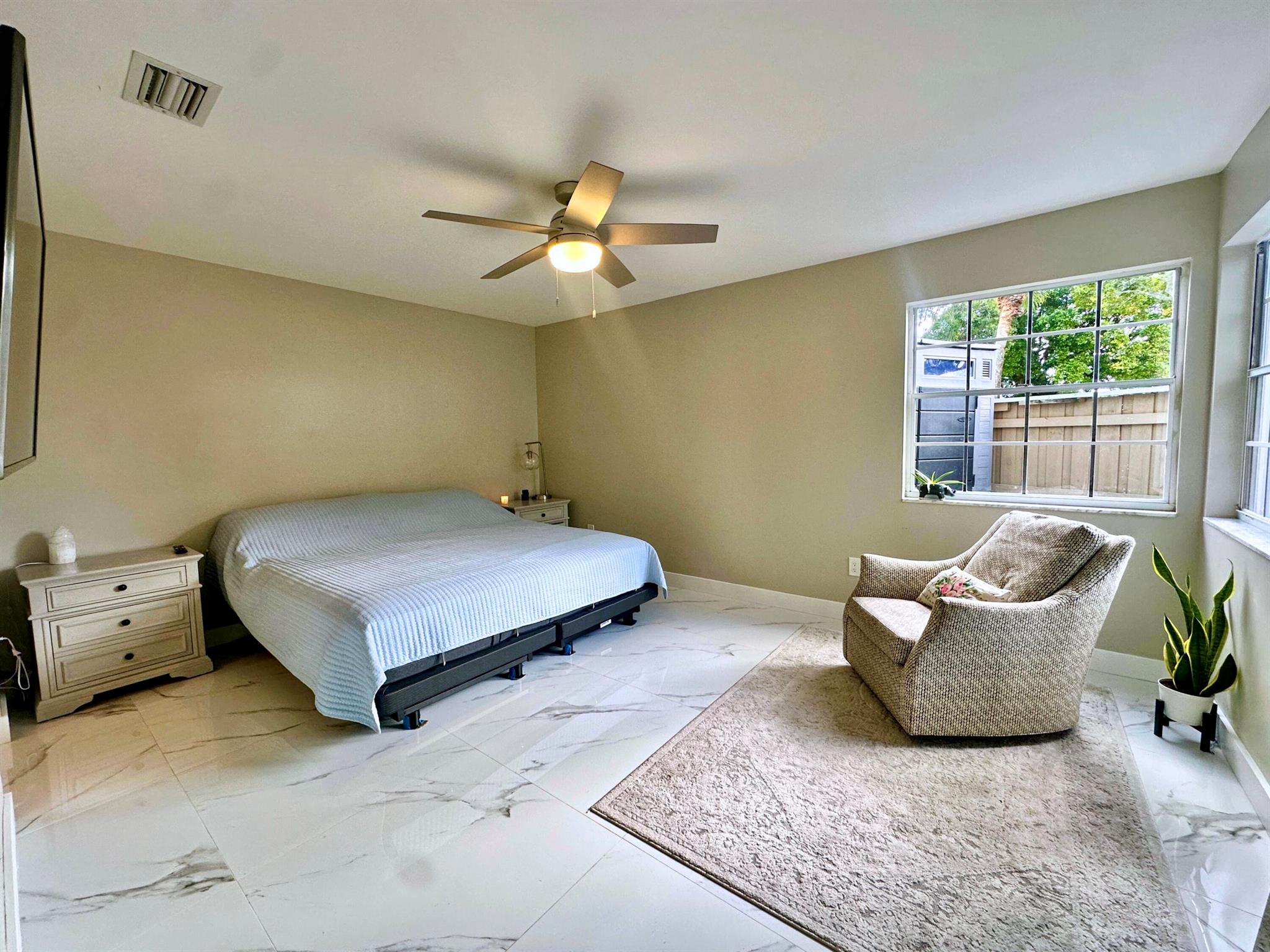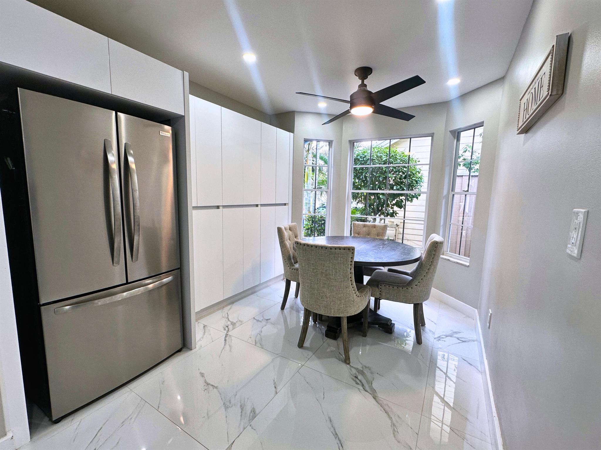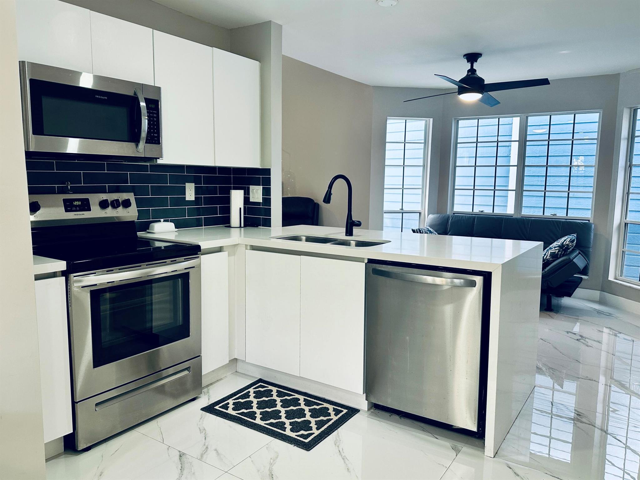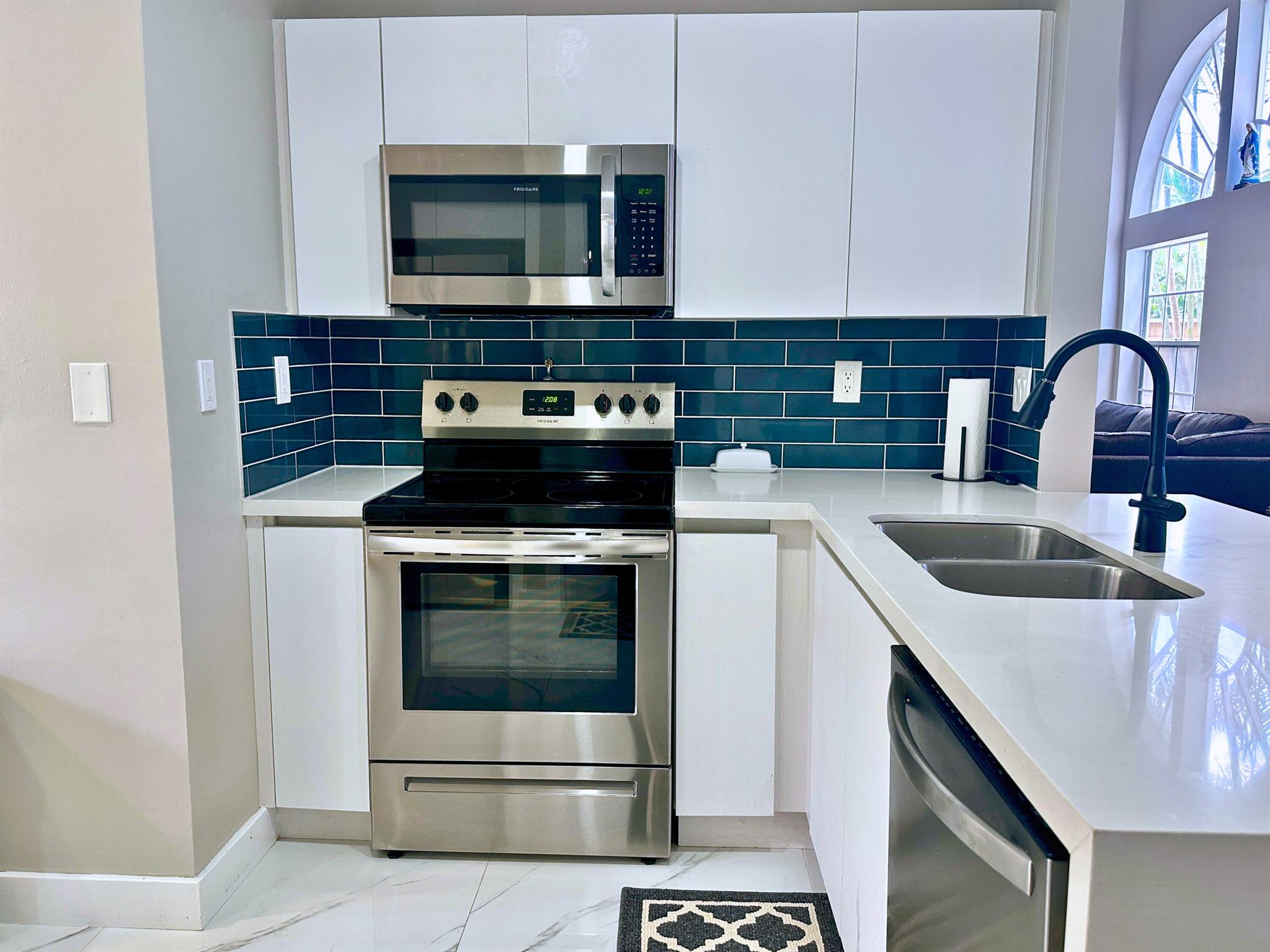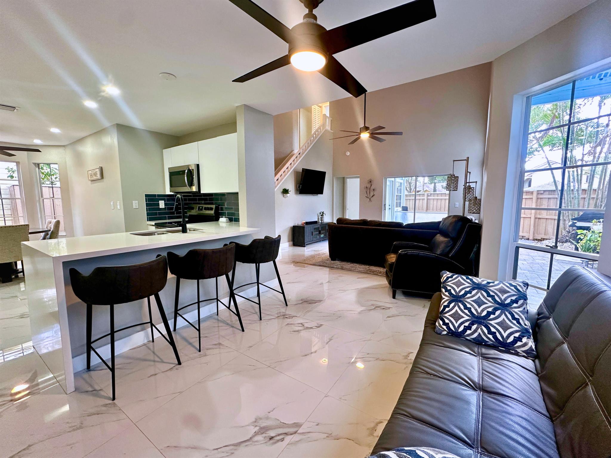 Discover your dream home in the prestigious gated community of Fairfield at Boca Raton. This beautifully renovated 3-bedroom, 2.5-bathroom residence offers modern comforts and elegant design. The master suite, located on the first floor, features a brand-new custom shower, double vanity with quartz counters, and a spacious walk-in closet. The contemporary kitchen boasts custom white cabinetry, quartz countertops, and new stainless steel appliances, seamlessly flowing into the open living and dining areas with high-volume ceilings and porcelain floors new roof. Enjoy serene garden views from your private patio, perfect for relaxation or entertaining. Fairfield, you'll have access to resort-style amenities, including a clubhouse, pools, fitness center, and tennis courts