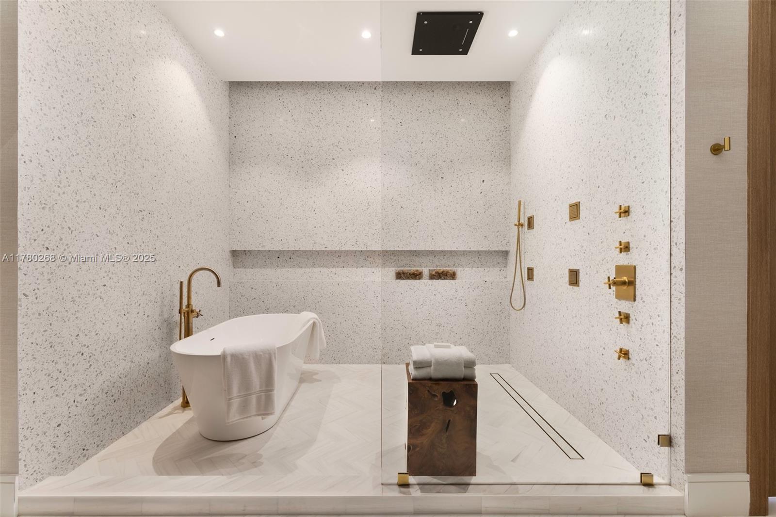 This brand new luxurious two-story corner residence features 7 bedrooms, 8 full bathrooms, and 2 powder rooms within a total of 11,557 Sq Ft, with 9,357 Sq Ft of living space, on a nearly-acre lot. It includes a designated office, media room, and exercise room. Elegant touches throughout the home include an artisan floating staircase, handcrafted and hand-pressed terrazzo slabs, and a double-sized master closet, adding a sophisticated flair to the design. The custom kitchen features custom white oak cabinets and high-end SubZero and Wolf appliances. With dual laundry rooms on both levels, service living quarters, and a separate guest house, privacy and comfort are assured. The outdoor space boasts an oversized heated saltwater pool with a spa and a summer kitchen, perfect for entertaining.