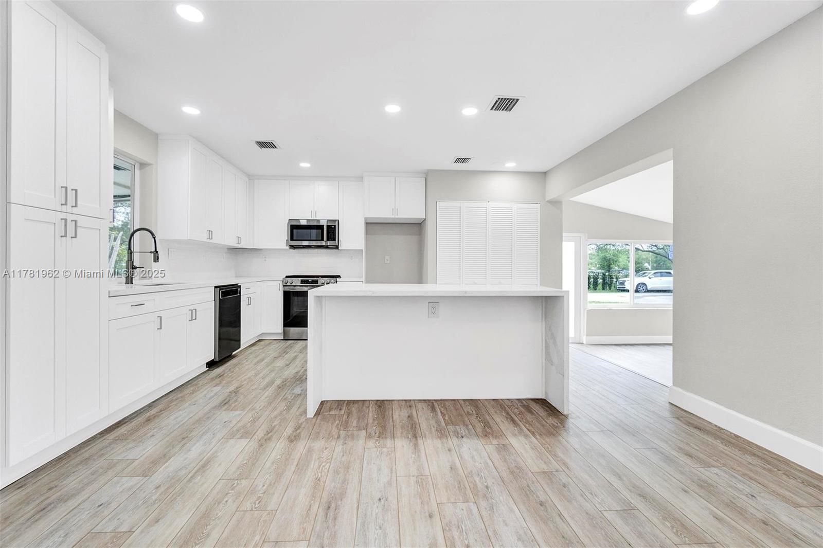 Amazing Palmetto Bay open concept living plus family (office/play) room. Two bedrooms are 21x11. NEW in 2025: white kitchen cabinets plus large island with waterfall quartz counters, sink & faucet, gas range & microwave, recessed lighting & fixtures, plank flooring, renovated bathrooms, interior paint and tented. New in 2024: impact windows & doors, exterior paint, hot water heater and pool resurfaced. Wonderful roofed pool/patio deck with tall screen enclosure. Waste pipes lined (2021). FPL surge protection installed 2020. Shingle roof (2018) plus much more on 14980 corner lot. Zone X = no flood insurance.
