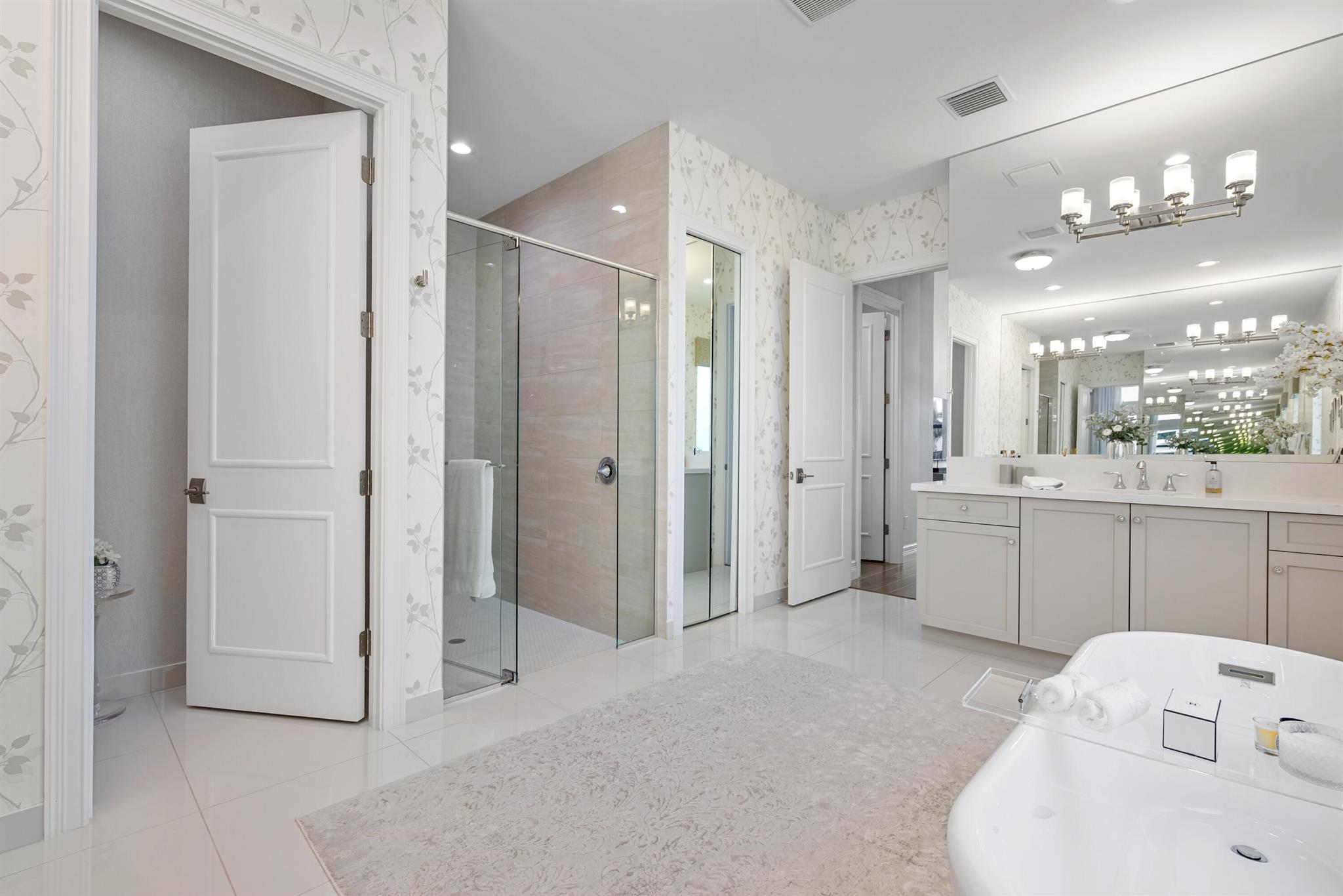 Welcome to 9046 Chauvet Way, an exquisite lakefront residence in the prestigious Boca Bridges community. A sophisticated example of contemporary luxury, this rarely available Adriana model features 5 bedrooms, 4 and a half bathrooms, den/office, chef's kitchen and loft. An expanded circular driveway sets the stage for the elegance within. Step thru the grand two-story entrance into a light-filled, airy foyer that immediately impresses. A decadent den/office offers the perfect blend of comfort and functionality for work or relaxation. The chef's kitchen is a culinary dream, outfitted with premium KitchenAid appliances, an expansive island, custom cabinetry with recessed lighting, and a walk-in pantry with stylish barn doors.