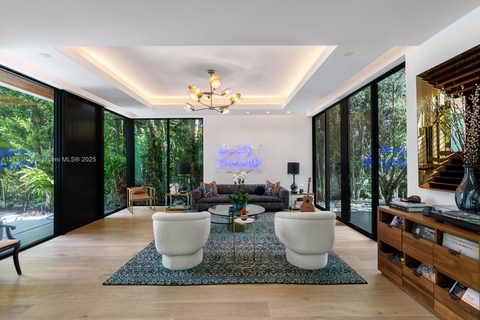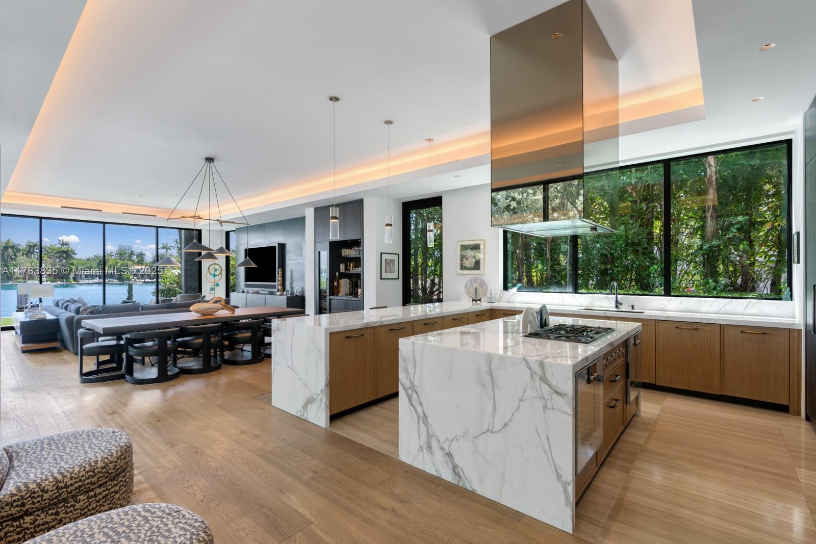 Step Inside With Me! 609 East Dilido seamlessly fuses nature and design for tropical living on the Venetian Islands. Built by Bart Reines and impeccably styled by its designer-owner, it juxtaposes teak, concrete, wood, glass and greenery. Interior highlights include retractable glass windows, custom millwork, specialty lighting & a white marble kitchen with Gaggenau appliances. A floating staircase leads to chic office loft + 4 suites. With over 1,200SF, the Primary is a true escape featuring ambient lighting, open concept marble bath, enviable dressing closet, and wraparound terrace with open bay views. This smart home fully controls lighting, air, music and more. The pool, rooftop deck, summer kitchen, solar panels, landscape, amazing dockage & 2 car garage complete the outdoor package.