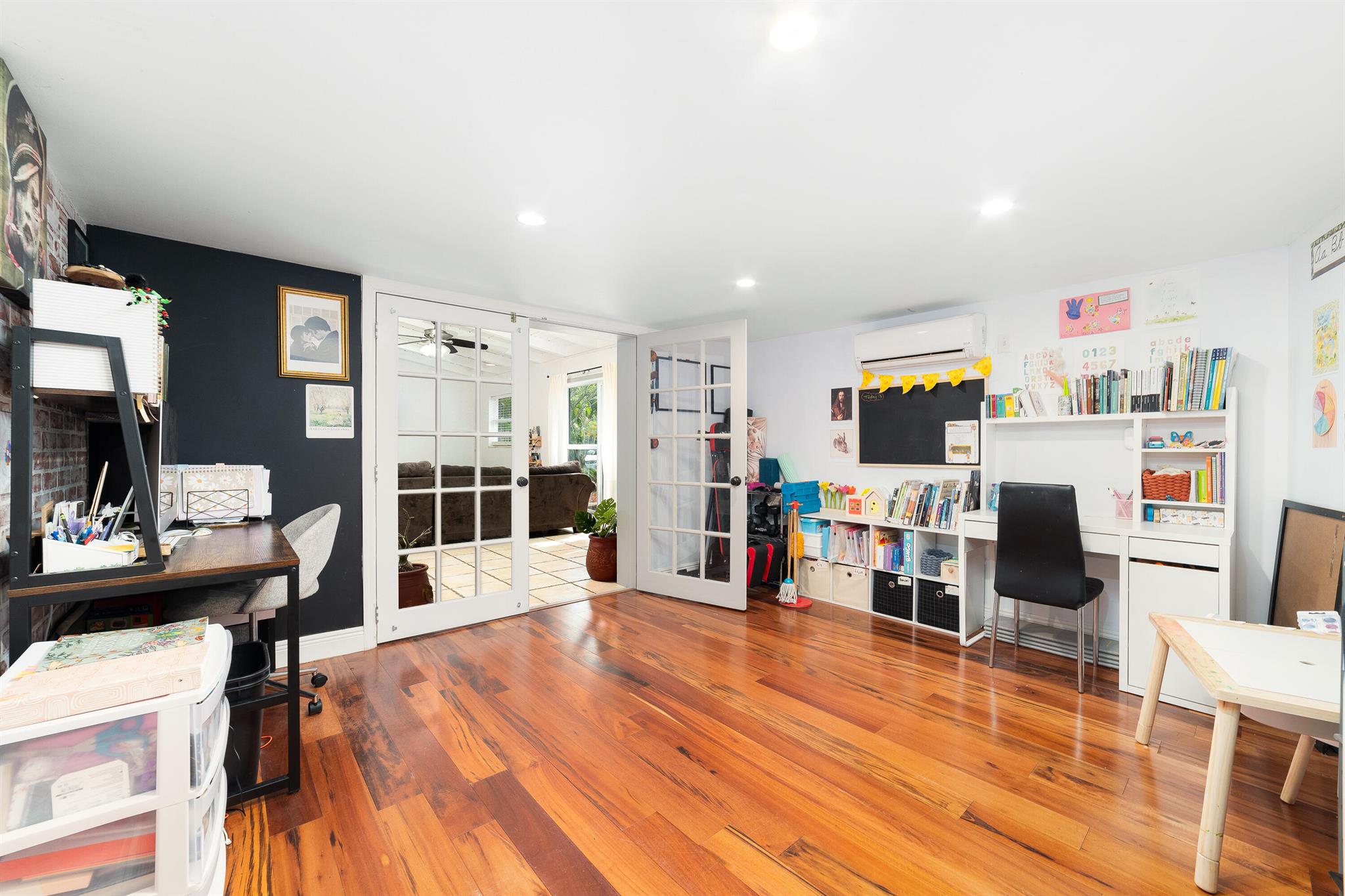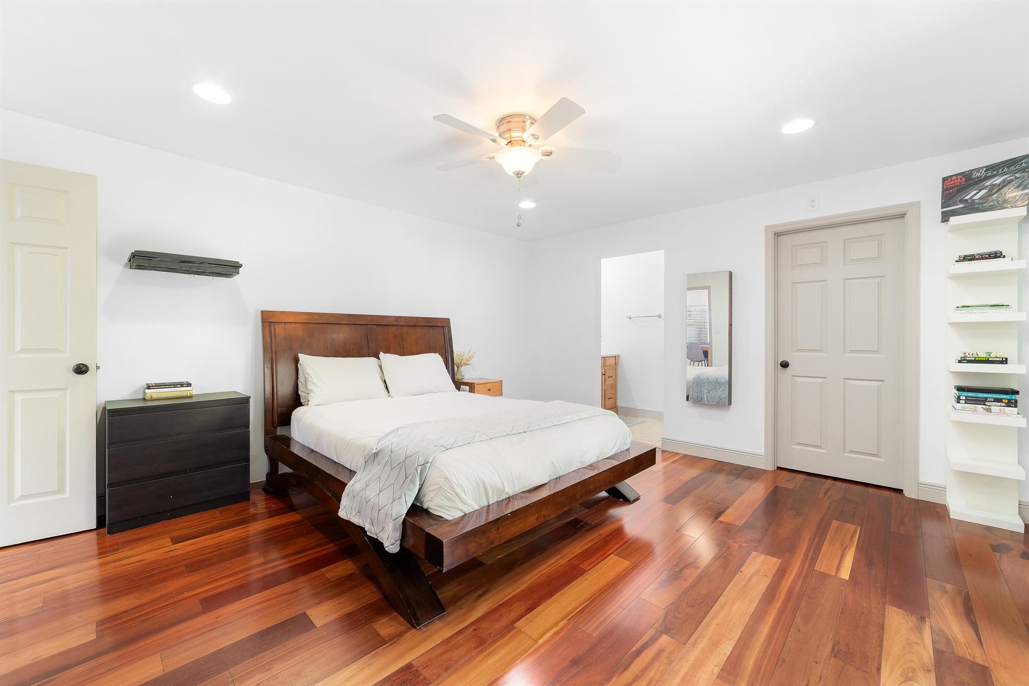 Welcome to your dream home in the desirable RIVERLAND area! This stunning 4-bedroom PLUS a den, 4-bathroom single-family residence boasts impressive vaulted ceilings adorned with exposed wood beams, creating an inviting atmosphere. The beautiful kitchen features a large pantry and natural light pours in through stylish skylight domes. Retreat to the spacious primary bedroom, complete with a walk-in closet and elegant wood floors. The property showcases tile, wood, and terrazzo flooring throughout for easy maintenance. A versatile bonus room and one bedroom with a separate entrance offer endless possibilities. Enjoy outdoor living in the spacious fenced yard, plus the convenience of two large driveways. Don't miss this opportunity!