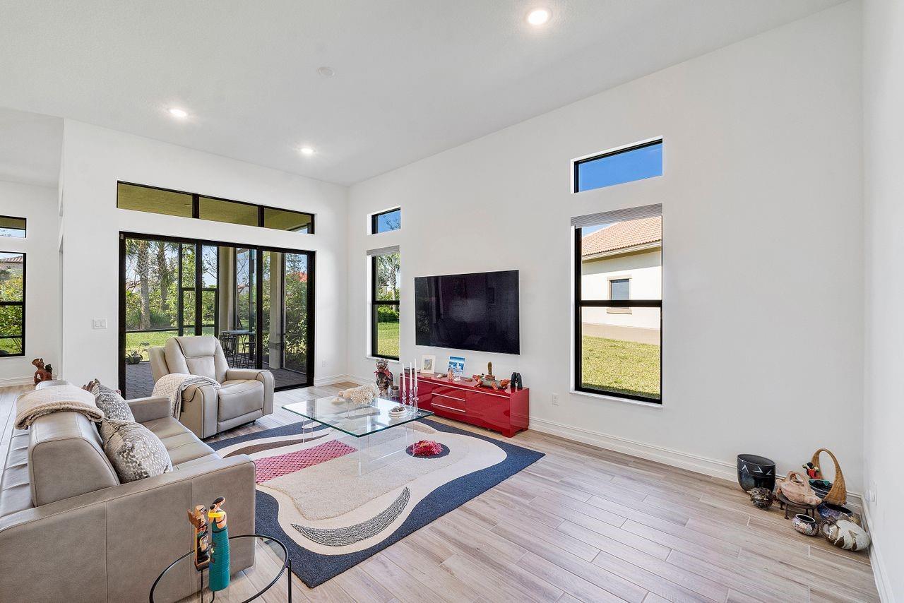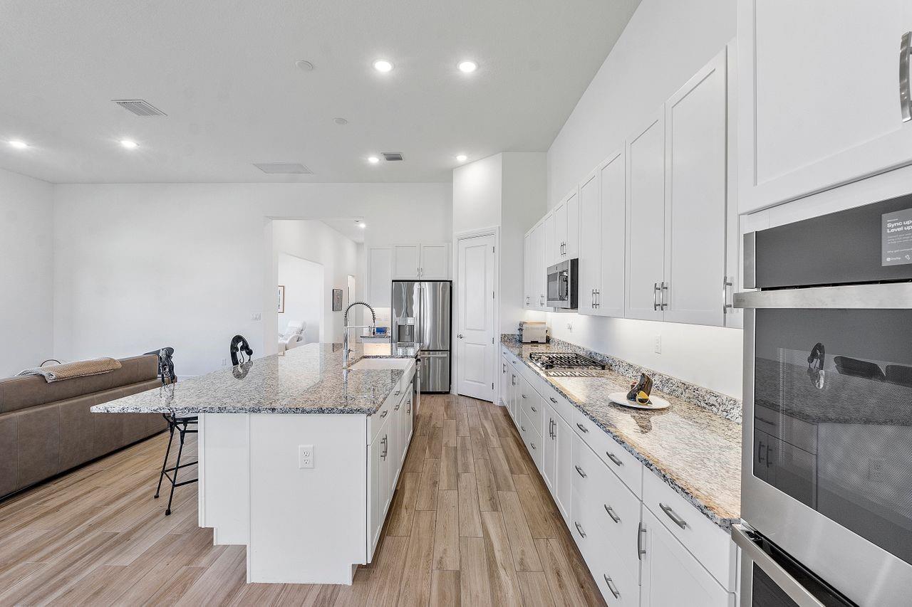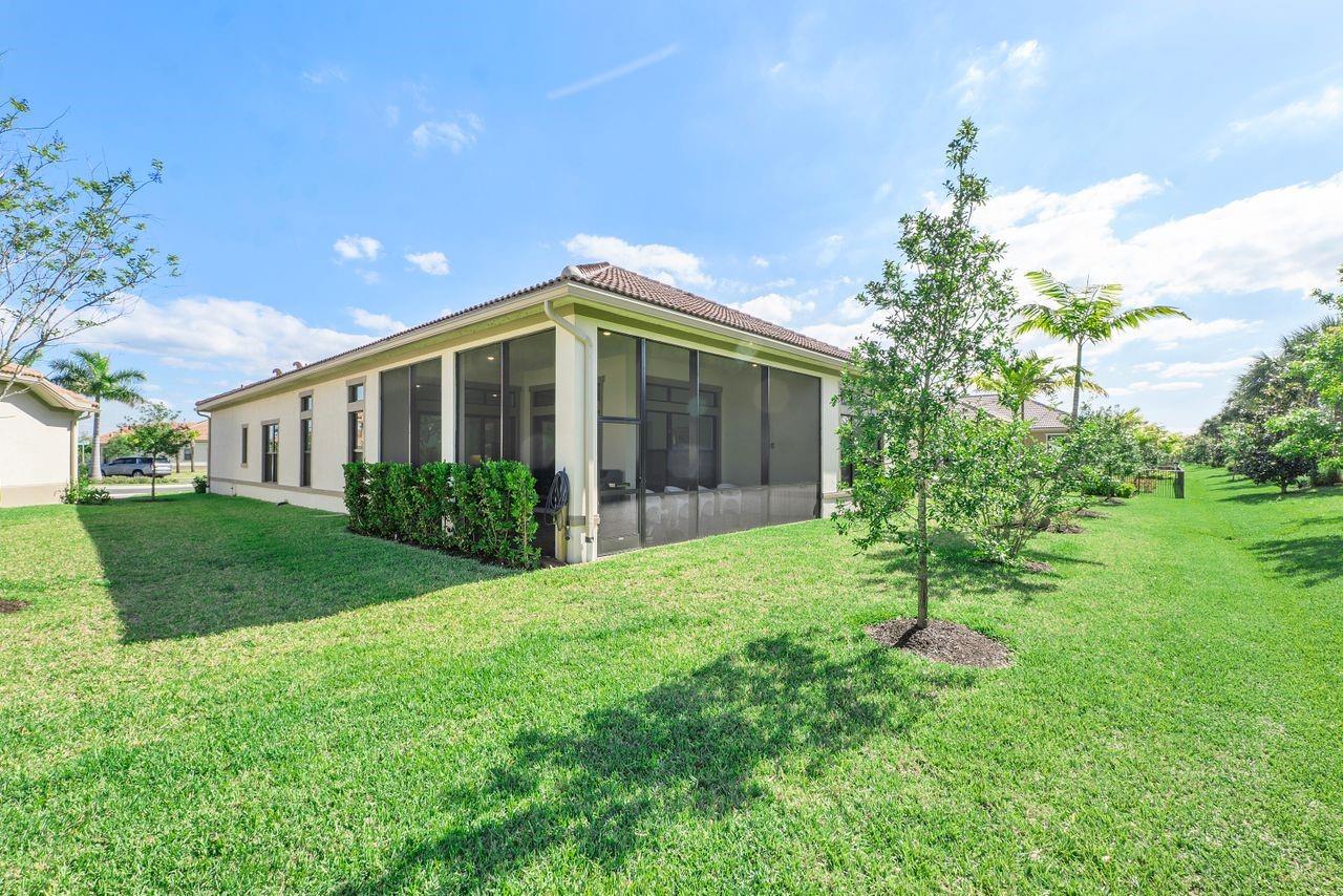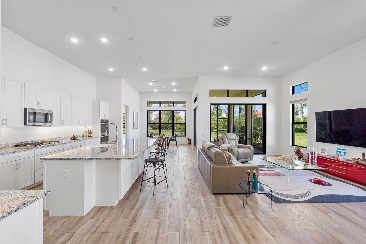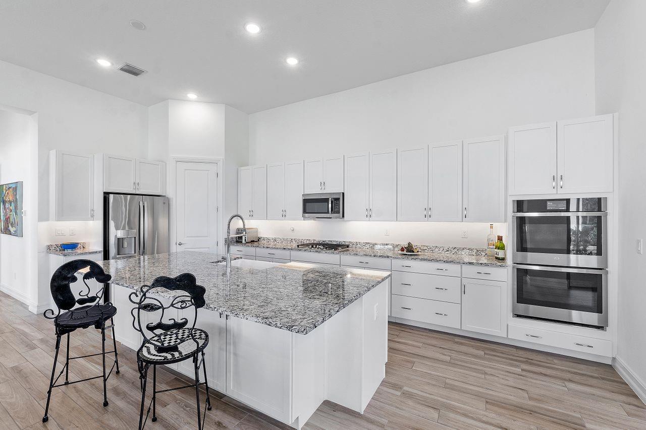 Welcome home! Step into this beautifully maintained, barely lived-in residence that exudes warmth & comfort from the moment you arrive. The spectacular open floor plan greets you with soaring volume ceilings & an abundance of natural light, creating an inviting & airy atmosphere. Spacious two bedrooms, a flex room perfect for dining/bonus/or office space. Split Floor plan offers privacy. Fall in love w/the kitchen's crisp white cabinets, granite countertops, and a walk-in pantry. Step outside to the LARGE screened paver lanai, an ideal retreat for enjoying the Florida sun. Addt'l Highlights a walk in laundry room and a meticulous interior. Vibrant 55+ community w/activities pickleball, tennis courts, cafe and resort style amenities-all w/no membership fee.