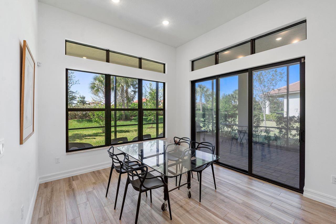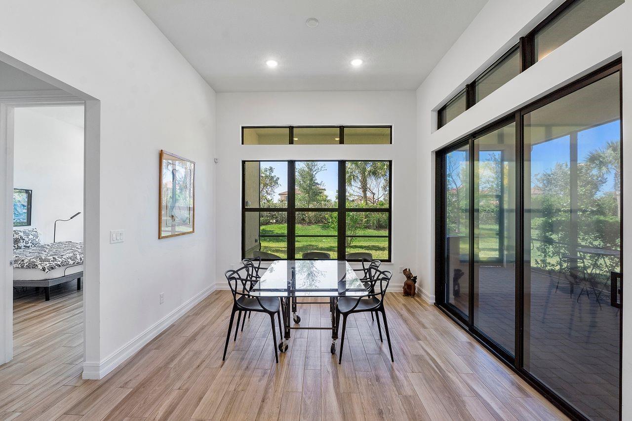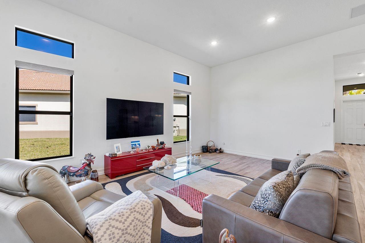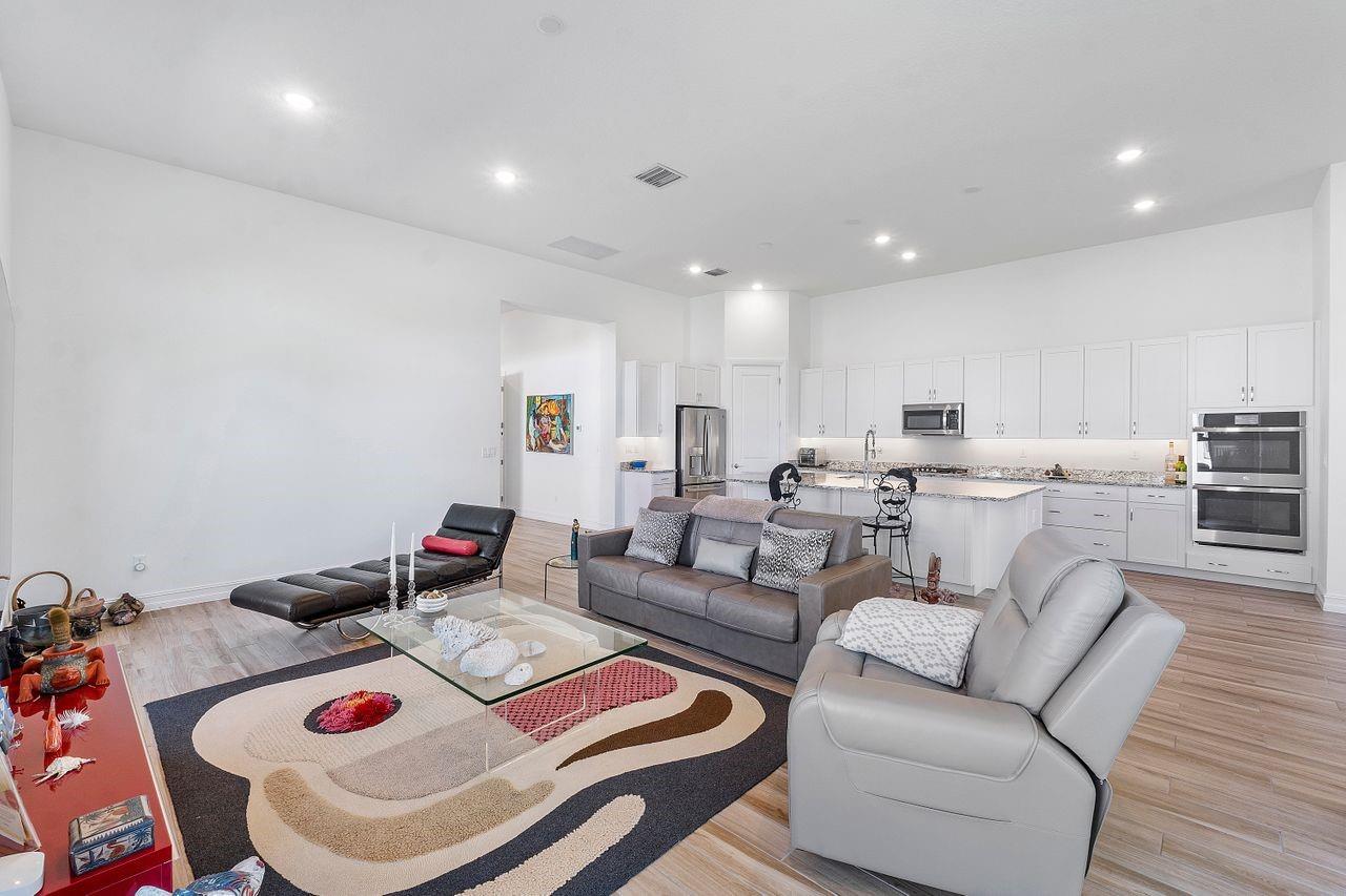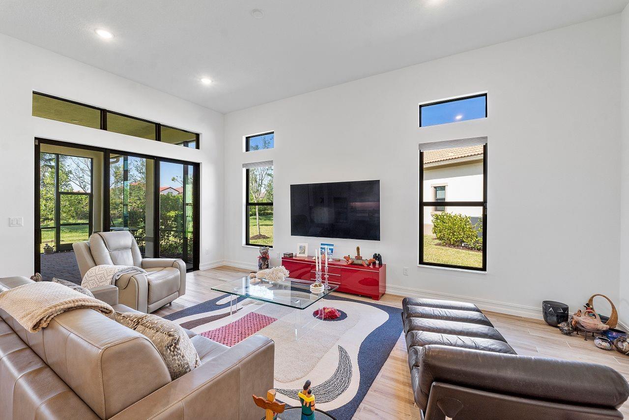 Welcome home! Step into this beautifully maintained, barely lived-in residence that exudes warmth & comfort from the moment you arrive. The spectacular open floor plan greets you with soaring volume ceilings & an abundance of natural light, creating an inviting & airy atmosphere. Spacious two bedrooms, a flex room perfect for dining/bonus/or office space. Split Floor plan offers privacy. Fall in love w/the kitchen's crisp white cabinets, granite countertops, and a walk-in pantry. Step outside to the LARGE screened paver lanai, an ideal retreat for enjoying the Florida sun. Addt'l Highlights a walk in laundry room and a meticulous interior. Vibrant 55+ community w/activities pickleball, tennis courts, cafe and resort style amenities-all w/no membership fee.