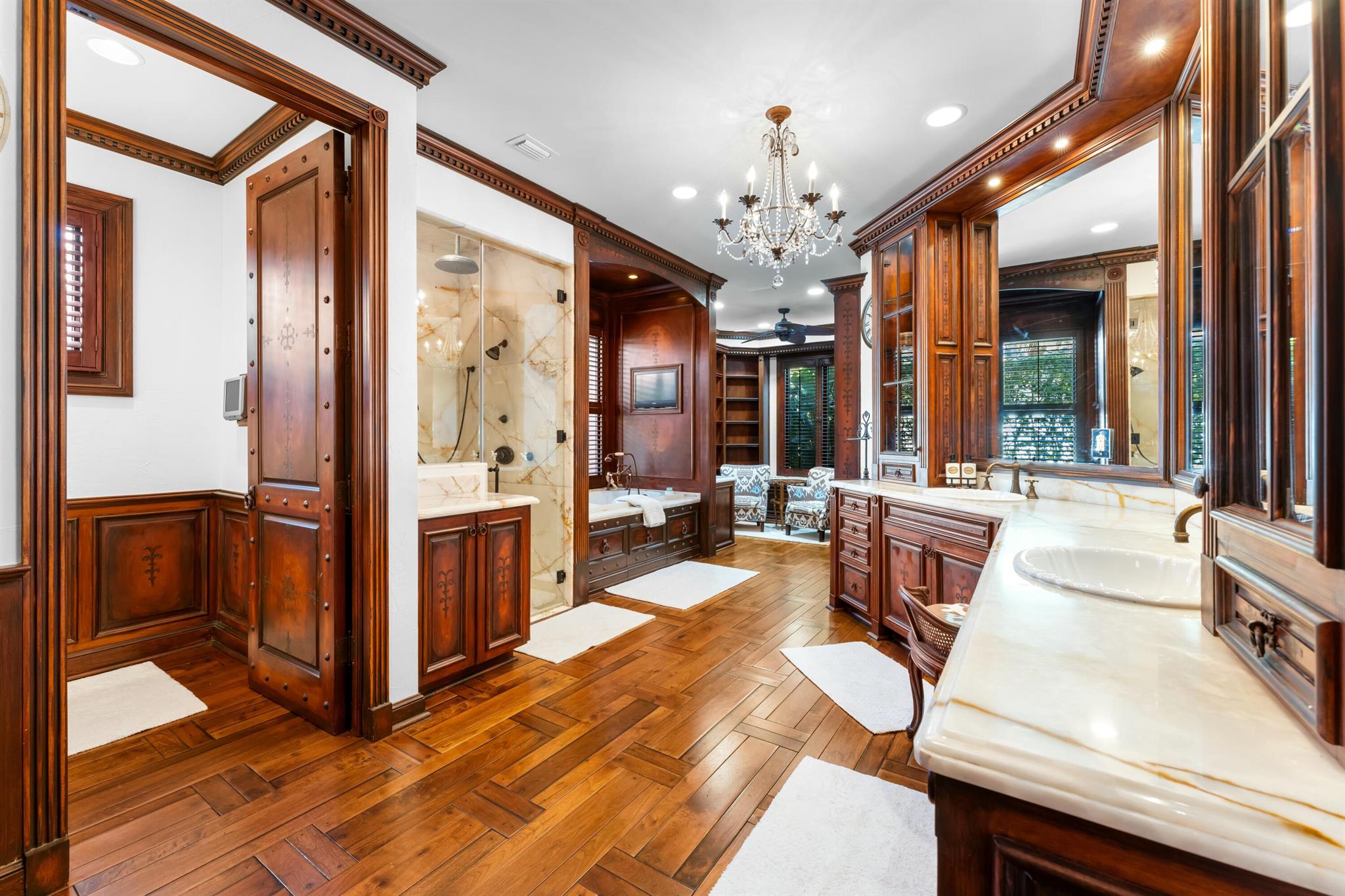 • Интерьер:WetBar, Bidet, BuiltInFeatures, ClosetCabinetry, DiningArea, SeparateFormalDiningRoom, DualSinks, EntranceFoyer, EatInKitchen, GardenTubRomanTub, Pantry, SplitBedrooms, SeparateShower, VaultedCeilings, Bar, WalkInClosets, Atrium