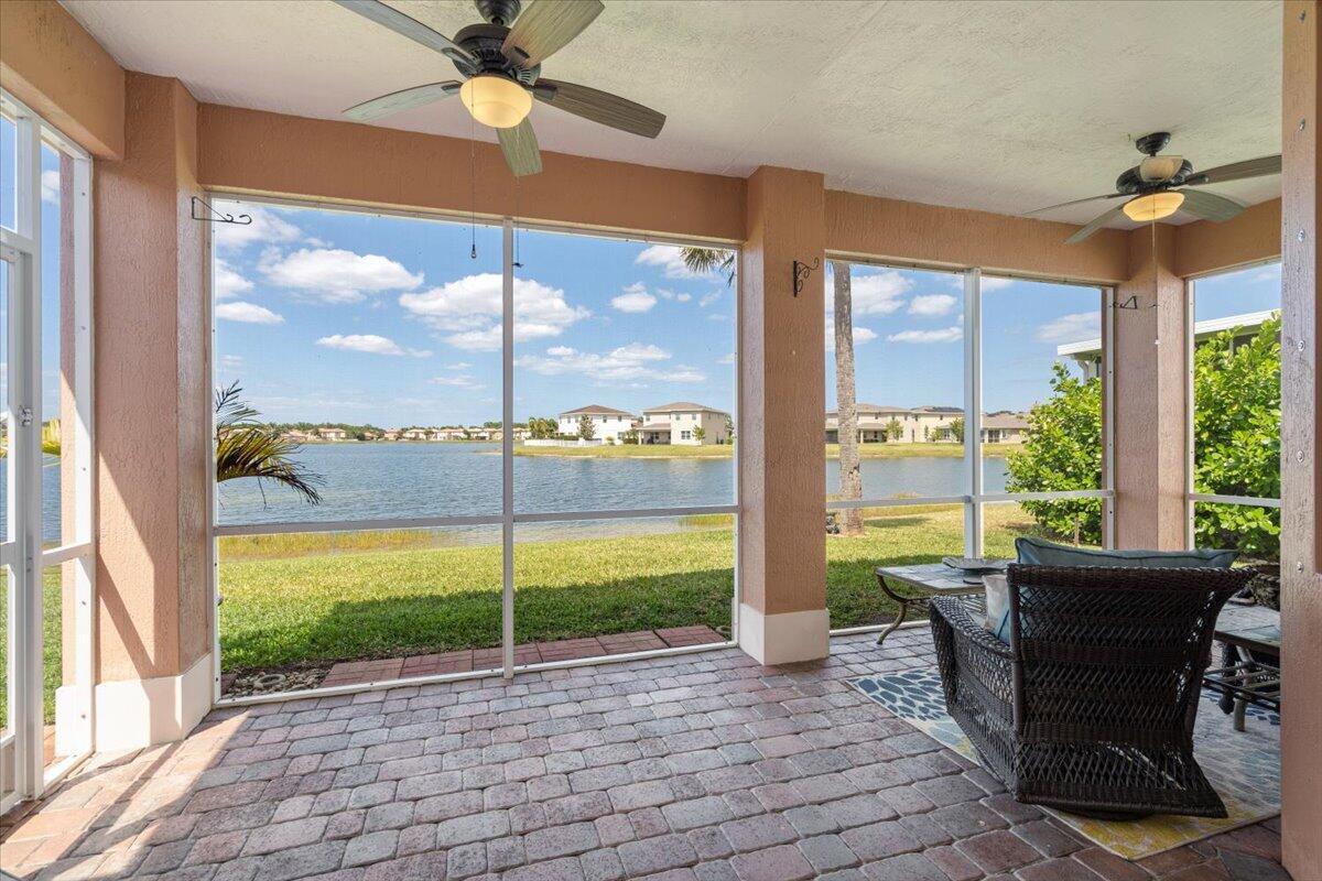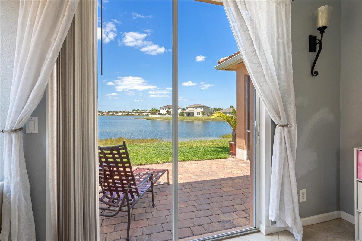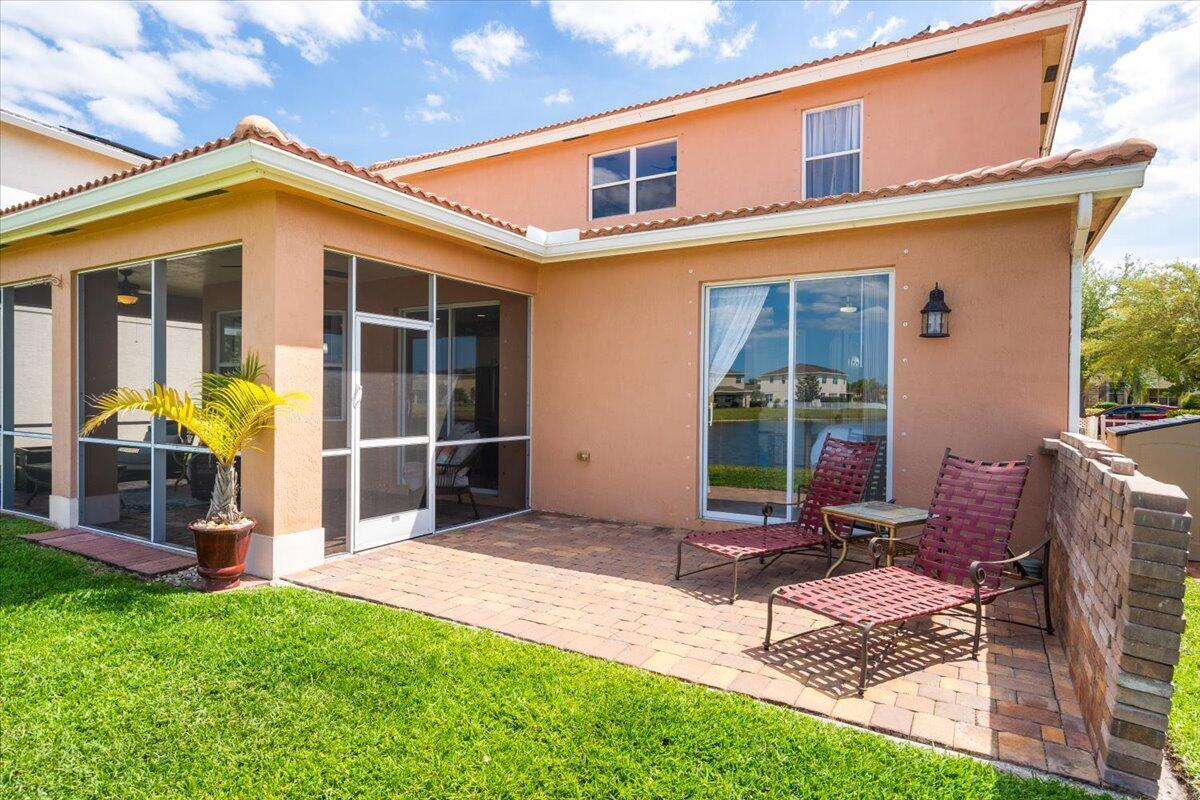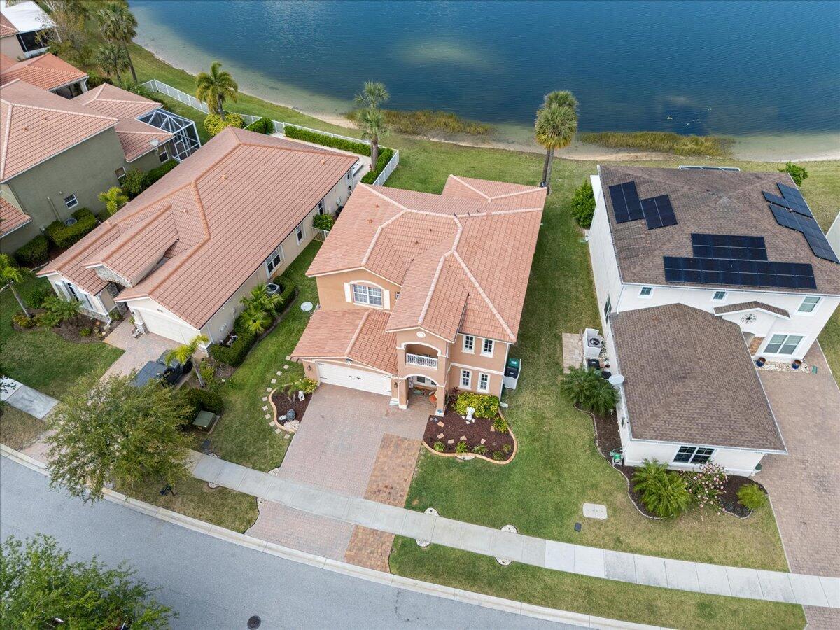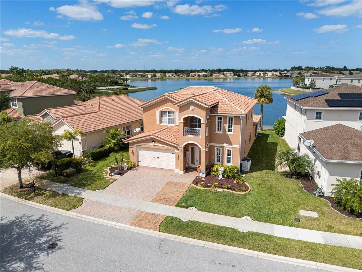 Live like you're on vacation in this stylish 4-bedroom, 2.5-bath home in coveted Vizcaya Falls, showcasing peaceful lake views and a smart, open layout. Solid CBS construction spans two stories with tile throughout the first floor, luxury vinyl on the stairs and upstairs commons, and soft carpet in the bedrooms. Soaring ceilings are elevated by upgraded crown molding, designer fixtures, and a statement chandelier. The upgraded kitchen shines with granite counters, a center island, and a sunny breakfast nook. Retreat to the first-floor primary suite with Roman tub, oversized shower, dual vanities, and a spacious walk-in closet. Recent updates include a 2024 washer & dryer, expanded three-car-width driveway, large entertaining patio, new impact-rated front door, and