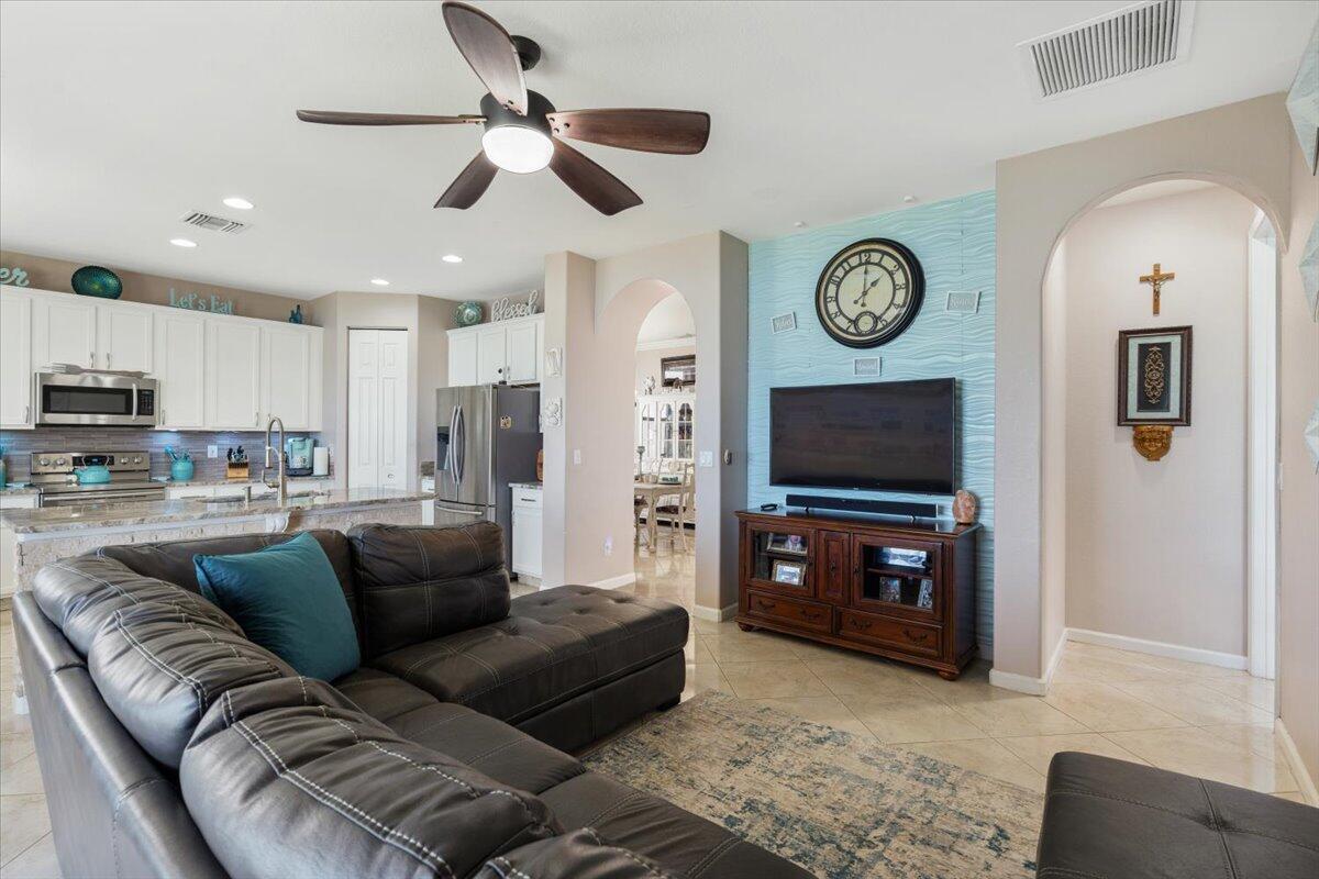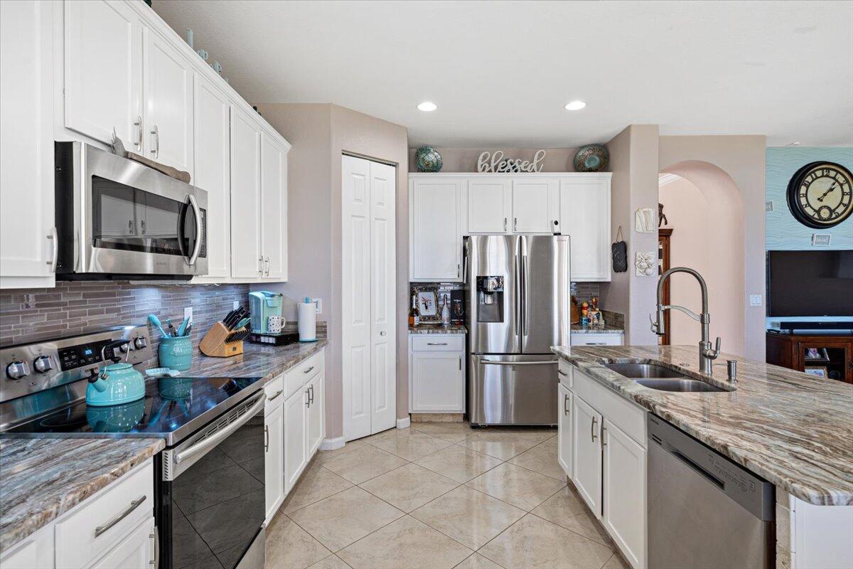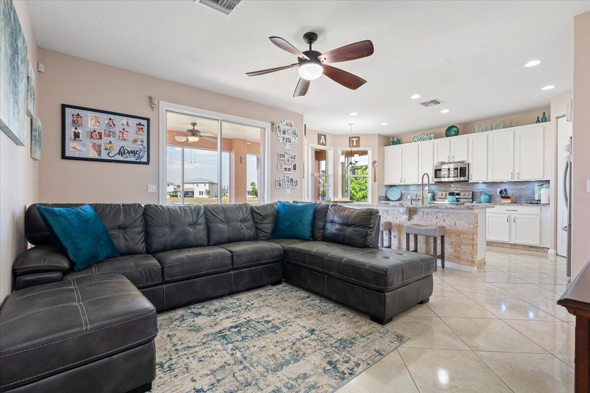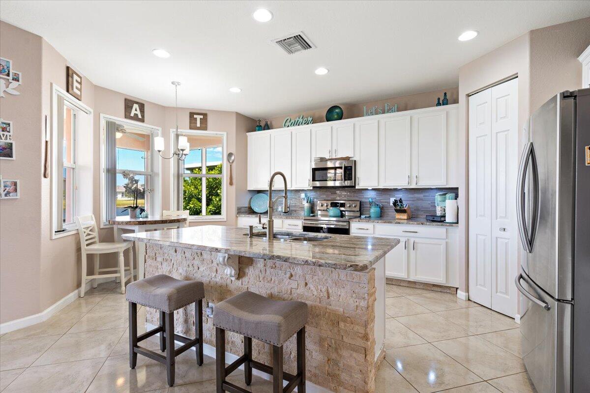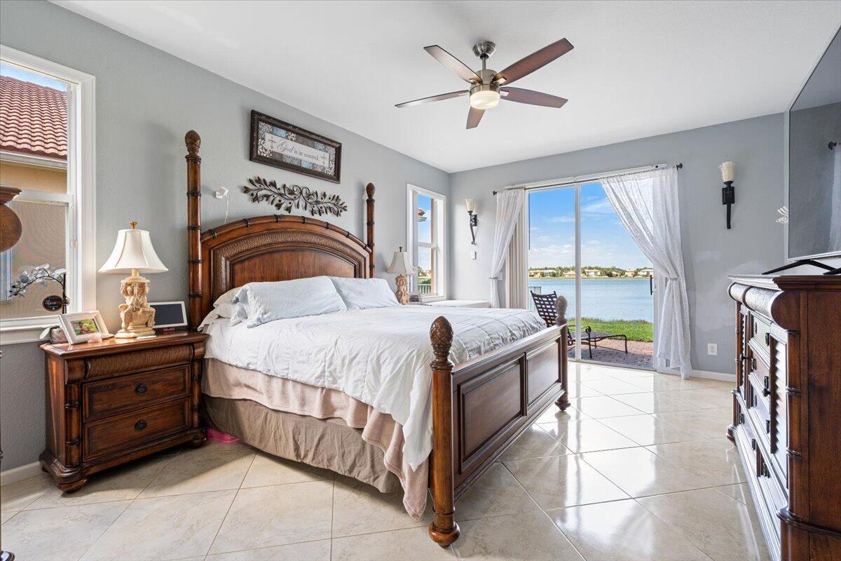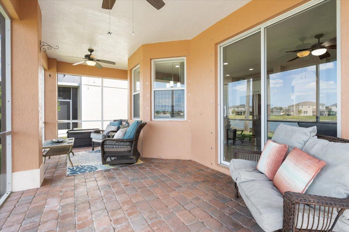 Live like you're on vacation in this stylish 4-bedroom, 2.5-bath home in coveted Vizcaya Falls, showcasing peaceful lake views and a smart, open layout. Solid CBS construction spans two stories with tile throughout the first floor, luxury vinyl on the stairs and upstairs commons, and soft carpet in the bedrooms. Soaring ceilings are elevated by upgraded crown molding, designer fixtures, and a statement chandelier. The upgraded kitchen shines with granite counters, a center island, and a sunny breakfast nook. Retreat to the first-floor primary suite with Roman tub, oversized shower, dual vanities, and a spacious walk-in closet. Recent updates include a 2024 washer & dryer, expanded three-car-width driveway, large entertaining patio, new impact-rated front door, and