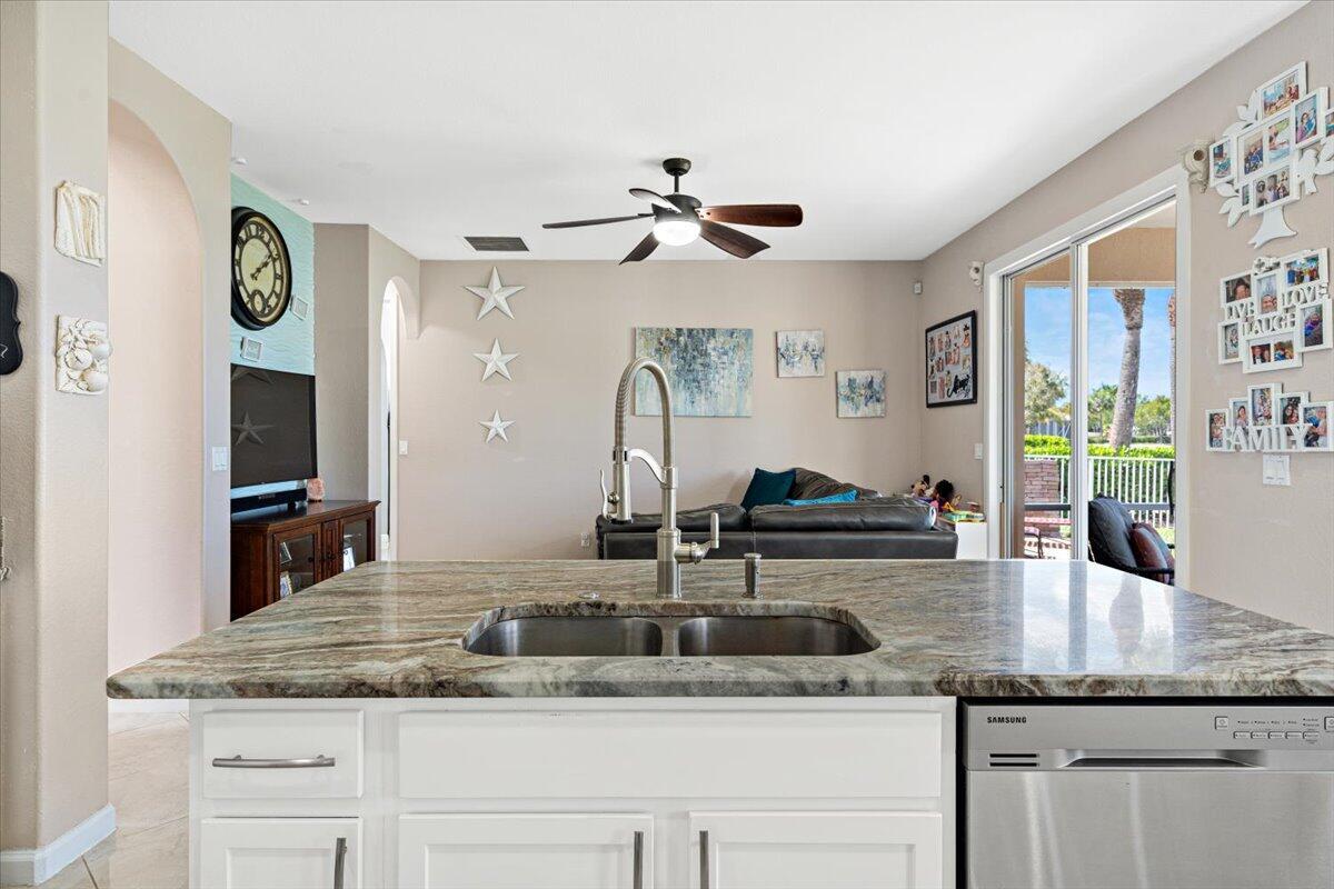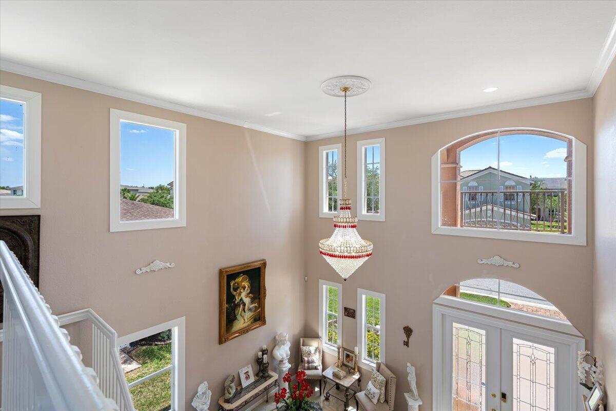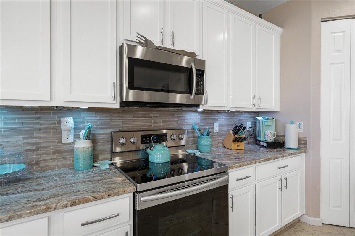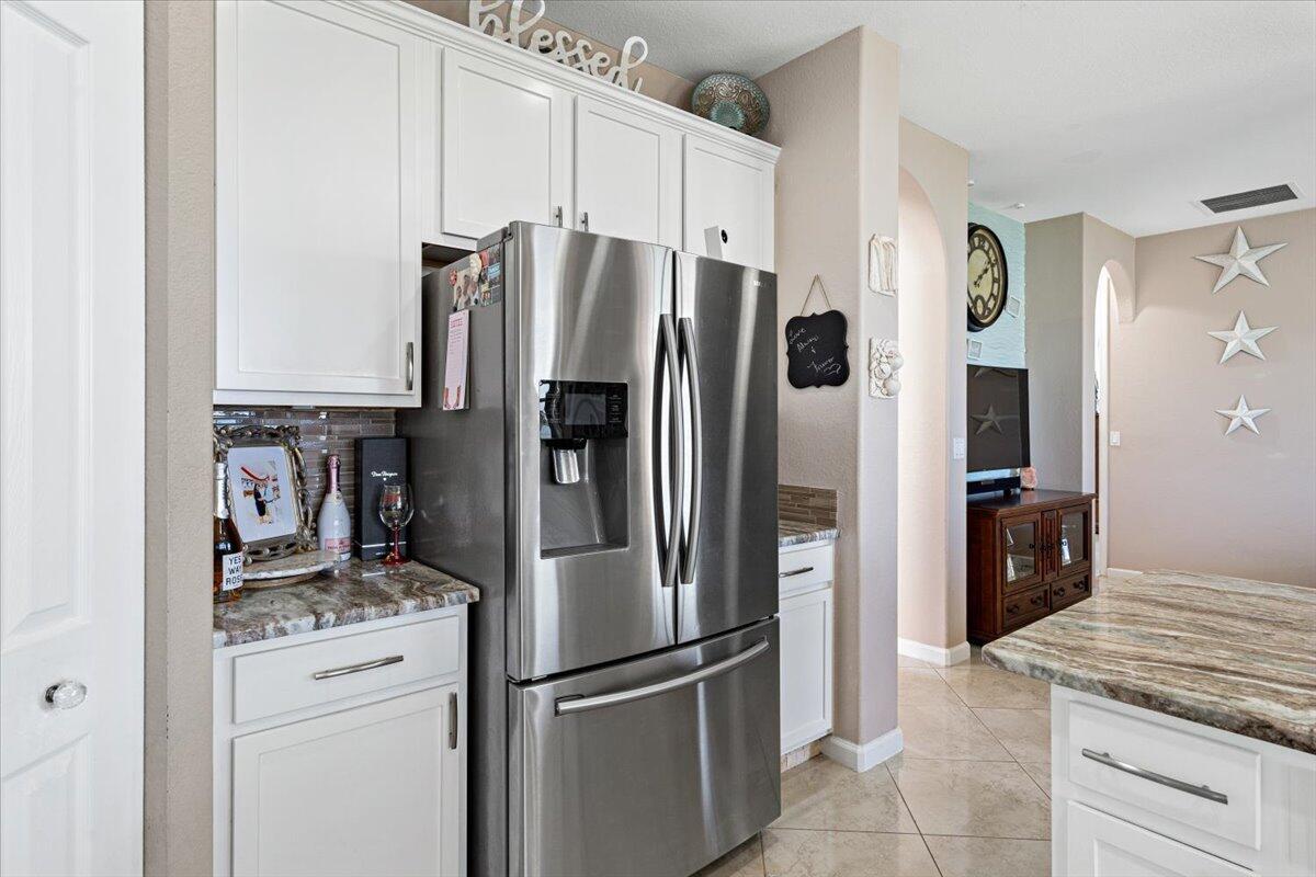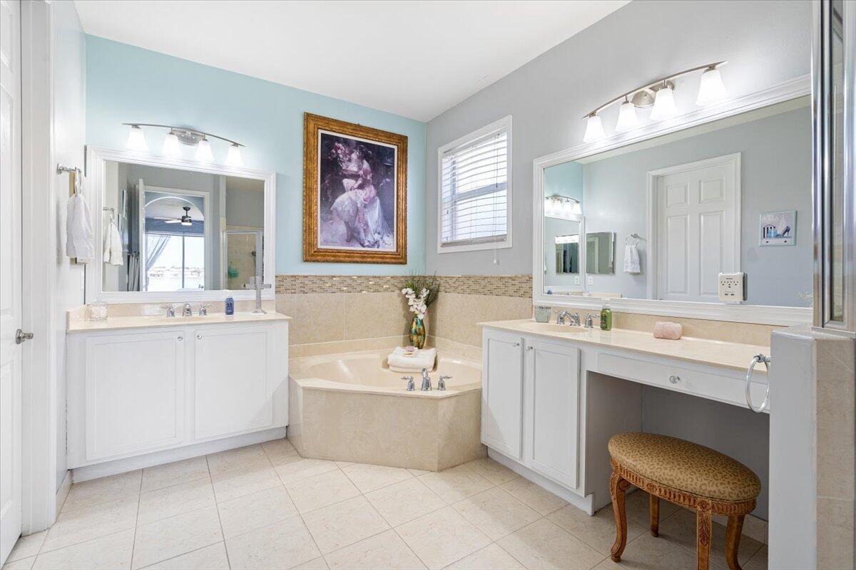 Live like you're on vacation in this stylish 4-bedroom, 2.5-bath home in coveted Vizcaya Falls, showcasing peaceful lake views and a smart, open layout. Solid CBS construction spans two stories with tile throughout the first floor, luxury vinyl on the stairs and upstairs commons, and soft carpet in the bedrooms. Soaring ceilings are elevated by upgraded crown molding, designer fixtures, and a statement chandelier. The upgraded kitchen shines with granite counters, a center island, and a sunny breakfast nook. Retreat to the first-floor primary suite with Roman tub, oversized shower, dual vanities, and a spacious walk-in closet. Recent updates include a 2024 washer & dryer, expanded three-car-width driveway, large entertaining patio, new impact-rated front door, and