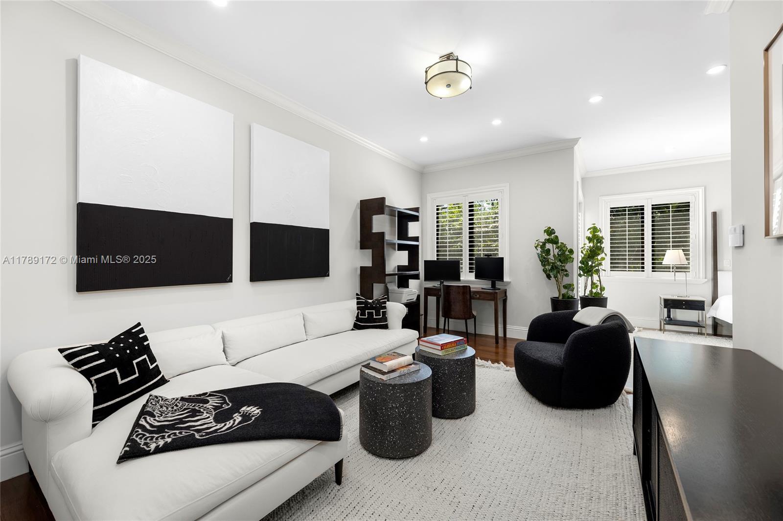 Located in a quiet, tree-lined neighborhood in north Coconut Grove, this elegant 2-story contemporary 5BR/5.5BA home sits on a gated, lushly landscaped 7,500SF lot. Home features 5,695 total SF, marble & rich hardwood floors, soaring ceilings, Sonos sound system & refined finishes. Ground floor offers a separate guest suite, large living & family rooms, formal dining room opens to courtyard w/fountain. Chef’s kitchen is equipped w/top-tier Viking & Sub-Zero appliances, granite countertops & breakfast area. Upstairs, a luxurious principal suite features dual walk-in closets, a spa-style bath & a private terrace overlooking the pool. The private backyard retreat boasts a pool, a covered terrace & lounge areas. Prime location-minutes to parks, marinas, shops/restaurants & top-rated schools.