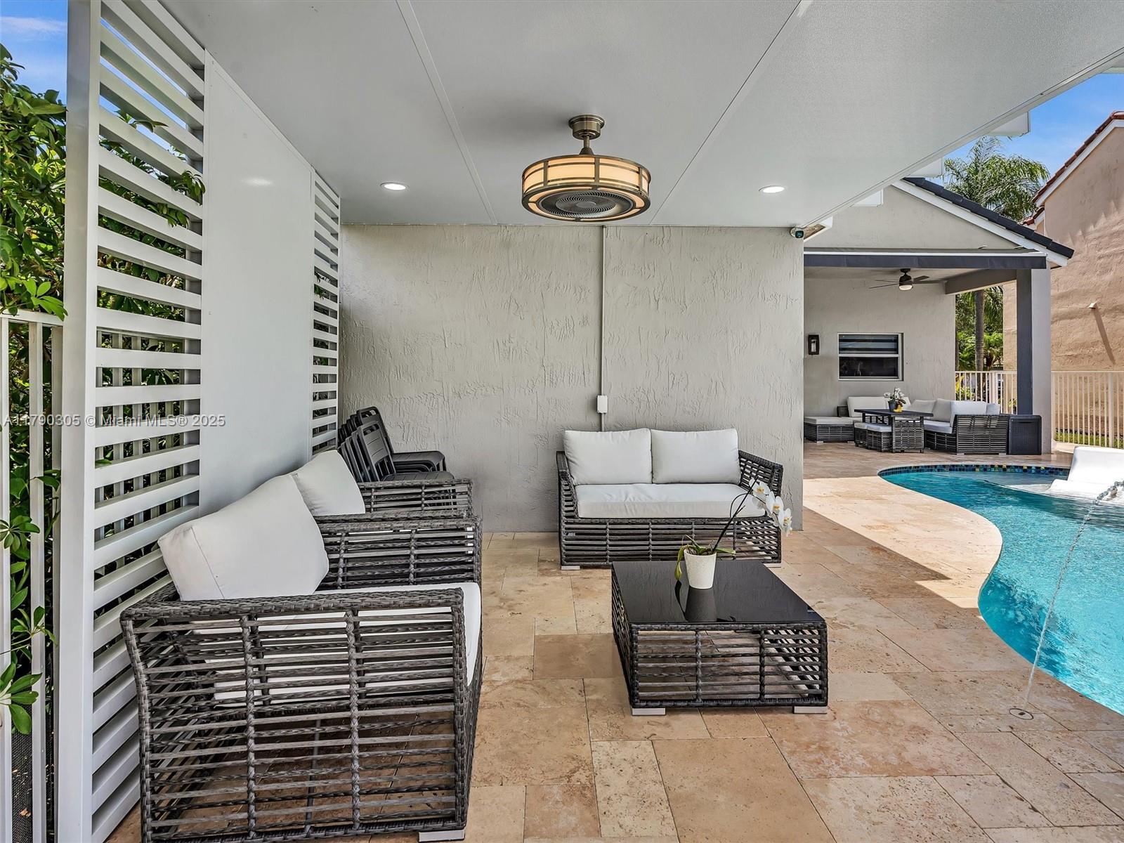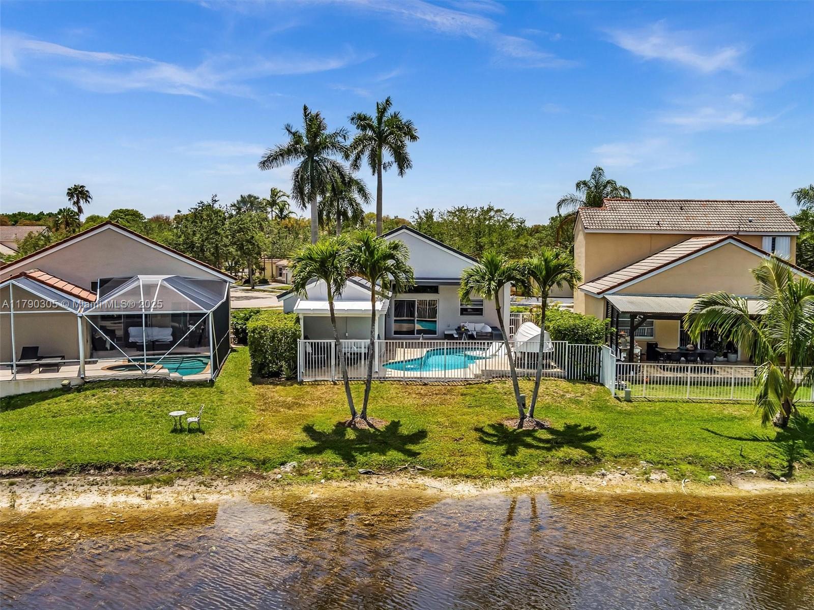 Stunning lakefront pool home in The Falls, Weston. Fully renovated & move-in ready! New 2025 roof, 2024 exterior paint, tile in living, luxury vinyl floor in bedrooms. Modern kitchen & baths with quartzite counters. Custom wall unit with electric fireplace. Saltwater pool with travertine deck, LED lights, and heater. Electric awnings, additional pergola, outdoor shower, aluminum fencing. 2023 Rheem A/C, zebra shades, electric rollers on sliders. Travertine paver driveway. Gated community with A+ schools. Easy to show!! Bring your buyers.