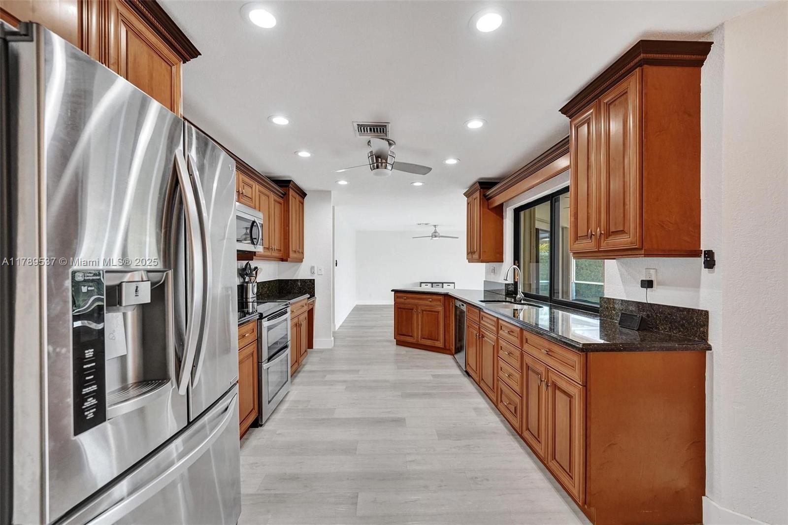 Fabulous opportunity at Oakwood! Spacious 4-bedroom, 2-bath one-story home with a fantastic layout and seamless sight lines throughout. Gorgeous updated bathrooms, Enjoy sunsets from your primary shower! Custom Thomasville kitchen cabinetry, stainless steel appliances, and built-in closet in the primary suite. Situated on an oversized fenced lot with privacy hedge, oversized pool, and complete backyard privacy. Covered screened patio, new bedroom doors, closet sliders, exterior fans, and full storm protection—impact windows, accordion shutters, and storm-rated garage door. Save with well water irrigation! The extra-long driveway fits multiple vehicles with ease. No HOA! Located on a quiet non-through street in a top-rated school zone, walking distance to Whole Foods, Coral Springs Mall +