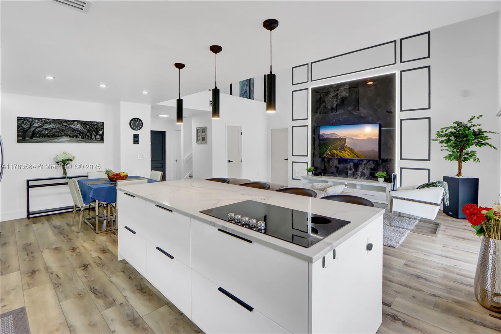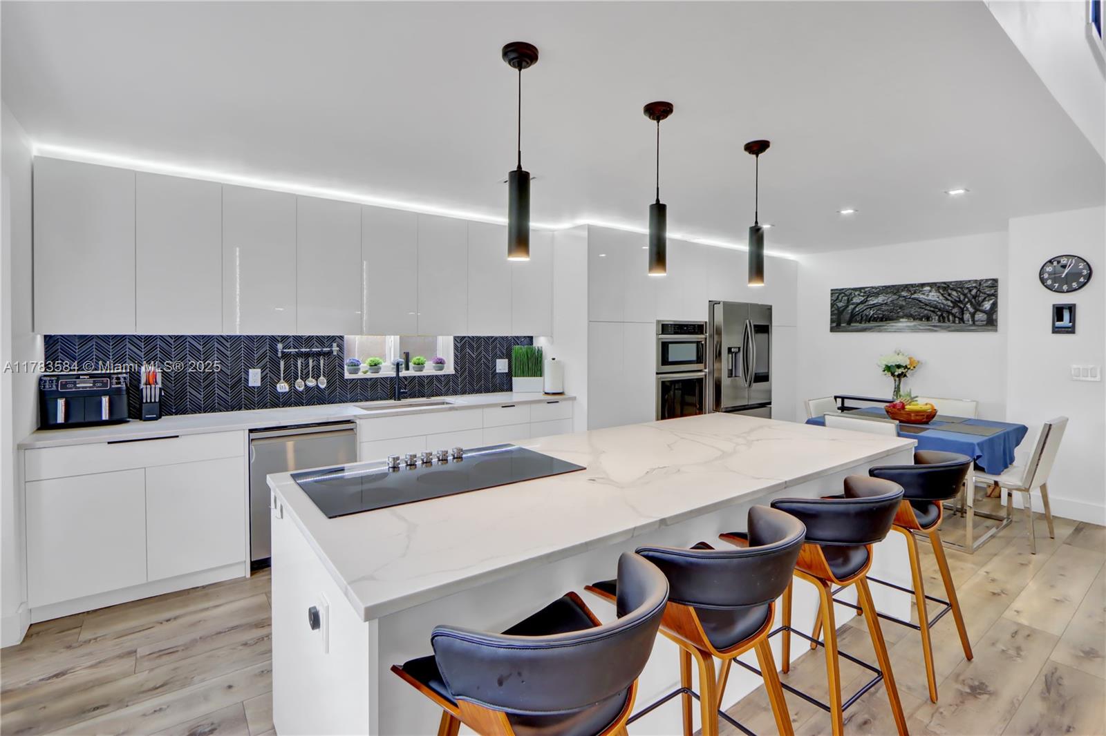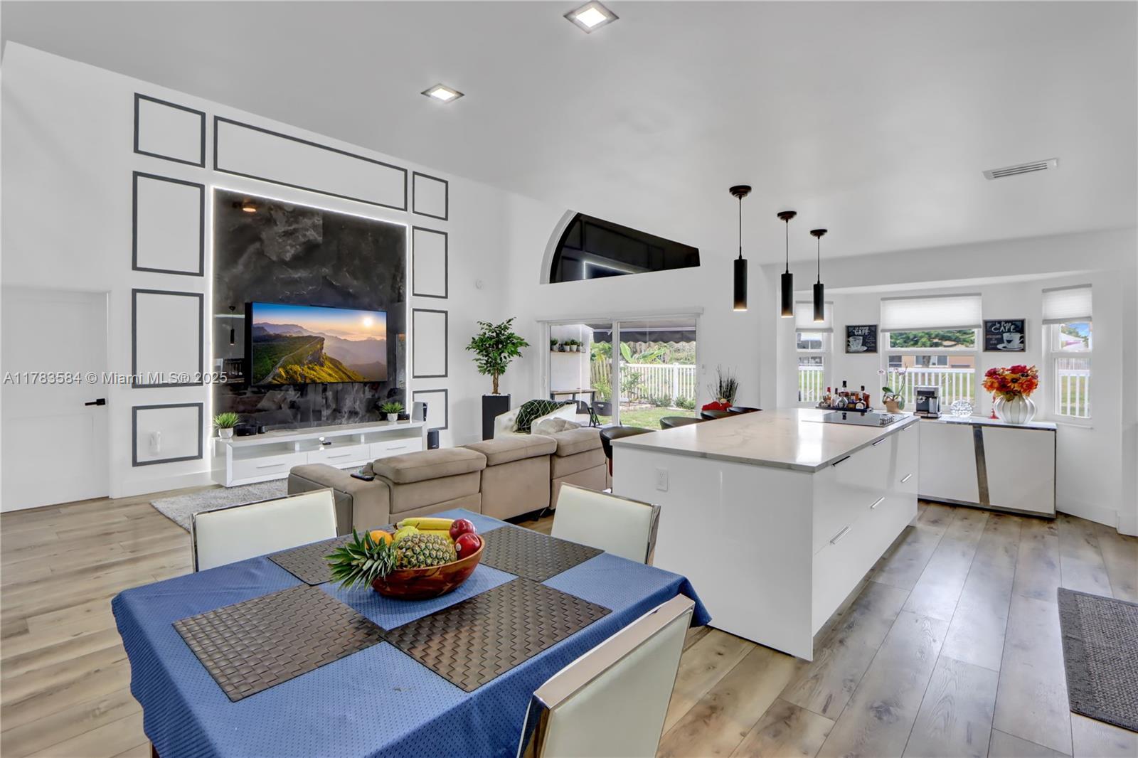 Beautifully updated home, move in ready, located in a gated community, features a freshly painted exterior. Step inside to an extended kitchen with custom Italian cabinetry, quartz countertops, a gorgeous backsplash, top of the line appliances and double wine cooler and rack. Laminate floors throughout, a sleek granite panel tv wall, modern ceiling fan, motorized blind, extra room used as an office. Gorgeous bathrooms, primary bedroom with custom made walk-in closet. Modern glass stair railings. Enjoy relaxing water view, lighted gazebo and water fountain. (Water filtering system and impact windows) over 110k in upgrades